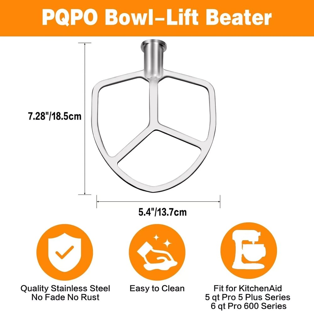 PQPO 6 Quart Stainless Steel Flat Beater - Compatible with KitchenAid KV25, KB25, KH25, KSM25, KD26, KH25, KT26, KJ26, KB26, KP26, KL26, Pro 600, KSM6583, KSM6585. Metal Attachments - Made of high quality 304 stainless steel, not easily damaged or discolored. No contamination of food. PQPO 6 Quart Stainless Steel Flat Beater - Stainless steel flat beater Compatible with kitchenAid stand mixers. Great kitchen aid mixer attachment Easy to Clean - The 6 Quart Stainless Steel Beater is also dishwasher safe or hand washable in warm water for easy cleaning.