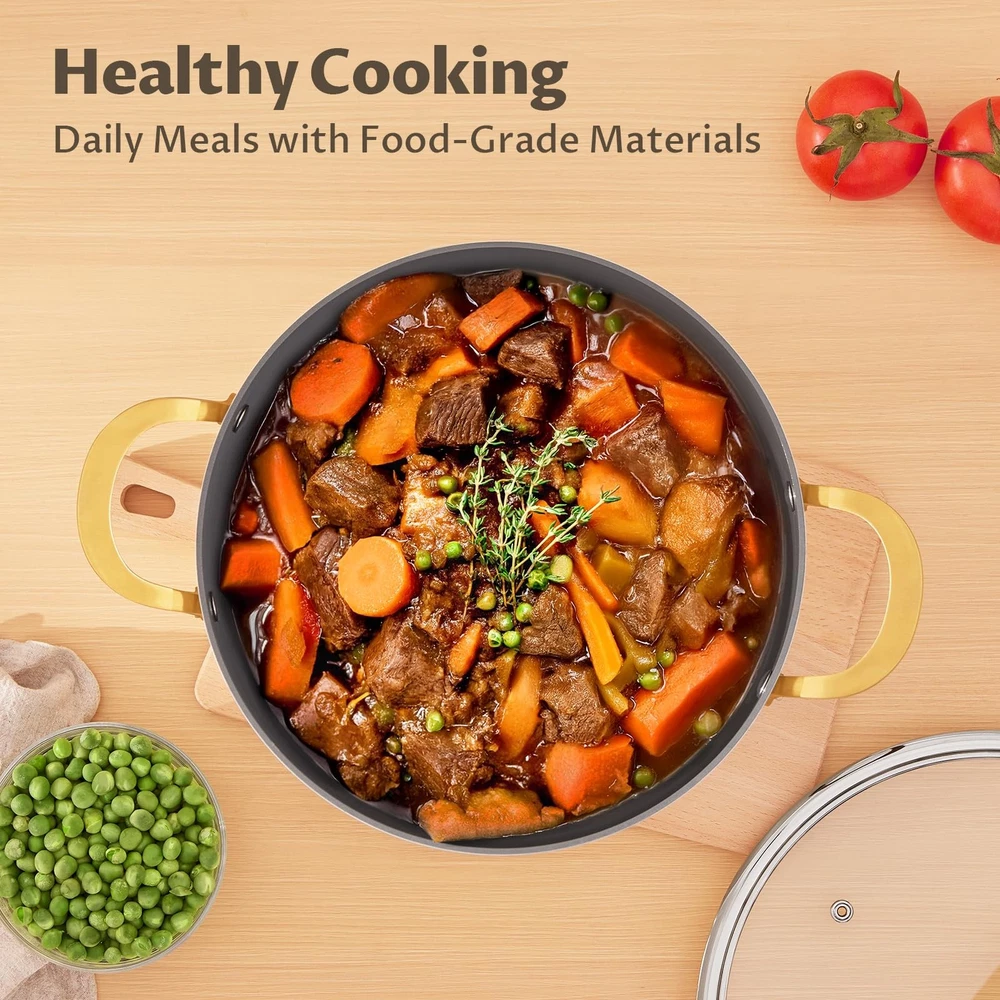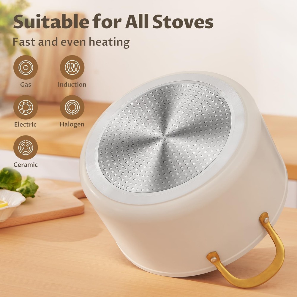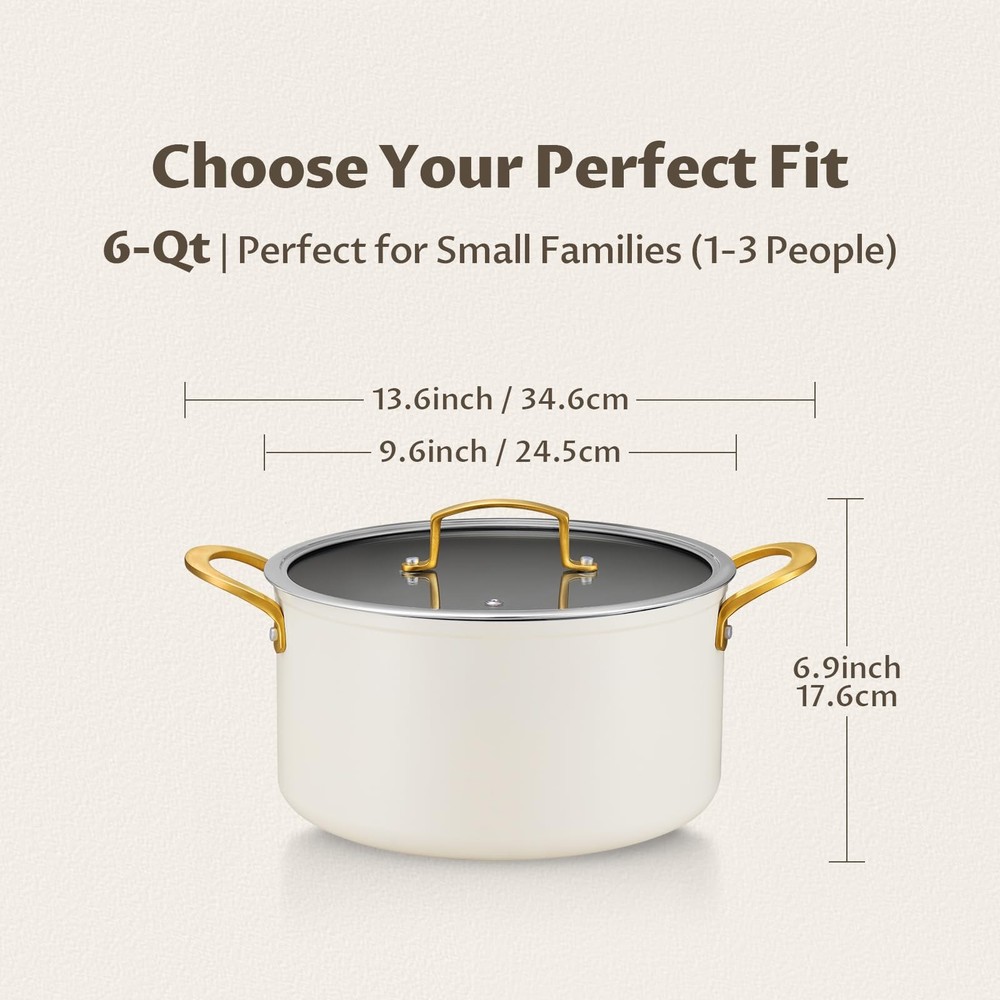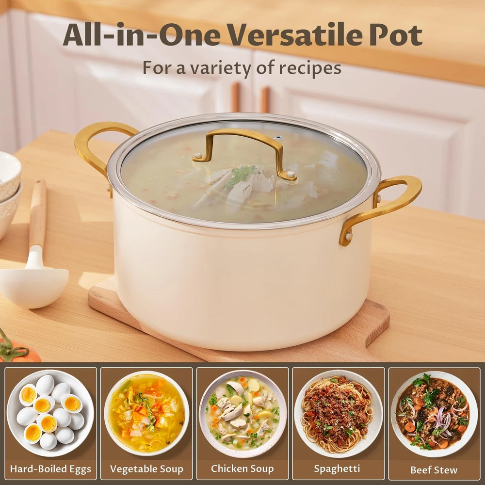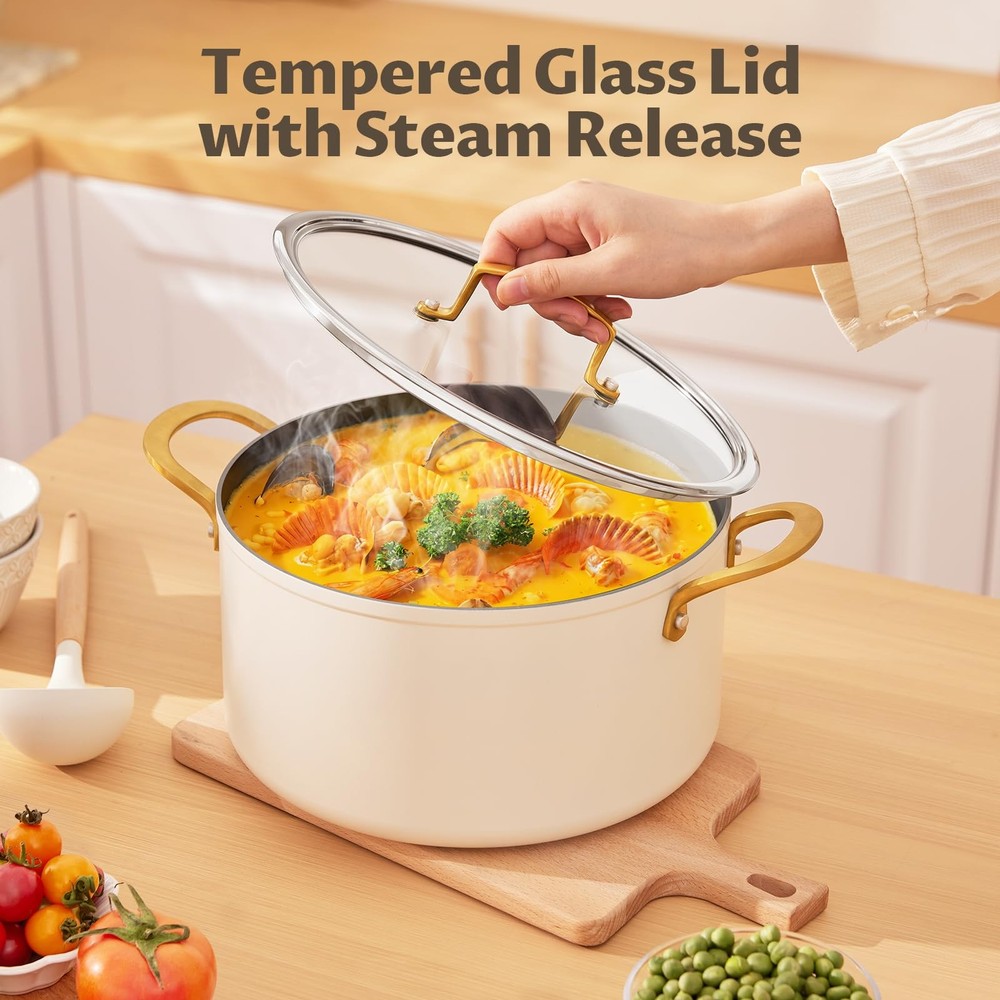 6 Quart Stock Pot with Lid๏ผCeramic Nonstick Cooking Pot๏ผNon Toxic Soup Pot with Lid, Stockpot with Stainless Steel Handle, Tempered Glass Lid, Induction Compatible for Pasta, Soup, Spaghetti๏ผDishwasher Safe, Cream ใ๐๐ฎ๐ฅ๐ญ๐ข๐ฉ๐ฅ๐ ๐๐ข๐ณ๐ ๐๐ฉ๐ญ๐ข๐จ๐ง๐ฌใ Ceramic Non-Stick Stock Pot are available in 6QT (1-3 persons), 8QT (3-5 persons), 10QT (5-8 persons) and 12QT (8+ persons). Ceramic stock pot with lid is practical cookware for your kitchen and make great gifts for friends and family on birthdays, housewarming, Thanksgiving or other holidays ใ๐๐๐๐ฅ๐ญ๐ก๐ฒ & ๐๐จ๐ง-๐๐จ๐ฑ๐ข๐ ๐๐จ๐จ๐ค๐ข๐ง๐ ใ Natural ceramic coating, free of PTFE, PFAS, PFOA, lead and cadmium, without the risk of precipitation of toxic substances, high temperature cooking is also stable, giving the whole family a healthy and environmentally friendly experience ใ๐๐๐๐ข๐๐ข๐๐ง๐ญ ๐๐๐๐ญ๐ข๐ง๐ , ๐๐ง๐๐ซ๐ ๐ฒ ๐๐๐ฏ๐ข๐ง๐ ใ Aluminum core has excellent heat conduction, and with the triple-layer pan bottom, the heat conduction is 35% more even. Cooking saves more time and up to 45% energy consumption, allowing you to enjoy delicious food faster ใ๐๐จ๐ง ๐ฌ๐ญ๐ข๐๐ค, ๐๐๐ฌ๐ฒ ๐ญ๐จ ๐๐ฅ๐๐๐งใ High-quality non-stick coating prevents food from sticking. Non-stick bottom, a wipe clean after meals, even a novice can easily handle, to create a smoke-free kitchen. It reduces the amount of oil used by 90% and is durable and long-lasting ใ๐๐ซ๐๐๐ญ๐ข๐๐๐ฅ ๐๐๐ฌ๐ข๐ ๐ง ๐๐จ๐ซ ๐๐จ๐ฆ๐๐จ๐ซ๐ญ๐๐๐ฅ๐ ๐๐จ๐จ๐ค๐ข๐ง๐ ใ Tempered glass lid is heat and impact resistant, transparent and visible, no need to lift the lid to accurately grasp the heat. Stainless steel handle, comfortable to hold and anti-scald, safer cooking operation ใ๐๐ฎ๐ฅ๐ญ๐ข-๐๐ฎ๐ซ๐ฉ๐จ๐ฌ๐ ๐๐จ๐จ๐ค๐ข๐ง๐ ใ Innovative magnetized base conducts heat well, this stockpot is designed to meet a variety of cooking needs, and is suitable for use on all stovetops, such as gas, electric, induction, and so on. Perfect for making sauces, pasta, stews and more