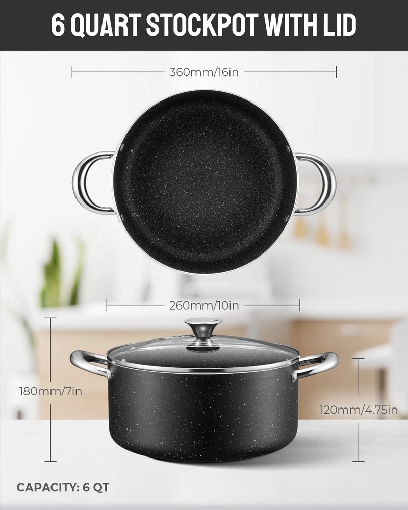 Healthy and Non-Toxic: The 6-quart cooking pot with lid has a healthy granite coating that is free of PFOS, PFOA etc, allowing you to enjoy delicious and nutritious meals with peace of mind. Easy to Clean: The rough granite non-stick coating prevents food and sticky sauces from sticking and burning to the stock pot, making cleaning a breeze. Efficient Heating: The aluminum body structure of this soup pot ensures efficient heat distribution, resulting in fast and even cooking throughout the soup pot, saving you time in the kitchen. Compatible with All Stove Types: Including gas, electric, halogen, ceramic, and induction cookers, this induction pot provides flexibility for any kitchen setting. Oven Safe: The 6 quart pot is oven safe up to 450°F, but the lid should not be placed in the oven. When using the big pot at high temperatures, be sure to wear oven gloves to avoid burns. Shatterproof Glass Lid: The perforated design allows excess water vapor to escape, retaining the original flavor of the food and allowing you to monitor the cooking status at any time. Multiple Cooking Methods: The non-stick pot with lid is an essential piece of cookware in the kitchen, enabling you to easily cook a variety of dishes, including curry, pasta, vegetables etc. at home.