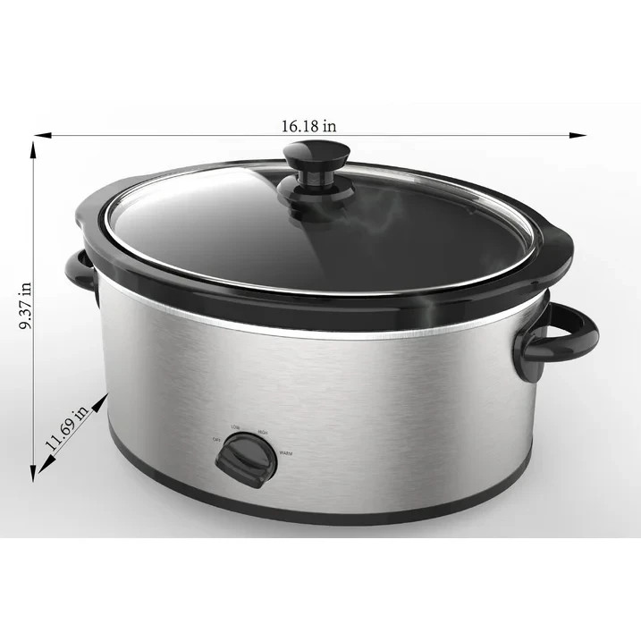 Product details The Mainstays 6 Quart Slow Cooker in stainless steel is the perfect kitchen appliance for those who enjoy delicious, homemade meals with minimal effort. With its large 6 quart volume capacity, this slow cooker is perfect for families or for meal prep, allowing you to cook large portions of your favorite recipes and save time in the kitchen. The stainless steel exterior of the slow cooker is not only durable and long-lasting, but also stylish and modern, making it a great addition to any kitchen. Three temperature settings - low, high and warm - allows you to customize your cooking to suit your needs. Low setting is perfect for slow-cooking meats and stews, while the high setting is ideal for cooking soups and chili. The warm setting is great for keeping your food at the perfect temperature until you're ready to eat. The Mainstays 6 qt. Slow Cooker also features a glass lid that seals in moisture and flavor, and the cool-touch handle, making it easy to open and close the slow cooker. Purchase a new Mainstays 6 Quart Slow Cooker in stainless steel and start cooking delicious, homemade meals today. MODEL# MS54100112168S Six (6) quart volume capacity for cooking large portions Removable stoneware 6 qt. crock for easy cleaning Makes delicious, homemade meals with minimal effort Perfect for slow-cooking meats, stews, soups, and chili Cool-touch lid handle for safe and easy use Tempered glass lid to retain moisture and flavor Fits a 6 lb chicken or 4 lb roast Three temperature settings - low, high, and warm - for customized cooking Rated: 210 Watts Condition: New Model Number: MS54100112168S