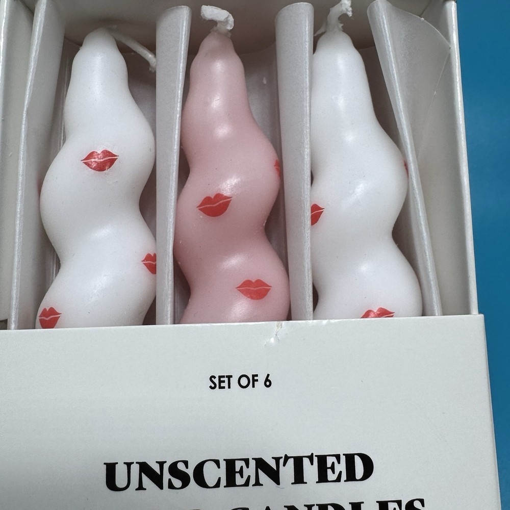 Country/Region of Manufacture: Vietnam Type: Wavy Taper Candle Shape: Twist, Wavy Personalize: No gtin13: Does not apply Number in Pack: 6 Features: Decorative, Non-Toxic, Unscented, Limited Edition, Red Lip Design Material: Palm Wax, Paraffin Wax Power Source: Fire MPN: 24279 Brand: Home Essentials Scent: Unscented Burning Time: 21 Hours Room: Bathroom, Bedroom, Dining Room, Entryway, Foyer, Guestroom, Indoor, Kitchen, Living Room, Lounge, Outdoor, Porch, Sunroom, Terrace, Utility/Laundry Room UPC: Does not apply Item Height: 7 in Color: Pink And White With Red Lips Painted On Them Handmade: No Customized: No Theme: Holiday, Love & Hearts, Romantic, Seasonal Style: Romanticism Size: 7 in