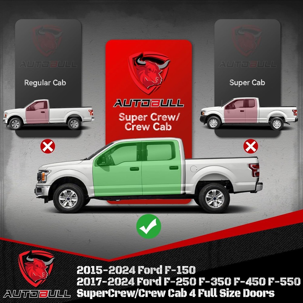 6" Running Boards For 2015-2026 Ford F150 Super Crew Cab Side Step Bar Black Note:Professional installation would be highly recommended. Specification: - Color: Black - Material: Built From Durable, Rust-Resistant, Aluminum - ABS Plastic Covered Slip-Resistant Step Pads - ABS Plastic End Caps Fitment: -for 2015-2026 Ford F-150 Super Duty SuperCrew/Crew Cab 4 Full Size Doors -for 2017-2026 Ford F250 F350 F450 F550 Super Duty SuperCrew/Crew Cab 4 Full Size Doors Features: - 6 inches wide running boards give your ride a massive boost when it comes to look and utility. - Running boards can prevent slipping and withstand the toughest weather conditions. - Aluminum material, which is sturdy, durable, wear-resistant and rust-resistant. - Easy bolt-on installation & No drilling or cutting Required. - High strength mounting bracket; holds up to 450 lbs. - Professional installation is highly recommended. Package included: - 2x (Driver side & Passenger) side steps bars - Mounting brackets and hardware - Installation instruction Payment Shipping Warranty About us Contact us Payment We accept PayPal payment and so on. Payment should be completed within 4 (Four) days of auction closing. Or unpaid dispute will be filed for closing auction. We will leave a positive feedback immediately after payment is received. We appreciate a positive feedback as much as you do. If for some reason there is any issue with the purchase, please contact us prior to leaving feedback, we will be glad to work together and provide a satisfying solution. Shipping Please be aware that PO Box cannot receive items,please DO NOT fill in the PO Box address. DELIVERY DAYS: 3-7 BUSINESS DAYS 3 BUSINESS DAYS SHIPPING OUT SHIP FROM CA & TX & NJ & GA & NC &OR WAREHOUSE California Warehouse: City of Industry, CA Texas Warehouse: Houston, TX New Jersey Warehouse: Perth Amboy, NJ New York State Warehouse: Perth Amboy, NJ Georgia Warehouse: Austell,GA North Carolina Warehouse: Grove NC Oregon Warehouse: AIRPORT WAY Portland,OR Warranty This item comes with 12 months Warranty from the date of customers purchased it. Special circumstances will be listed clearly in the listing. If your item has been damaged in transit or become faulty in warranty period, please email us with pictures or video to show the problem. Please do check everything carefully after you received the parcel, any the damage except DOA (Dead-On-Arrival) would not be covered if it's your fault. Replacement products are provided with the same warranty as the returned products. About us Welcome to our eBay store. As a leading and emerging company in manufacturer and exporting business, we are specialized in Business and Industrial Products, Auto parts products, Home and Garden products for more than 10 years. We believe that it is our vision and mission to provide innovative products with best service and competitive price to satisfy you. Our goal is to make sure that you can find exactly what you are looking for and make it easy for you to place your orders. Contact us Email Customer Support: 9:00am-2:00am PST Sunday-Friday All emails will be responded to within 12-24 hours