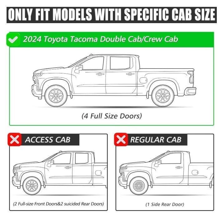 6" Running Boards for Toyota Tacoma Double Cab 2024 2025 Side Steps 2pcs... Brand-new high-quality product. Brand-new packaging. Never used before. A product composed of high-quality aluminum alloy and ABS plastic parts. Installed with the original vehicle screw holes. No need to drill holes for installation. Included installation manual. Only suitable for the brand-new 2024 and 2025 model years of Toyota Tacoma dual cab 4-door vehicles. Not suitable for 2-door pickup truck models. Product width: 6 inches. The product can support: 600lbs (272kg) Included with the necessary screws and mounting brackets for installation. Package list: 2 pedals (left and right) + 8 fixing brackets and screws. Shipping: We will ship the package within 1 day after receiving the payment. Using FedEx for shipping. Generally, it takes 5-8 working days to arrive. The package is from the warehouse in the United States.