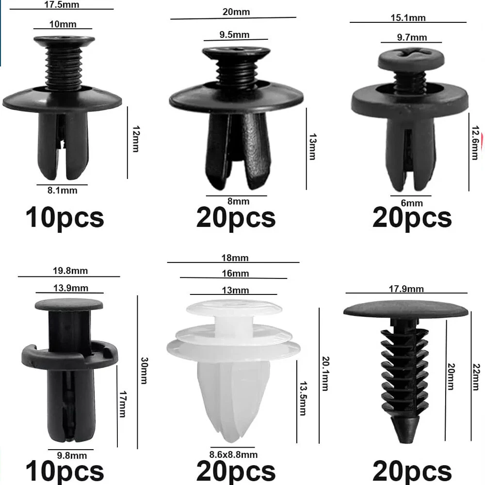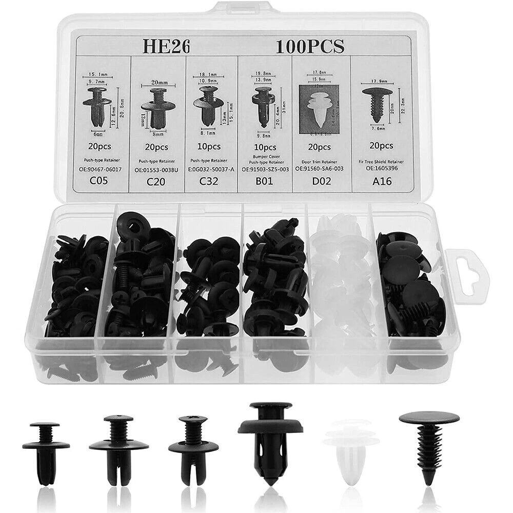 Features High quality material Bumper clips are made of high-quality Black nylon Material, anti-wear and anti-corrosion, would not break or crack easily during use. It can allow you to quickly and easily remove car door panel without any damage to them. Easily access into confined areas. 100PCS 6 Different Sizes Fasteners clips hole sizes for the OEM replacement of Ford, GM, Chrysler, Toyota, etc. But it means not only use for these car, this kit can also meet your other needs as well. Fit Most Cars Universal for most of car models, such as Audi, BMW, Cadillac, Chevrolet, Daewoo, Daihatsu, Dodge, DMC, Ford, General Motors, GMC, Honda, Hyundai, Jeep, Kia, Mazda, Mercedes, Mini, Mitsubishi, Renault, Rover, Saab, SEAT, Skoda, Subaru, Tesla, Toyota. Most Convenient and Space Saving Comes with a plastic box of each separate storage. Compact size, light weight were good for the cars. Allows to freely DIY your vehicle accessories at anytime you wanted. It is definitely cheaper than going to the auto parts store. Widely Application These push clips are widely used for trim panel clips, door trim clips, door Panel clips, bumper clips, fender clips, engine cover and splash shield retainers replacement. It always covers some applications include telecom equipment, motor vehicles, domestic appliances, furniture and electrical equipment. Specification Retainer Clips Material: Nylon Color: C05: 20pcs Black C20: 20pcs Black C32: 10pcs Black B01: 10pcs Black D02: 20pcs White A16: 20pcs Black Fastener Removers Color: Yellow Size: 5.5" x0.78", 6.3"x0.85",7.3"x0.85", 8.7"x0.8"(LxW) Screwdriver Color: Red Size: 12.4" Clip of C05 Screw Type Clip Retainer Rivet Size Approx: Head Diameter: 15mm Stem Length: 12mm Fits Into 6mm Hole For GM Replace 20426301 For Mazda Replace 9926-50-625 For Toyota Replace 90467-06017 For Toyota Replace 90467-06017-20 For Toyota Replace 90467-06017-41 For Auveco A14260 Clip of C20 Fender Liner Clip Splash Shield Blind Rivet Fits For Mazda Replace FB01-56-964 Fits For Honda Replace 90675-SB3-003 Fits For Nissan Replace 63876-95596 Fits For B16 B18 B18C B20 H22A EK9 EG6 Fits For Accord Civic Prelude CR-V Del Sol CRX Fits For INTEGRA GSR S2000 AP1 MUGEN Fits For TYPE R Si Size Approx: Head Diameter: 20.6mm (0.81") Stem Length: 9.5mm (0.37") Fits Into 8mm (0.32") Hole For Auveco A16000 Clip of C32 Push-Type Retainer Head Diameter: 20mm Stem Length: 13mm Fits Into 8mm Hole Fits For Mazda 6 2002-2006 Fits For Mazda 323 1998-2003 Fits For Ford Aspire Fits For Mazda Replace B092-51-833 Fits For Ford Replace MB-455-56143 Fits For Kia Replace MB455-56-143 Fits For Nissan Replace 09409-09302 Fits For Hyundai Replace 86590-28000 For Auveco A17632 Clip of B01 Front & Rear Bumper Retainer Push Type Clip Head Diameter: 20mm Stem Length: 18mm Fits Hole Size: 10mm For Honda Replace 91503-SZ5-003 (1996-On) For Acura Replace 91503-SZ5-003 For Auveco A20564 For PAS9282, PAS938 Clip of D02 Interior Trim Board Retainer Clip Top Head Diameter: 13mm Middle Head Diameter: 16mm Bottom Head Diameter: 18mm Stem Length: 15mm Stem Diameter: 8.5mm x 8.5mm Overall Length: 20mm Fits For GM Replaces 94858299 Fits For Geo Prizm 1998-On Fits For Pontiac Vibe 1998-On Fits For Toyota Replaces 90467-10161 Fits For Sienna, Solara & Tercel 1990-On Fits For Previa 2007-On, Corolla 2003-On Fits For Lexus LS460, LS460L 1990-On For Auveco A18876 Clip of A16 Radiator Yoke, Fender & Bumper Shield Retainer Christmas Tree Type Clip Head Diameter: 17.8mm Stem Length: 20mm Stem Diameter: 7.6mm For GM Replaces 1595864, 1605396 For Ford Replaces 388577S For Ford Replaces W705589-S300 For Chrysler Replaces 6030441 For Auveco A11146, A15414 Package included 100pcs Retainer Clips 4 x Fastener Removers 1 x Red screwdriver