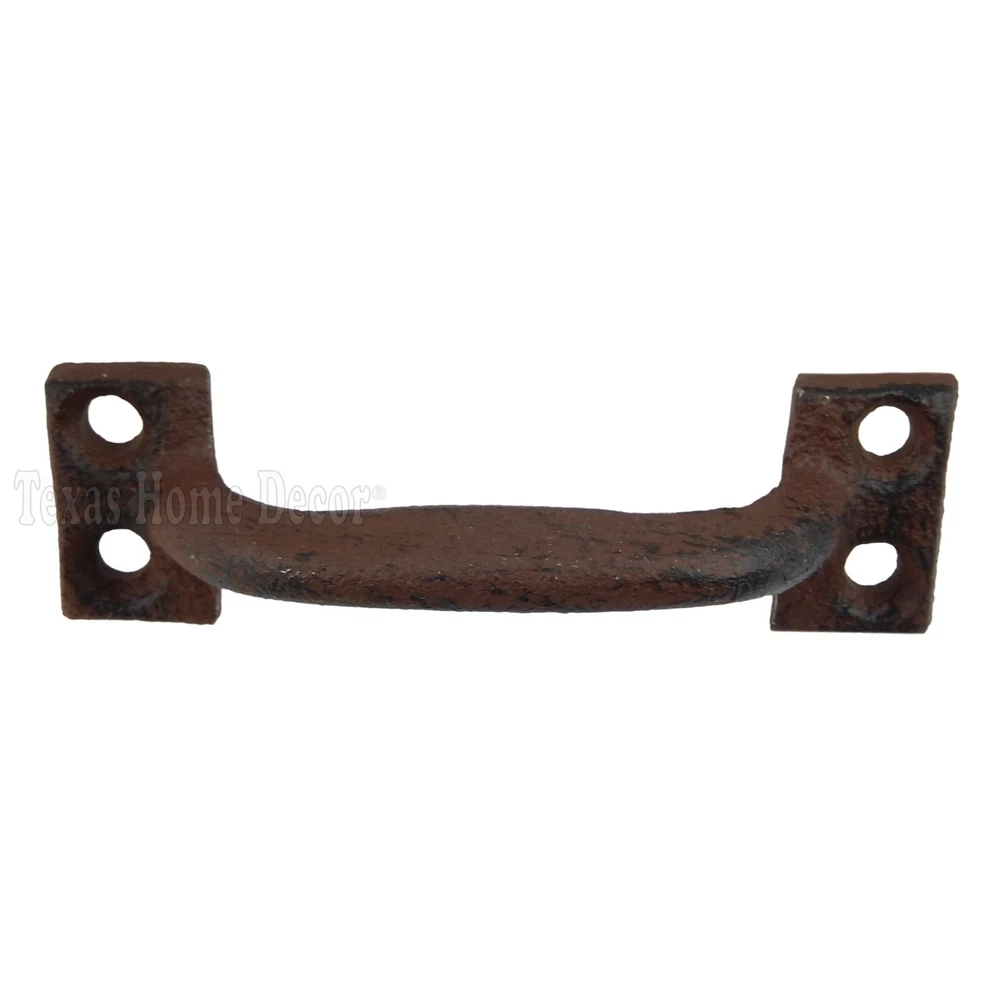 6 Small Antique Style 3 5/8" Door Handles #0016 Lot of 6 new handles Made of cast iron with a rustic brown finish Measures 3 5/8 inches in total length by 1 1/8 inch wide at the base Each handle comes with 4 mounting holes Mounting screws are 3 inches apart Has a finger space of 3/4 inches Great for rustic cabinetry or drawers Screws not included