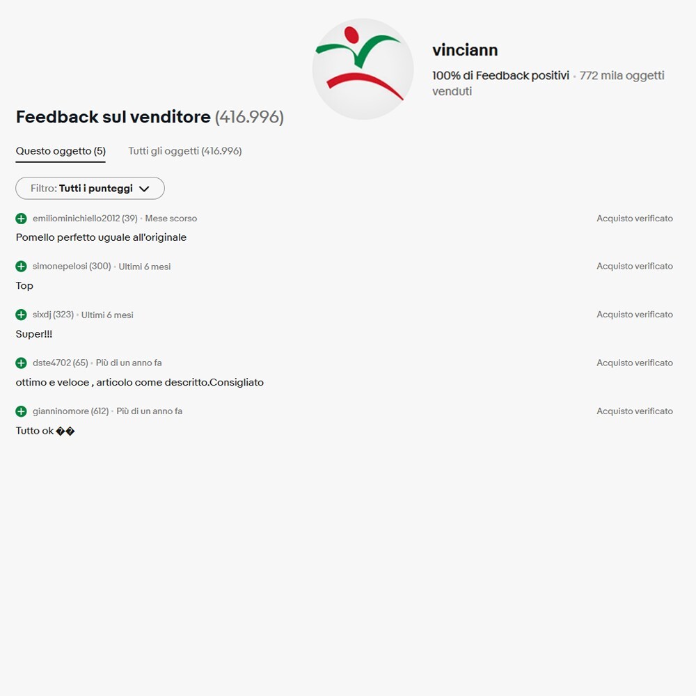 Vinciann Negozio Altre strepitose occasioni (clicca sull'immagine) Spedizioni Rapide Le spedizioni sono molto rapide. Spedisco sempre entro 24 ore dalla ricezione del pagamento. Spesso entro poche ore. Aggiungimi ai venditori preferiti Descrizione Pagamenti Spedizione Le mie aste Pomello leva cambio 6 marce per AUDI A4 S4 B8 A5 8T 07-15 con cuffia Descrizione prodotto: Pomello di ricambio compatibile con Audi A4 S4 B8 e Audi A5 8T , progettato per sostituire perfettamente il vecchio pomello della leva del cambio manuale a 6 marce . Unisce design elegante e materiali di qualità , migliorando l’estetica dell’abitacolo con un tocco sportivo e moderno. Compatibilità: ✔ Audi A4 B8 (2007 – 2015) ✔ Audi A5 8T (2007 – 2016) Caratteristiche tecniche: Cambio: manuale a 6 marce Con cuffia in pelle sintetica inclusa Colore: Nero / Argento Materiali: Plastica ABS , metallo , pelle sintetica Diametro foro interno pomello: 11 mm Installazione semplice e veloce ( plug & play ) Prodotto aftermarket non originale , ma di ottima qualità Condizione e spedizione: 📦 Prodotto nuovo , in magazzino 🚚 Spedizione immediata e tracciabile dall’Italia con Corriere Espresso 🔍 Nota per l'acquirente: Prima dell’acquisto, confronta forma e dimensioni del tuo vecchio pomello con quelle mostrate nelle foto dell’inserzione , per assicurarti della compatibilità. Spedizioni sicure ed assicurate È un prodotto nuovo , disponibile in magazzino (in Italia) e pronto per la spedizione immediata, tracciabile . Il servizio di spedizione che vi offriamo è sicuro, garantito e - ribadiamo - tracciabile, a differenza di Posta Prioritaria, servizio tanto economico quanto inaffidabile circa la consegna dei prodotti. Con noi potete rilassarvi! Le nostre spedizioni sono tutte assicurate fino all'intera spesa effettuata. In caso di incidenti riceverete un rimborso completo o procederemo ad una nuova spedizione. Contatti Per qualsiasi dubbio o domanda su questo ordine non esitare a contattarmi ed a chiedere ulteriori spiegazioni.