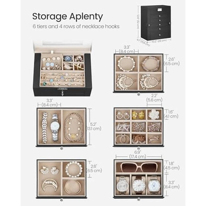 You may also like Devils Claw Plus Powder Joint Supplement Horses 5lb Antioxidants Mobility New 90.86 USD 95.64 USD Free shipping 5% off Adjustable Pedestal Fan W/ Remote Timer Oscillation Bedroom Living Room New 38.93 USD 40.98 USD Free shipping 5% off Foam Toolbox Liner Drawer Mat No Slip Soundproof Shock Absorbing 24 Ft Long New 48.63 USD 51.19 USD Free shipping 5% off Duramectin Wormer Horses 18Pack Paste 1.87%. Each 0.21-Oz Tube One 1250-lb Horse 194.76 USD 205.01 USD Free shipping 5% off Storage Cabinet 3 Doors Organizational Furniture Home Office Living Room Black 72.05 USD 75.84 USD Free shipping 5% off Sturdy Modern Computer Workstation Easy Assembly Steel Frame Office Desk New 85.69 USD 122.18 USD Free shipping 30% off 8-Pack WPC Acoustic Slat Panels Easy Install Soundproof Wall Decor Interiors New 234.64 USD 246.99 USD Free shipping 5% off Double Sided 4x6 in Picture Frames Bulk Tabletop Display Photo Holders 20 Pack 42.47 USD 44.71 USD Free shipping 5% off Compact Electric Circular Saw 4.5 Inch Depth Gauge Lightweight Powerful Tool New 100.54 USD 105.83 USD Free shipping 5% off Direct Drive Bench Belt Sander 4x36 Disc Sander 3/4HP Woodworking Tool 120V New 218.41 USD Free shipping Portable Adjustable Miter Saw Stand Gravity Rise System 18ft Capacity Wheels New 406.51 USD Free shipping 5-10 Gallon Aquarium Stand Metal Storage W/Plant Shelf Adjustable Feet Fish Tank 82.12 USD 86.44 USD Free shipping 5% off About this item [6 Tiers, Spacious] This 6-tier jewelry box boasts multiple layers with different compartments and layouts to keep all your jewelry, like stud earrings and rings, sorted and organized; the deep bottom drawer fits 3 watches and a pair of sunglasses [4 Rows of Necklace Hooks] This jewelry case comes with 4 rows of hooks that feature an ideal height so all your necklaces, even the longer ones, can hang up here perfectly without getting tangled [With Inner Mirror and Lock] The jewelry organizer has a mirror inside that allows you to do your makeup and check your look easily, saving precious morning time; it has a lock with 2 keys to keep your valuables away from naughty kids [Crafted to Last] Thanks to select PU, sturdy MDF, soft velvet lining, and neat stitching, this lockable jewelry case stands out for its quality and durability—it’ll keep you company for many years to come [Fancy Gift Idea] Gift this well-crafted, stylish jewelry holder with mirror to loved ones for their birthday or anniversary to surprise them! Or, treat yourself to this charming jewelry box—you deserve it! › product details Color Black Brand SONGMICS Material PU (Polyurethane), MDF (Medium Density Fiberboard), Velvet Style Elegant Special Feature Jewelry Organizer,Sturdy Recommended Uses For Product Jewelry, Watches Product Dimensions 6. 1"D x 10. 2"W x 12. 6"H See more You may also like Indoor 12AWG NMB Cable 100ft SIMpull Copper Wire Residential Electrical Wiring 95.01 USD Free shipping Portable Propane Water Heater Shower Pump Compact Camping Cleaning System New 282.14 USD Free shipping 30 Piece Hex Torx P-Handle Driver Set Gunsmithing Maintenance Tool Kit Steel New 59.35 USD Free shipping Table Saw Precision Adjustable Blade Extendable Low Noise Motor Model Building 375.76 USD 395.54 USD Free shipping 5% off 10/2 NMB Cable 50 ft Indoor SIMpull Copper Wire Electrical Installation Orange 95.07 USD Free shipping Portable Folding Workbench W/ 12 Inch Clamps DIY Projects Heavy DutyUse Garage 130.03 USD Free shipping Portable Propane Powered Water Heater Shower Pump Outdoor Camping System Black 365.74 USD Free shipping Deluxe Heavy Duty Steel Hunting Blind 360 View 3-Person Shooting Windows Outdoor 223.35 USD 235.11 USD Free shipping 5% off High Performance Game Feeder Digital Timer 225 lb Capacity Tripod Hunting New 121.03 USD Free shipping 15ft Trampoline Basketball Hoop Accessory Easy Setup 2 Foam Balls Safe Design US 72.37 USD 76.18 USD Free shipping 5% off Feeder Kit Digital Timer Quick-Lock Varmint Guard Hunting Tool 360 Coverage New 53.27 USD Free shipping Plastic Tool Box W/ Drawers Stackable Organizer Heavy-Duty Storage System New 41.62 USD 43.81 USD Free shipping 5% off