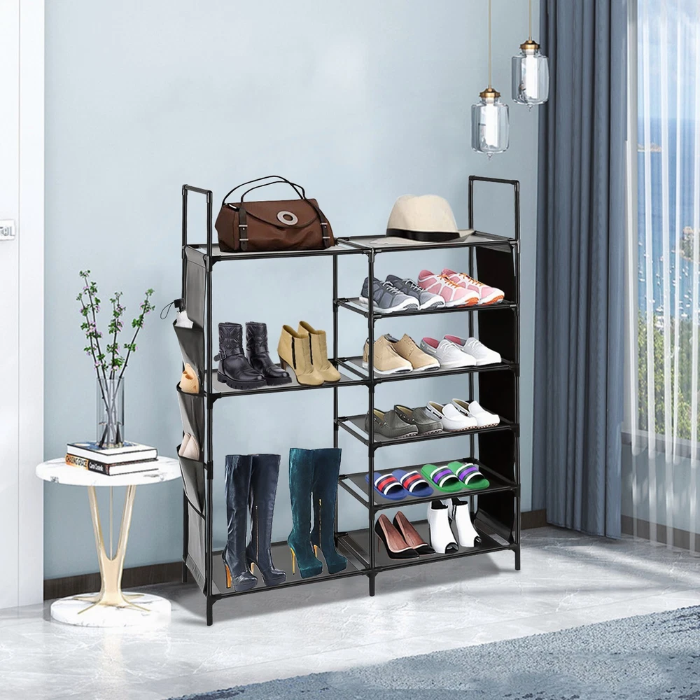 Features Durable & Sturdy Structure: Shoe rack is made of coated metal tubes and high quality PP parts, stable durable sturdy. Large Capacity: 6 Tires + Storage Bag, the design of increasing height and width makes this large shoe rack can store more styles of shoes. Extar Storage Bag: The side of the shoe rack is equipped with a storage bag to add more convenience to your life. Versatile Shoe Shelf: It can store all kinds of shoes, such as sports shoes, boots, high-heeled shoes, flip flops, sandals, slippers, etc. It is very suitable for your family and guests to tidy shoes. Specification Type: Shoe Rack Product Type: Assembled Material: Coated Metal Tubes, PP, Non-woven fabric Color: Black Size: 43.3*36.64*11.02in Package 1x Shoe Rack 、 On Jun 26, 2025 at 03:21:45 PDT, seller added the following information: