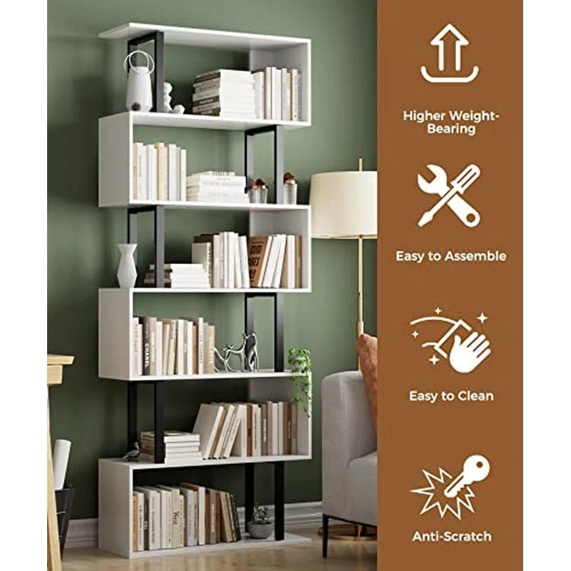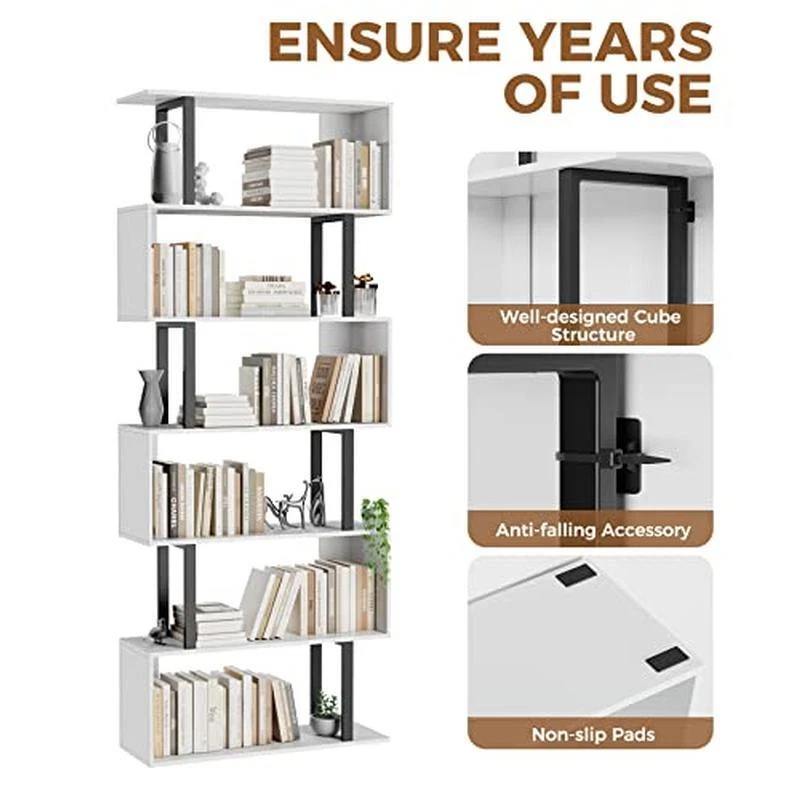 6 Tier S Shaped Bookcase Modern Wood Shelving Space Saving Storage Book Shelf