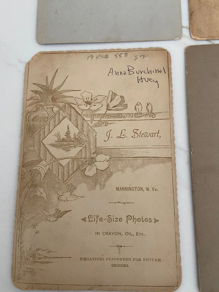 Cabinet cards are photographs mounted on stiff pieces of cardboard. They were introduced in the 1860s. The front of the card is usually printed or embossed with the photographer’s details, and the back of the cabinet card is often printed with elaborate designs. The popularity of the cabinet card waned around the turn of the century, particularly after the introduction of the photographic postcard, but they were still being produced right until the First World War. The color of the cardboard mount can also help date the photograph. Cream mounts were always popular, but bolder, dark colors like black, dark brown, green or burgundy began to appear in the 1880s and 1890s. All in really good shape except for the CC Hough photograph of an infant - it has damage to lower left corner.