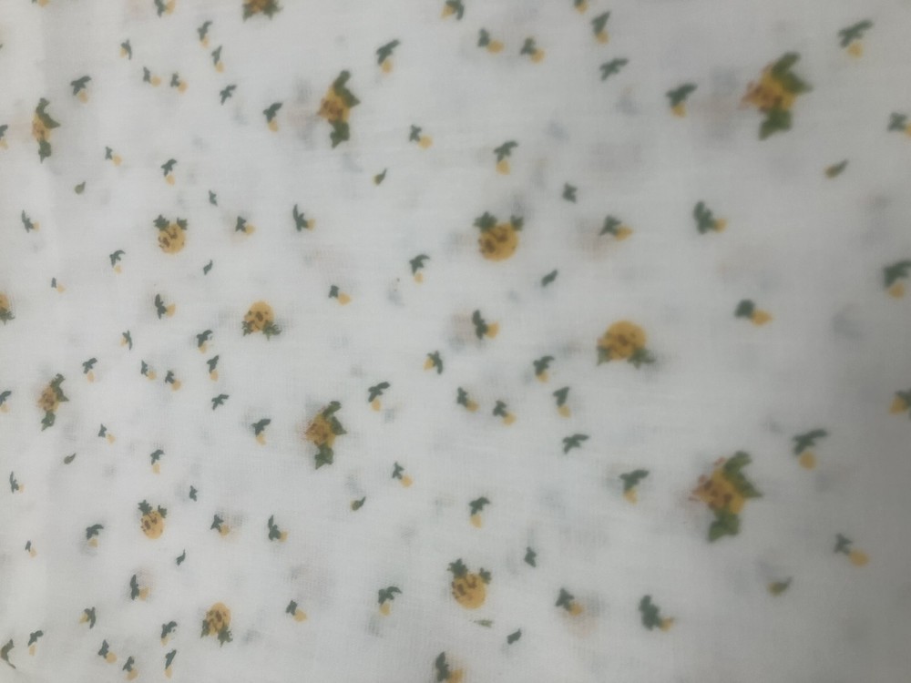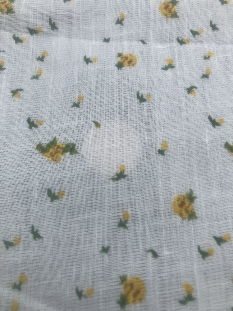 6 yards white semi sheer cotton voile fabric with tiny yellow flowers..that is 44" wide. very sweet fabric. Being sold with two areas of yellow shading. Please see this on my pictures. . Most of the fabric is perfect so the areas are very small. where the fabric has bled. Please take a moment to look at all of my fabric and feed sacks listed on ebay at this time. I am always happy to combine shipping. All of my fabrics vintage clothing and textiles come from a smoke free, animal free home. Shipping of this fabric will be $10.95 priority.