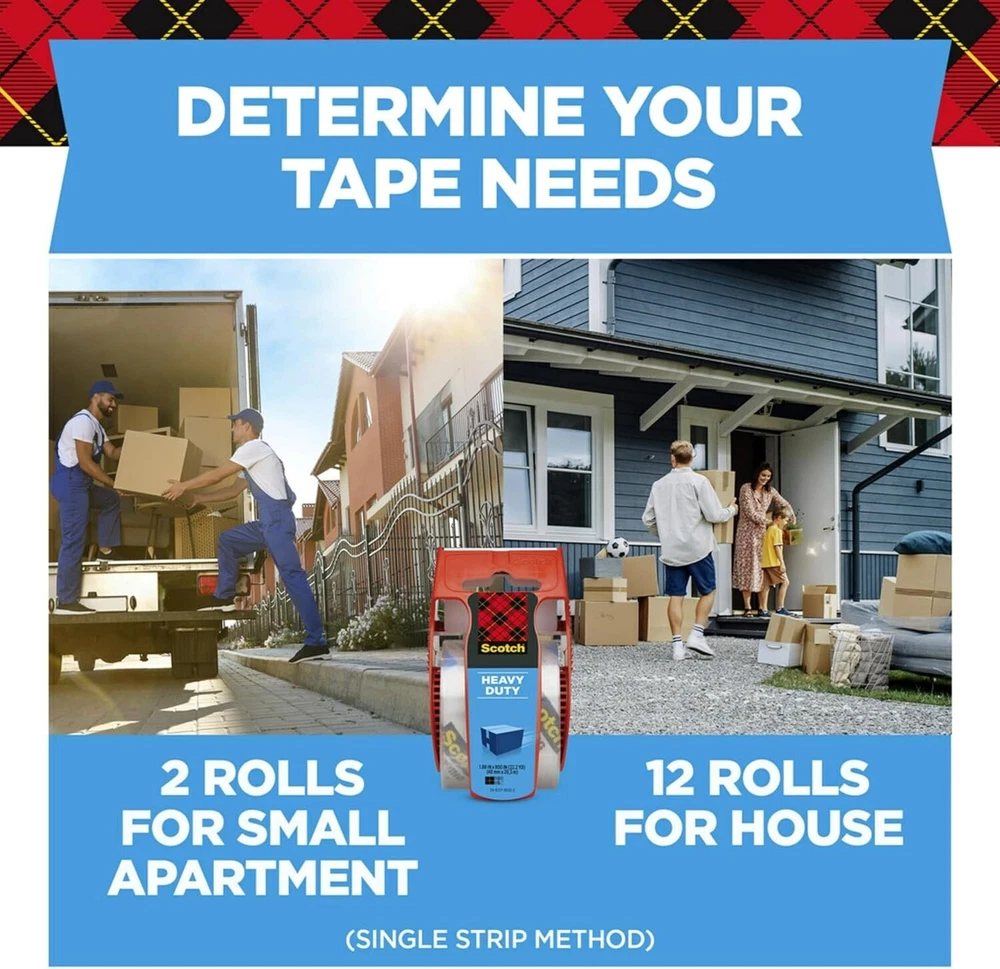 Scotch Heavy Duty Shipping and Moving Packing Tape, Clear, Packing and Moving Supplies, 1.88 in. x 22.2 yd., 6 Tape Rolls with Dispensers Warehouse in USA and Free Shipping in USA About this item PACKING TAPE: 6 rolls of Scotch Heavy Duty Shipping Packing Tape come in dispensers for convenient application and offer excellent holding power for your moving, packing and shipping needs INDUSTRIAL-STRENGTH ADHESIVE: Industrial- strength, solvent-free adhesive adheres instantly to lock in the heavy-duty contents of your boxes and lock out everything else, even through rough handling conditions FOR ALL BOX TYPES: Carton tape that works on all types of boxes, including harder-to-stick 100% recycled boxes JUST ONE STRIP NEEDED: Shipping tape that resists slivering, splitting and tearing to keep your moving boxes sealed with just one strip on each seam IDEAL FOR: It's a great parcel tape for shipping items to your new home, as well as for sealing moving boxes USE WITH TAPE DISPENSER: Dispenser (included) provides precise cuts and features fall-back tabs to help ensure tape doesn’t fall back on the roll, keeping it ready for the next use Thank you for choosing my store and hope all the best things will come to you!