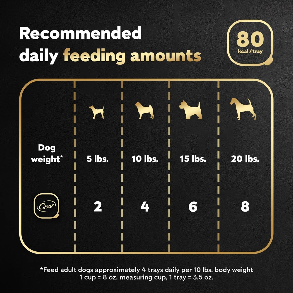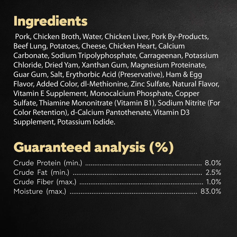 Cesar Loaf and Topper in Sauce Ham and Egg Wet Dog Food, 3.5 oz Tray Dog love the great taste of ham, eggs, and potatoes in CESAR Ham & Egg Flavor With Potato & Cheese Loaf & Topper in sauce wet Cesar Loaf and Topper in Sauce Ham and Egg Wet Dog Food, 3.5 oz Tray Dog love the great taste of ham, eggs, and potatoes in CESAR Ham & Egg Flavor With Potato & Cheese Loaf & Topper in sauce wet dog food With real pork as the #1 ingredient, you can be sure you're giving your dog flavors they will love Contains no fillers, no artificial flavors, and is formulated without grains. (Trace amounts may be present due to crosscontact during manufacturing) This complete and balanced meal for an adult dog makes every mealtime delicious Cesar Loaf & Topper's gourmet soft dog food is served in convenient trays with easy, peel-away seal