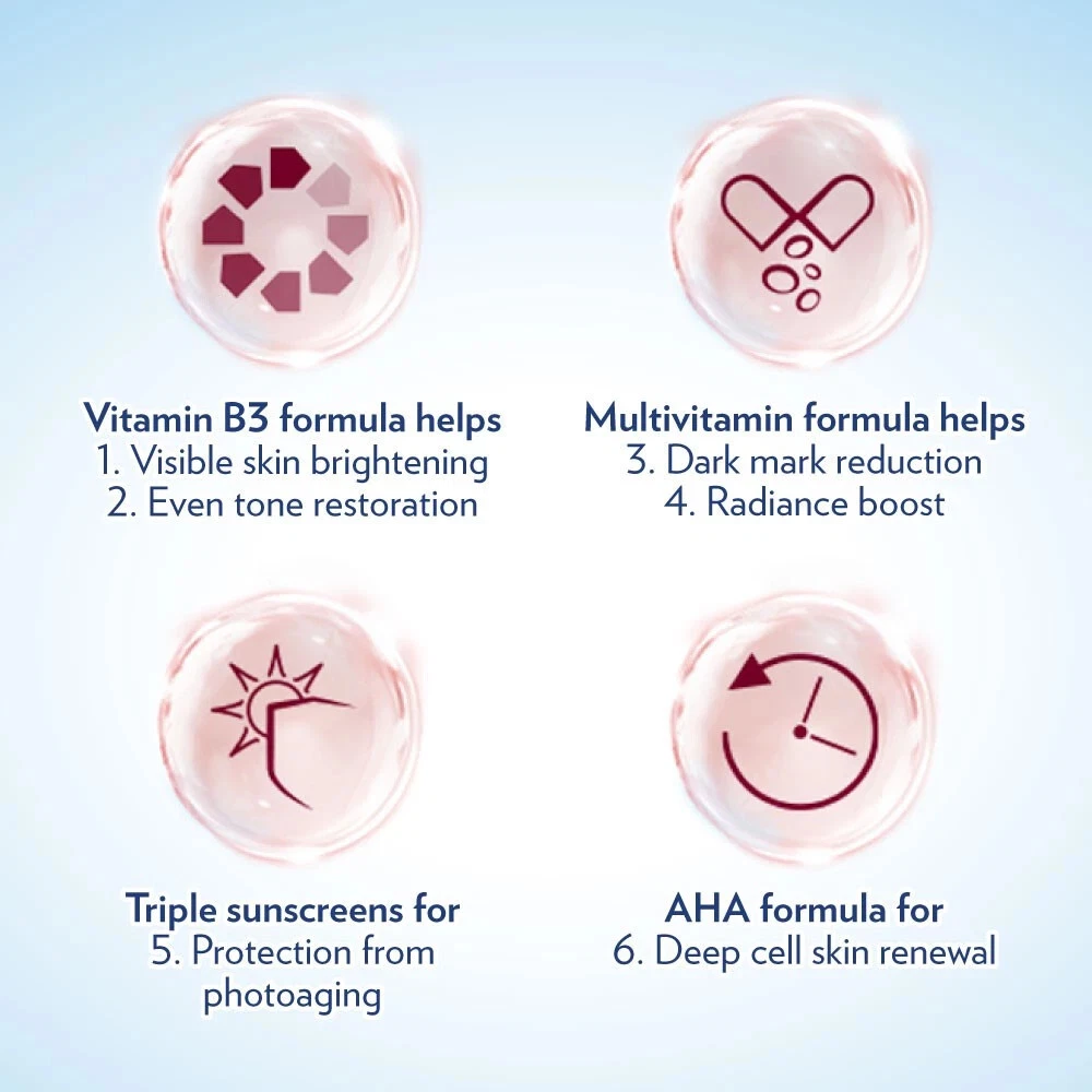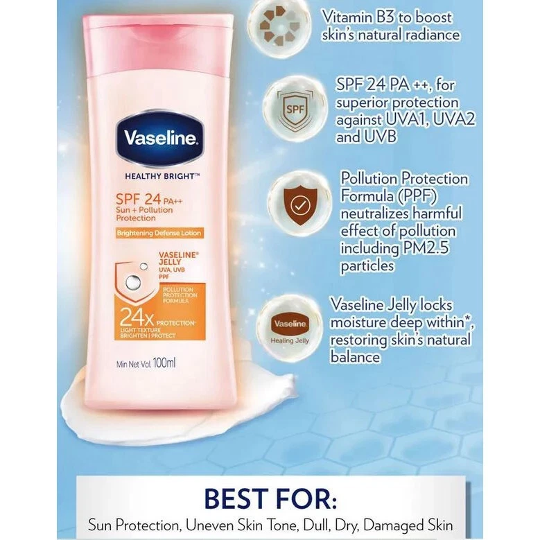 Product Details: Vaseline Healthy Bright Perfect Youth E 100ml Quick Overview: Vaseline® Healthy White Perfect Youth™ Body Lotion restores 10-in-1 anti-aging skin benefits: Contains AHA and Pro-Retinol to help reduce fine lines and first signs of aging while boosting collagen and increasing skin elasticity. Visible Skin Lightening. Even Tone Reduction. UVA & UVB Protection. Dark Mark Reduction. Boost Radiance. Leaves skin firm and tight. Visibly reduce fine lines. Deep nourishment. Intense moisturisation. Skin renewal. Contains Vitamin B3 that helps skin look brighter by working deep inside the skin - inhibiting melanin transfer to help reduce the appearance of wrinkles, uneven tone and dark spots. Micro-droplets of Vaseline® Jelly restore damaged skin from deep within. Non-greasy and absorbs fast to leave skin feeling soft and smooth. Best For : Aging Skin, Uneven Skin Tone, Dull Skin, Damaged Skin Direction for Use: Apply Vaseline Healthy Bright Perfect Youth to your hand and spread across your body until absorbed. Use twice a day for best results. Apply thoroughly to avoid product rubbing off on clothes. Caution: 1) Do not stay long in the sun even while using a product with sunscreen. 2) Store product away from sunlight. 3) In the unlikely event of skin irritation, stop using and consult a doctor immediately.