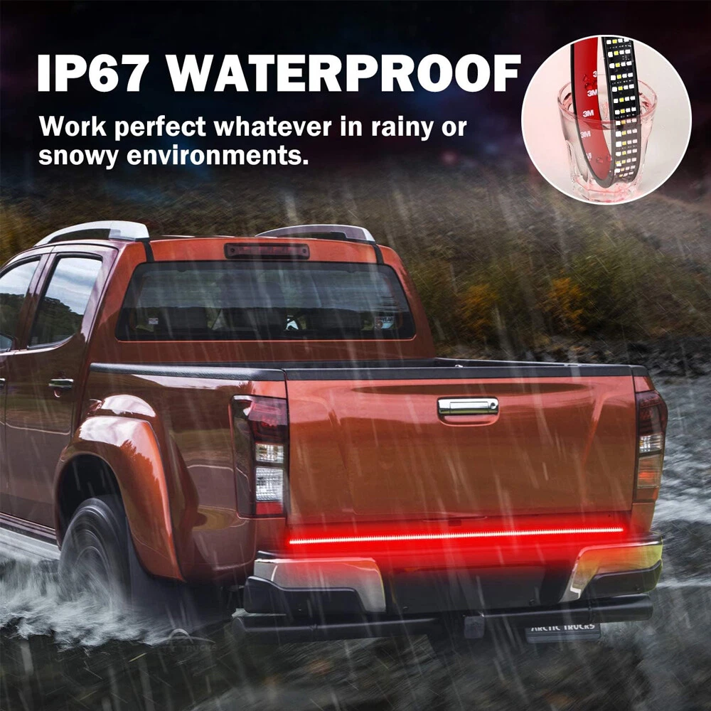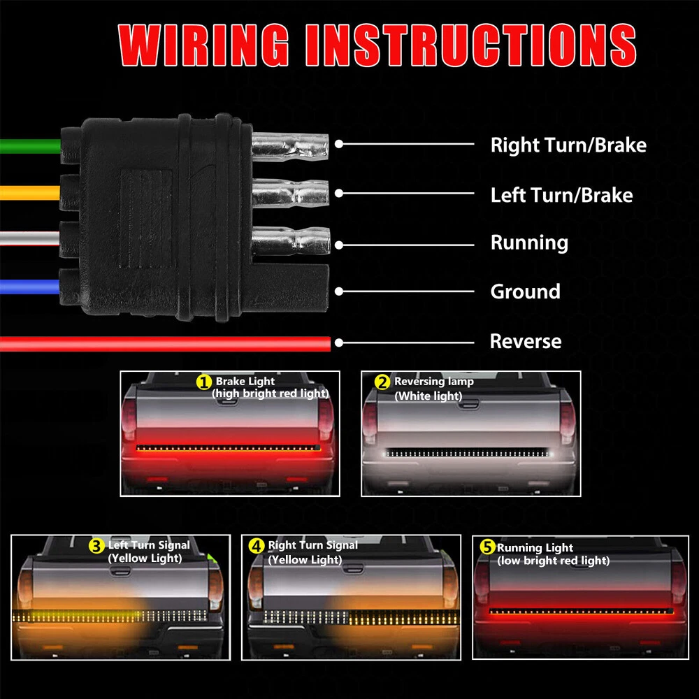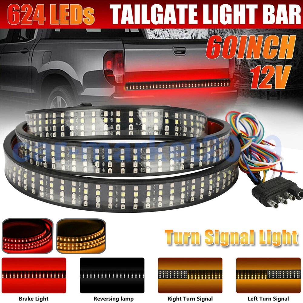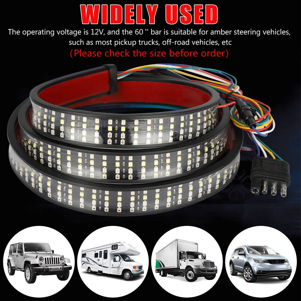 60" 4 Rows 624 LED Truck Strip Tailgate Light Bar Reverse Brake Tail Signal Lamp LED Truck Tailgate Light Bar, 60 Inch Quad Row LED Truck Light Strip with White Reverse, Red Brake/Running, Yellow Turn Signal/Double Flash Strobe Light for Trucks Pickup RV Van Specification: T ype: LED Truck Tailgate Strip Bar Quantity: 1PC Housing material: Fully Sealed Silicone Housing Shell material: PVC Voltage: DC 12V Light Source Power: 18W Luminous Flux: 2000LM LED Quantity: 624 LEDs LED Type: 2835 Light Color: Red/Yellow/White Red Light For: Driving Light (Low brightness) , Brake Light (High brightness) Yellow Light For: Turn Signal Light / Double Flash Light White Light For: Reverse Light Waterproof Rate: IP67 Light Length: 60inch / approx. 150cm Functions: Brake, Turn Signal, Double Flash, Running, and Reverse Light Fit For: for most cars, trucks, Pickup, SUV, RV, Van, trailers, etc. Lampholder Interface: Standard 4 PIN connector PGRADED 6-Functions: Running Mode: All red LEDs light up(Low brightness) Brake Mode: All Red LEDs light up(high brightness) Reverse Mode: All White LEDs light up Turn Left Mode: Left Amber LEDs light up Turn Right Mode: Right Amber LEDs light up Double Flash Mode (Hazard Emergency ): Left & Right indicator sequentially flowing from center to both sides. Feature: ✅ Full Functions: The new style tailgate light features full functions of the brake, flowing turn signal, double flash, and running light.With 624pcs 2835 SMD LED chips to give out the super-bright beam. Adds clear visibility to the rear drivers, better-ensuring safe traffic on roads. ✅ Multiple Functions: Driving light / Brake light - All red LEDs are on (different brightness); Left rear turn signal lamp - Left AMBER LED is on; Right rear turn signal lamp - Right AMBER LED is on; Reversing lamp - White LED on. Wake up everyone behind you and reduce accidents in bad weather. ✅ Premium Quality: Adopts fully sealed silicone housing with IP67 waterproof rate, works well whatever in rainy or snowy days. With inline fuse for short circuit protection, heavy-duty, and super durable. ✅ Easy To Install: "No drilling" installation system. The standard 4-pin flat plug and self-adhesive tape with good conductivity can be easily pasted on any smooth surface, and the installation is simple without screws. Easy plug and play installation. ✅ Universal Fitment for: Tailgate light with a working voltage of 12V DC, fits most vehicles. For Dodge Ram 1500 2500, 3500, 4500, For Ford F150, F250, For Chevy, Silverado, For GMC, Sierra, For Toyota Tundra, and most cars, trucks, Pickup, SUV, RV, Van, trailers, etc. How To Use: Wires connection Tips: Green wire is connected to the Right Turn/Brake ; Yellow wire is connected to the Left Turn/Brake; White wire is connected to Running ; Blue wire is connected to the Gound ; Red wire is connected to the Reverse . Package Included: 🌟 1 x 60"inch Truck Tailgate LED Light Strip General Installation Information: 1. Select desired mounting position and make sure that the surface is clean and clear of dirt, water or wax. 2. Peel off the tape and stick the tailgate bar onto the car 3. Connect the power cord to vehicle 4. Plug and play connectivity with flat 4-pin trailer connection harness for brake/signal, tap wire for the backup reverse light Note: Professional installation is highly recommended (No instruction included), Due to the lighting and screen settings, the real color may slightly different from the picture. Note: This led strip only performs one function. When both brake and turn signal are applied, only the brake light on the LED strip is turned on. The turn signal will start functioning until the brake is released. 【Service Guarantee】Thanks for visiting our Store! We try to accurately describe our item to the best of our knowledge, if there is any incorrect, please feel free to let us know via message. If you have any problem or concerns,we hope you can contact us via message,before you decide to leave neutral or negative feedback or open return request or case. When we see your email at work, we will reply to you as soon as possible. Payment Delivery details Terms of sales About us Contact us Payment 1.We only accept PayPal as payment method. 2.The item will be shipped to buyer’s CORRECT and VERIFIED Ebay Address. 3.We are not responsible for the package lost due to incorrect address. 4.Our price do not including any custom or duty, VAT and local tax. 5.Payment must be received within 7 days of winning the auction 6.Please contact us if you need file an extension for any late payment. Delivery details 1.All item are shipped via DHL eCommerce or USPS Frist Class express Service within 2 business days once full payment is settled.If you can't get your items in time,please contact to us first,we will check and solve it for you soon.We will reply your mail within 24 hours normally. Sometimes have a little delay due to the weekend or holiday.If you can't get our mail after 48 hours,please check your spam or contact to us with other mail address or via ebay. 2.We only ship to confirmed Ebay addresses. Your Ebay address MUST MATCH your Shipping address. 3.If you want to change the address please E-mail us right after you pay for the item. 4.SERVICE TRANSIT TIME is provided by the carrier and excludes weekends and holidays. Transit times may vary, particularly during the holiday season. 5.If you have not received your shipment within 30 days from payment, please contact us. We will track the shipment and get back to you as soon as possible with a reply. Our goal is customer satisfaction! Terms of sales 1.Please contact us via eBay Message if you have NOT received item in 30 days , we will check it with post office, and then resend or refund any missing item. 2.i n the unlikely event that your product is faulty in anyway, you must contact us ASAP and then return it within 7 Days of receipt. 3.Return shipping fee should be paid by buyer if wrong item you bought (wrong model or 