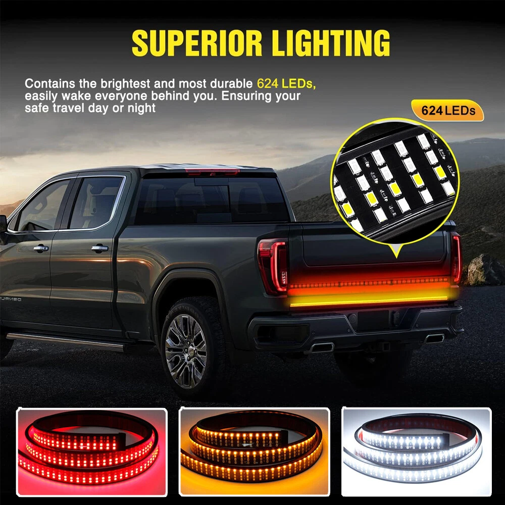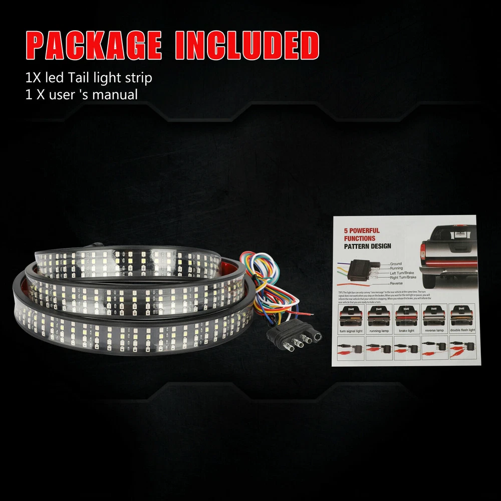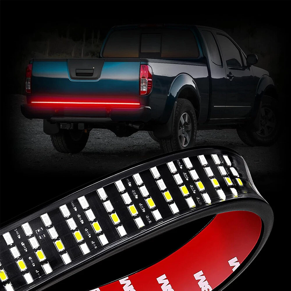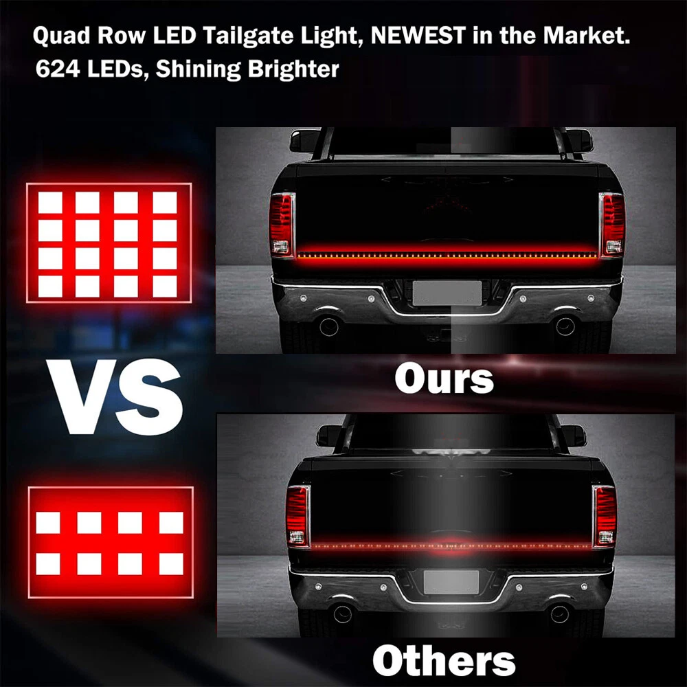 60" 4 Rows 624 LED Truck Strip Tailgate Light Bar Reverse Brake Tail Signal Lamp LED Truck Tailgate Light Bar, 60 Inch Quad Row LED Truck Light Strip with White Reverse, Red Brake/Running, Yellow Turn Signal/Double Flash Strobe Light for Trucks Pickup RV Van Specification: T ype: LED Truck Tailgate Strip Bar Quantity: 1PC Housing material: Fully Sealed Silicone Housing Shell material: PVC Voltage: DC 12V Light Source Power: 18W Luminous Flux: 2000LM LED Quantity: 624 LEDs LED Type: 2835 Light Color: Red/Yellow/White Red Light For: Driving Light (Low brightness) , Brake Light (High brightness) Yellow Light For: Turn Signal Light / Double Flash Light White Light For: Reverse Light Waterproof Rate: IP67 Light Length: 60inch / approx. 150cm Functions: Brake, Turn Signal, Double Flash, Running, and Reverse Light Fit For: for most cars, trucks, Pickup, SUV, RV, Van, trailers, etc. Lampholder Interface: Standard 4 PIN connector PGRADED 6-Functions: Running Mode: All red LEDs light up(Low brightness) Brake Mode: All Red LEDs light up(high brightness) Reverse Mode: All White LEDs light up Turn Left Mode: Left Amber LEDs light up Turn Right Mode: Right Amber LEDs light up Double Flash Mode (Hazard Emergency ): Left & Right indicator sequentially flowing from center to both sides. Feature: ✅ Full Functions: The new style tailgate light features full functions of the brake, flowing turn signal, double flash, and running light.With 624pcs 2835 SMD LED chips to give out the super-bright beam. Adds clear visibility to the rear drivers, better-ensuring safe traffic on roads. ✅ Multiple Functions: Driving light / Brake light - All red LEDs are on (different brightness); Left rear turn signal lamp - Left AMBER LED is on; Right rear turn signal lamp - Right AMBER LED is on; Reversing lamp - White LED on. Wake up everyone behind you and reduce accidents in bad weather. ✅ Premium Quality: Adopts fully sealed silicone housing with IP67 waterproof rate, works well whatever in rainy or snowy days. With inline fuse for short circuit protection, heavy-duty, and super durable. ✅ Easy To Install: "No drilling" installation system. The standard 4-pin flat plug and self-adhesive tape with good conductivity can be easily pasted on any smooth surface, and the installation is simple without screws. Easy plug and play installation. ✅ Universal Fitment for: Tailgate light with a working voltage of 12V DC, fits most vehicles. For Dodge Ram 1500 2500, 3500, 4500, For Ford F150, F250, For Chevy, Silverado, For GMC, Sierra, For Toyota Tundra, and most cars, trucks, Pickup, SUV, RV, Van, trailers, etc. How To Use: Wires connection Tips: Green wire is connected to the Right Turn/Brake ; Yellow wire is connected to the Left Turn/Brake; White wire is connected to Running ; Blue wire is connected to the Gound ; Red wire is connected to the Reverse . Package Included: 🌟 1 x 60"inch Truck Tailgate LED Light Strip General Installation Information: 1. Select desired mounting position and make sure that the surface is clean and clear of dirt, water or wax. 2. Peel off the tape and stick the tailgate bar onto the car 3. Connect the power cord to vehicle 4. Plug and play connectivity with flat 4-pin trailer connection harness for brake/signal, tap wire for the backup reverse light Note: Professional installation is highly recommended (No instruction included), Due to the lighting and screen settings, the real color may slightly different from the picture. Note: This led strip only performs one function. When both brake and turn signal are applied, only the brake light on the LED strip is turned on. The turn signal will start functioning until the brake is released. 【Service Guarantee】Thanks for visiting our Store! We try to accurately describe our item to the best of our knowledge, if there is any incorrect, please feel free to let us know via message. If you have any problem or concerns,we hope you can contact us via message,before you decide to leave neutral or negative feedback or open return request or case. When we see your email at work, we will reply to you as soon as possible. Payment Delivery details Terms of sales About us Contact us Payment 1.We only accept PayPal as payment method. 2.The item will be shipped to buyer’s CORRECT and VERIFIED Ebay Address. 3.We are not responsible for the package lost due to incorrect address. 4.Our price do not including any custom or duty, VAT and local tax. 5.Payment must be received within 7 days of winning the auction 6.Please contact us if you need file an extension for any late payment. Delivery details 1.All item are shipped via DHL eCommerce or USPS Frist Class express Service within 2 business days once full payment is settled.If you can't get your items in time,please contact to us first,we will check and solve it for you soon.We will reply your mail within 24 hours normally. Sometimes have a little delay due to the weekend or holiday.If you can't get our mail after 48 hours,please check your spam or contact to us with other mail address or via ebay. 2.We only ship to confirmed Ebay addresses. Your Ebay address MUST MATCH your Shipping address. 3.If you want to change the address please E-mail us right after you pay for the item. 4.SERVICE TRANSIT TIME is provided by the carrier and excludes weekends and holidays. Transit times may vary, particularly during the holiday season. 5.If you have not received your shipment within 30 days from payment, please contact us. We will track the shipment and get back to you as soon as possible with a reply. Our goal is customer satisfaction! Terms of sales 1.Please contact us via eBay Message if you have NOT received item in 30 days , we will check it with post office, and then resend or refund any missing item. 2.i n the unlikely event that your product is faulty in anyway, you must contact us ASAP and then return it within 7 Days of receipt. 3.Return shipping fee should be paid by buyer if wrong item you bought (wrong model or 