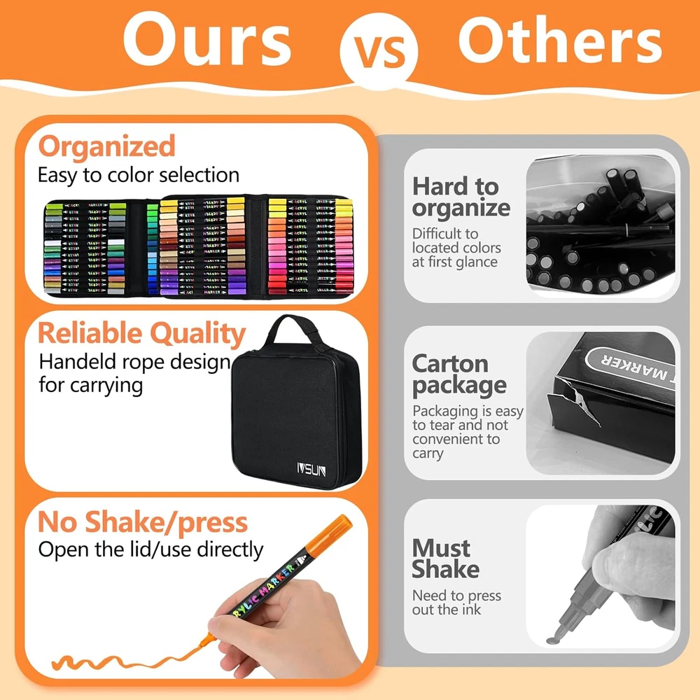 Store New Arrivals Add to Favorite View Feedback Contact Fast deliveries to the customer's home Quality customer service John Make the customers happy! 60 Colors Acrylic Paint Markers, Dual Tip Acrylic Paint Pens with Brush and Fine Tips for Rock Painting, Canvas, Wood, Glass, Metal, Ceramic, Calligraphy, Card Making, DIY Crafts Description Safe & Premium Quality: Our paint pen offer a smooth and consistent flow, as they are water-based, non-toxic, and easy to control. Remember to tighten the cap and store the pens horizontally when not in use to ensure even ink flow on the dual tip for your next use Versatile Dual Tips: Our acrylic paint markers feature a versatile dual tip design to meet various coloring needs. The 1mm fine tip is suitable for outlining, detailing, and fine line work, while the 1-5mm brush tip allows for coloring larger areas coloring and shading. From delicate line work to bold sweeps, meet the different needs of professionals and amateurs 60 Vibrant Colors: IVSUN 60 acrylic markers set contains 52 vibrant colors and 8 metallic colors, bright, vibrant primary and complementary colors let your imagination run wild with possibilities. It is a perfect choice to design your scrapbook, bullet journal, planner, Christmas card, birthday gifts, greeting card, or any DIY crafts projects Work Well on Diverse Surface: These painting pens can widely used on paper, stone, metal, mugs, canvas, fabric, ceramic, plastic, glass, wood, leather, resin, blackboard, Christmas ornament, jars labels, add decoration to graffiti markers, card making, pumpkin kits, easter eggs, and much more for both smooth and porous surfaces. Ideal for kids, students, teenagers, adult, even artists. The wide use brings more convenience to your art design Two Major Upgrades: Unlike traditional acrylic pens,ours don't require shaking or pressing down the nib before use, just uncap and start creating! and we upgraded the bag design, Our paint pens are packed in a PORTABLE STORAGE CASE which can organize all your colors. Convenient to store in backpack or take outside. All you need is to gift one set of dual tip paint pens at Christmas, Valentines day, Graduations, Birthdays or New Year Product Description 60 VIBRANT COLORS 1 8 Metallic Colors 2 17 Classic colors 3 17 Classic colors 4 18 Classic colors 1 Merry Christmas 2 halloween 3 Happy Easter Style Chisel Ink Base Water Number of Items 50 Target Audience General Color Multicolor Pattern Solid Water Resistance Level Waterproof Ink Color Multicolor Marker Type Paint Marker Theme arts and crafts Surface Recommendation Wood, Glass, Plastic, Metal, Ceramic, Paper, Rock, Cardboard, Vinyl, Stone, Porcelain, Fabric, Rubber, Leather, Melamine, Steel Drill Point Brush Tip and Fine Tip Additional Features Multi Surface Use Point Type Brush Tip and Fine Tip Line Size 1-5mm Millimeters Is Waterproof true Number of Pieces 60 ABOUT US We offer the best prices around on high quality products. Our E-store includes media such as books, movies, music and games while offering electronics, toys, sporting apparel, clothing, tools, general home, garden items and more. SHIPPING We are always working hard to ensure your package arrives as soon as possible. Please understand that some factors like weather, high postal traffic, and the performance of shipping companies are outside of our control. We offer free shipping to the lower 48 states and ship within 2 business days of payment, usually sooner. We do not accept P.O. Boxes. Please provide a physical address. For shipping outside of the continental USA, we only use eBay's Global Shipping Program. The item is shipped to KY and then sent to the rest of the world. International customers are responsible for all duties and taxes. Continue to 'check out' to calculate costs for shipping the item to your country. Messages regarding eBay's Global Shipping Program MUST be directed at eBay EXCLUSIVELY. RETURNS We offer a 30-Day Return Policy on items in which you are not completely satisfied with. You have the option of a full-refund or an exchange of the item. No returns are available on items shipped outside of the USA PAYMENT We accept PayPal. CONTACT US This page content is yet to come Please ad us to your favorite seller and visit again later Thank You CUSTOMER SATISFACTION We try our very best to make sure every customer is completely satisfied. If there's a problem, message us! We're happy to help. WE ACCEPT