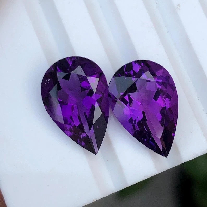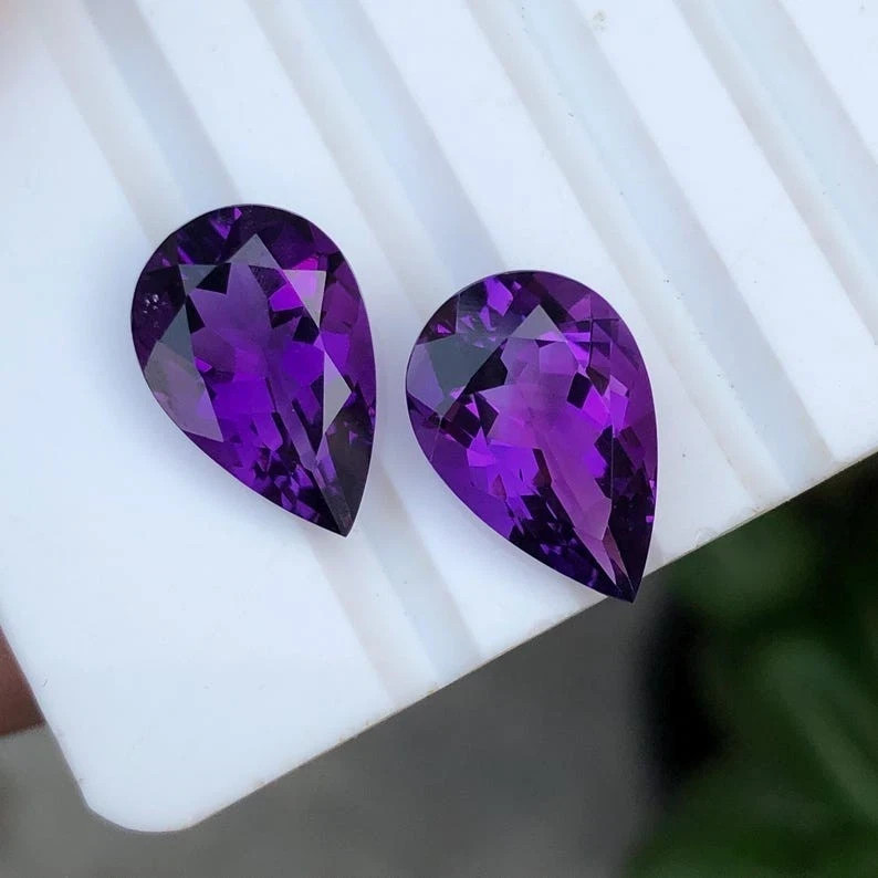 ✨ Gemstone Overview Gemstone: Natural Amethyst Weight: 60+ Carats (Pair Total) Quantity: Matching Pair (2 Gemstones) Shape & Cut: Pear Cut Color: Deep Vibrant Purple Clarity: Excellent Transparency, Eye-Clean Treatment: Heated (Enhances Color & Brilliance) Origin: Brazil – World-renowned source of fine amethyst Certification: Certified Authentic Gemstones ✨ Highlights ✔ Rare matching pair of large pear cut amethysts ✔ Professionally heated for rich purple hue & brilliance ✔ Total weight over 60 carats – impressive for high-end jewelry ✔ Perfect for earrings, designer sets, or collector’s showcase ✔ Certified for authenticity & quality assurance ✨ Why Choose This Pair? A perfectly matched pair of Brazilian amethyst gemstones is hard to find, especially in such large sizes and fine pear cut. Heated to bring out the deepest purple tones, these 60+ carat certified gemstones are ideal for creating luxury statement earrings, pendants, or as part of a premium gemstone collection. 🚚 Ships Worldwide with Tracking 📦 Secure & Protective Packaging ⏱️ Handling Time: 1–2 Business Days 🕒 Estimated Delivery: 10–15 Days (Varies by Location) 🔁 30-DAY RETURN POLICY – BUY WITH CONFIDENCE We offer a 30-Day Hassle-Free Return Policy . Return the item in its original condition if you're not fully satisfied. 🤝 YOUR SATISFACTION MATTERS 💬 Contact us anytime for support, questions, or custom requests. We're available 24/7 to provide fast and friendly service. 🛠️ CUSTOM ORDERS WELCOME 📩 Reach out to Gemoracrafts – Experts in handcrafted luxury design. 🛍️ ABOUT GEMORACRAFTS Gemoracrafts is your trusted source for rare, certified gemstones and bespoke jewelry solutions . Every gem is carefully selected for quality, authenticity, and long-term value.