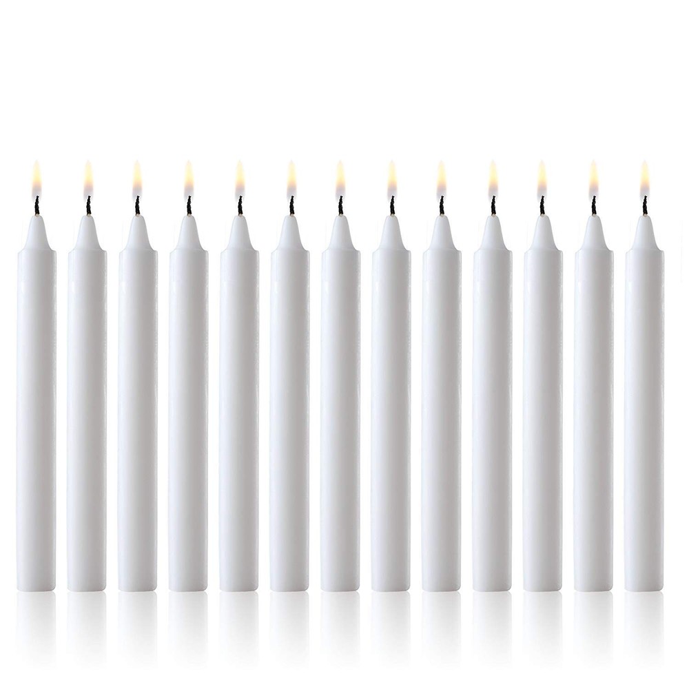 Set of 60 White Taper Candles: 4 inch Tall x 0.5 Inch Thick. Burn Time up to 1.5 Hours. Color is core and overdip maintain color throughout burning. 100% lead free wick Dripless and unscented Clean Burn Perfect Chime Candles Taper Candles add elegance and sophistication to any formal event. Whether it be at a wedding, a reception table or just for a romantic candlelit dinner for that special someone. They provide just the right amount of textured lighting for a dramatic presentation. Small Tapers make the perfect tabletop light for upscale restaurants and parties. Those mini taper candles are perfect decoration for a Christmas Tree, charismas caroling or Holiday Season. They will fit to your angel chimes, pyramids and many others candle holders. Often used on a birthday parties as a birthday cake decoration. SET OF 60 white dripless taper candles 4 Inch tall and 1/2 inch diameter. HAND DIPPED with quality wax to maintain color throughout burning. Contain 100% lead free wick USE perfect as a casting chimes candles candles, vigil, christmas eve, candles, wax play candles. FIT mini taper candles fit into any angel chime, menorah, candle holders with 0.5 inch diameter holder. UNSCENTED and SMOKELESS with pure white clean 1.5 hour burn time. Perfect for church dinners, weddings, parties and other special occasions.