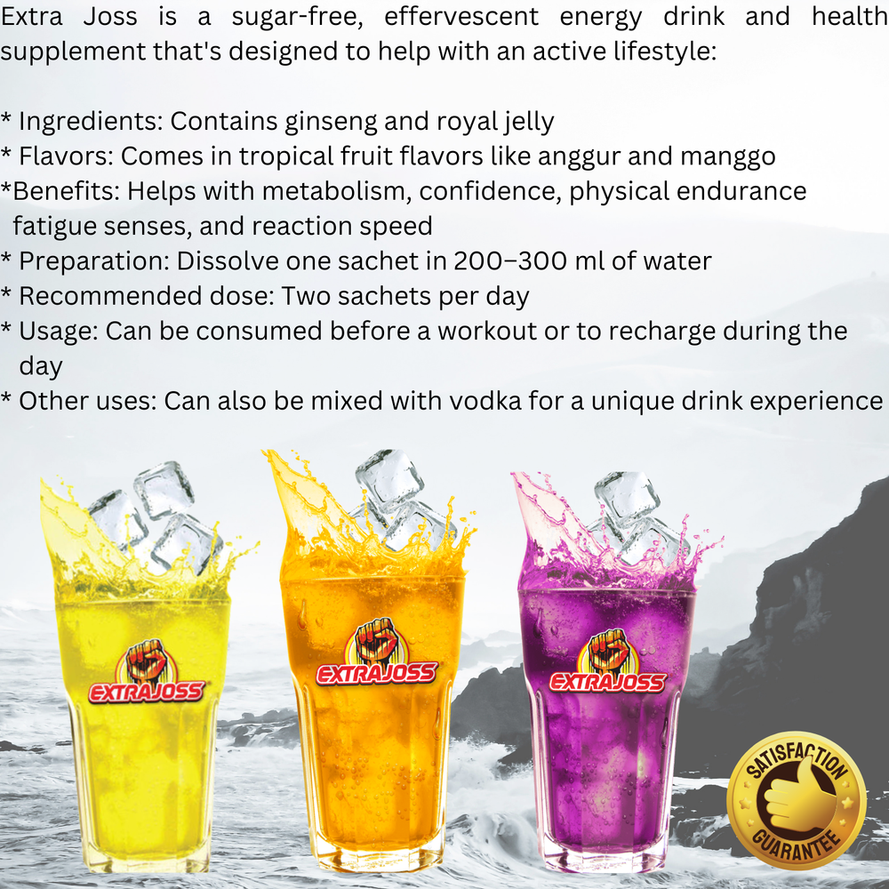 Extra Joss is a sugar-free, effervescent energy drink and health supplement that's designed to help with an active lifestyle: Ingredients: Contains ginseng and royal jelly Extra Joss is a health supplement that helps the body's metabolism to stay fit, it contains 7 Vitamin B, amino acids, caffeine, ginseng and royal jelly. Mango/Grape & Extract 150 mg, Ginseng Extract 35 mg, Vitamin B1 1.5 mg / 1.1 mg, Vitamin B6 2 mg, Vitamin B12 2.4 mcg/2.0 mcg, Taurine 100 mg, Caffeine 50 mg, Sugar, Aspartame, Citric Acid, Royal Jelly Flavors: Comes in tropical fruit flavors like anggur and manggo Benefits: Helps with metabolism, confidence, physical endurance, fatigue, senses, and reaction speed Preparation: Dissolve one sachet in 200–300 ml of cold water Recommended dose: Two sachets per day Usage: Can be consumed before a workout or to recharge during the day Other uses: Can also be mixed with vodka for a unique drink experience Precautions: Not recommended for children, pregnant women, lactating mothers and hypertensive patients. Storage Condition: Store below 30°C. Keep away from direct sunlight and humidity. Satisfaction Guaranteed If doesn't satisfied with your purchase, contact us immediately and we can work out something to solve it. ~ FREE Shipping Worldwide by Registered AirMail with Tracking Numbers Provided ~ Packaging Detail The product is well packed using bubble padded envelope/boxes to protect product from damages (bubble wraps) Shipping Policy Free Economy International Shipping (to USA) with a tracking number. All items will be shipped within 3 working days after receiving payment. If you do not receive the item in stated period of time, please do not hesistate to contact me. We will reply within 24hrs and will try to solve the problem for you. Custom Duties & Tax Policy Please note that the custom duties and tax are not included in the product price and shipping price. All custom duties and tax , if any, (by your country's customs) will be borne by the buyer and payable at the destination . We do not responsible for any custom fees, import duties or taxes in buyer country. Returns Policy Your satisfaction is our top priority. Items can be returned to exchange within 30 days. Before we ship the item, we will do a final check to make sure the item is in undamaged condition. If the item is missing in the transit, we will refund 100% to the buyer If the item arrived damaged / faulty or the wrong item is sent, please contact us with photo proof. We will arrange either a refund or a replacement for you at our expense. If you wish to return your item for any other reason apart from damaged on delivery or wrong item sent, please send the item back to us with the original unused and unopened packaging. The buyer will be responsible for the return shipping charges. Once the item reach us and inspected, we will arrange a refund to you. Please note that all opened items cannot be returned nor refunded. Buyer return incorrect item to us must use "Registered Mail" with tracking number so both parties can trace the parcel status. Contact Information If you require any help with your order, please don?t hesitate to contact us by the ebay message system. We will reply you within 24 hours. We've put our effort to make the listings incredibly detailed so that buyer can be well informed in making buying decisions. However if for some reasons you feel disappointed, please contact us first prior to leave negative feedback or open case/dispute so that we may work with you to make it right. We always strive to offer you a good service. Any questions please feel free to contact us. Please Check out my other Items for sale! Thanks for looking! Thank you for shopping with us!