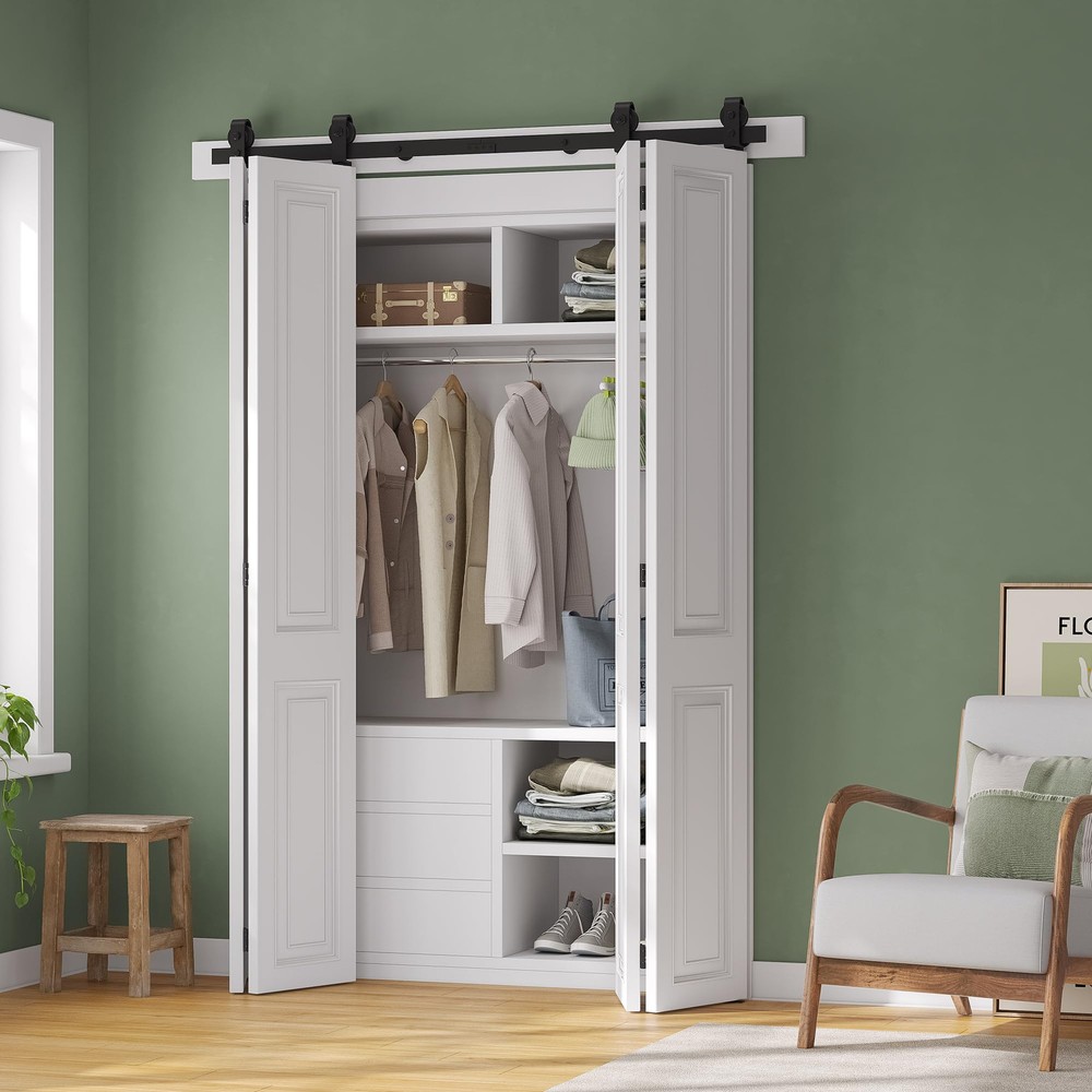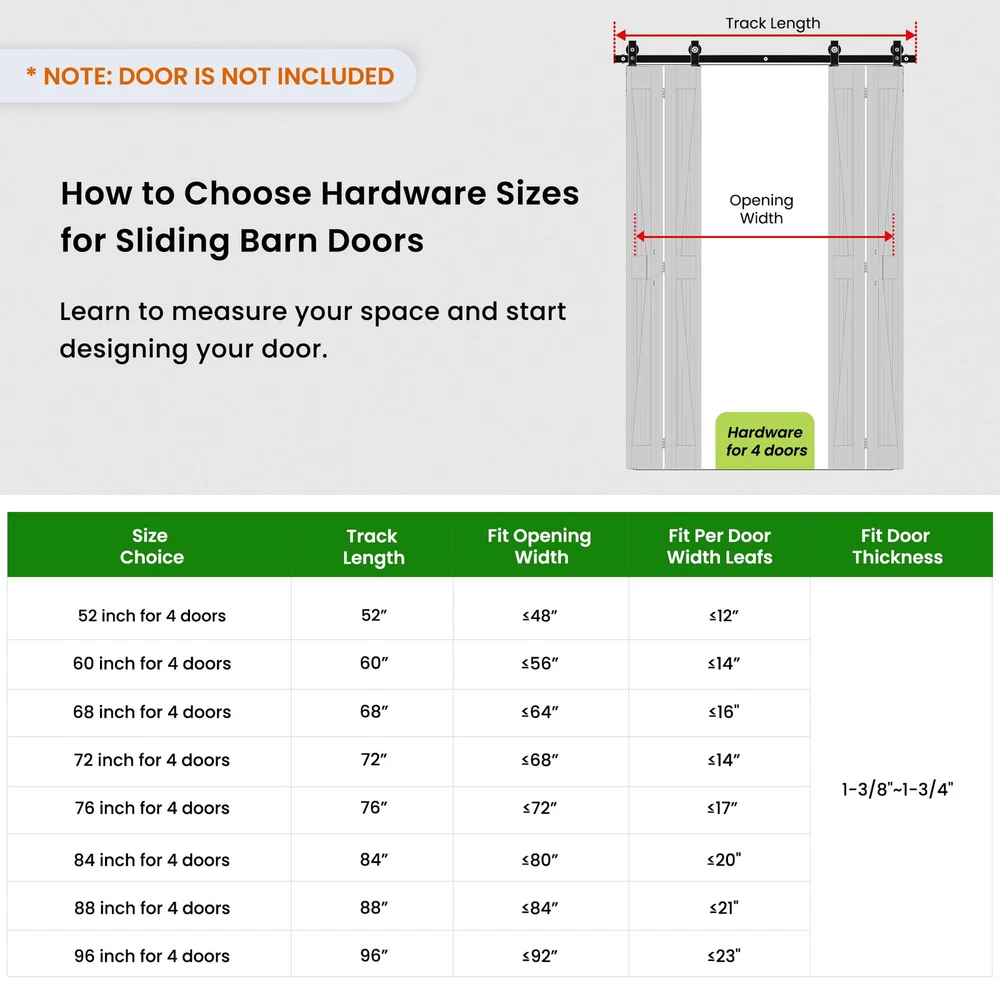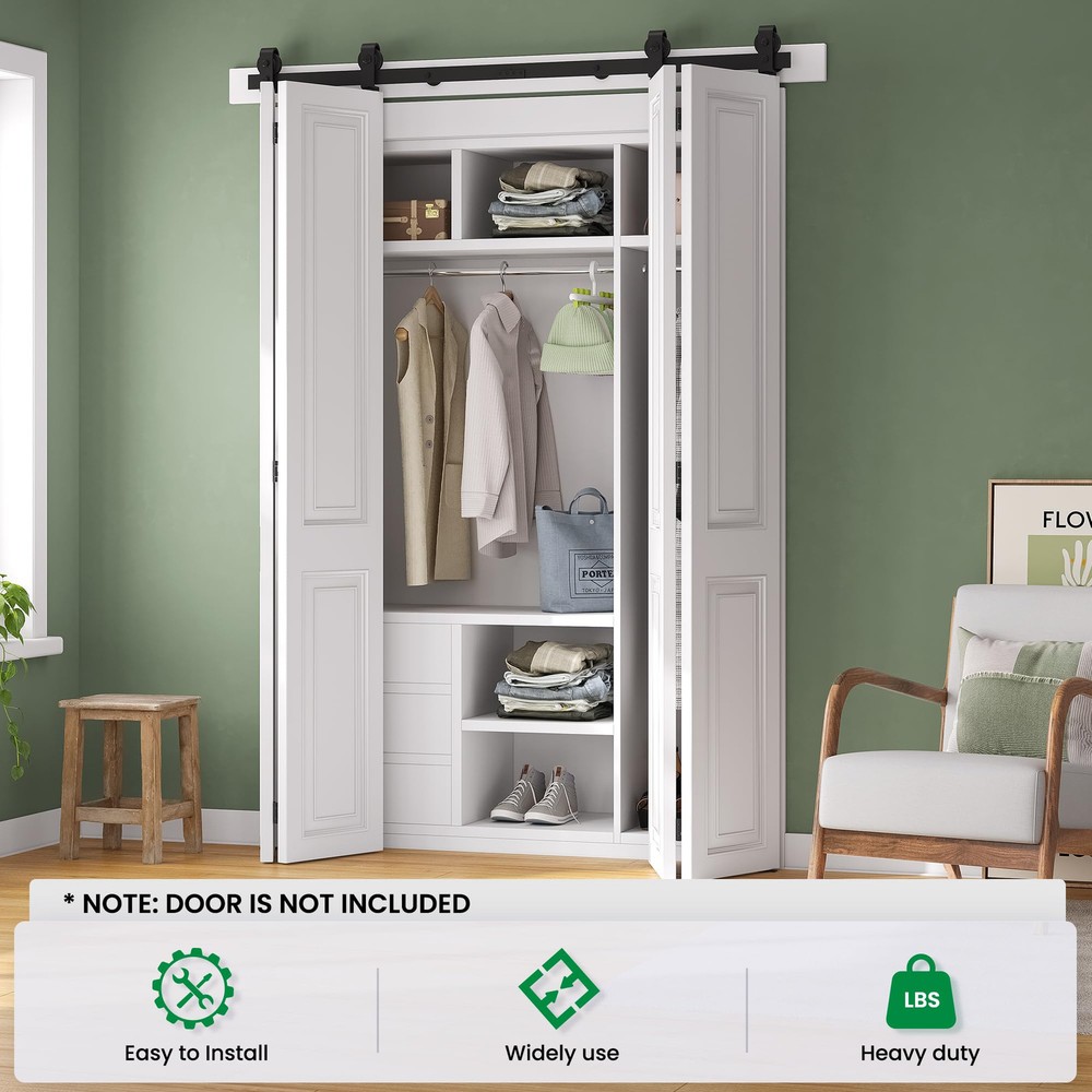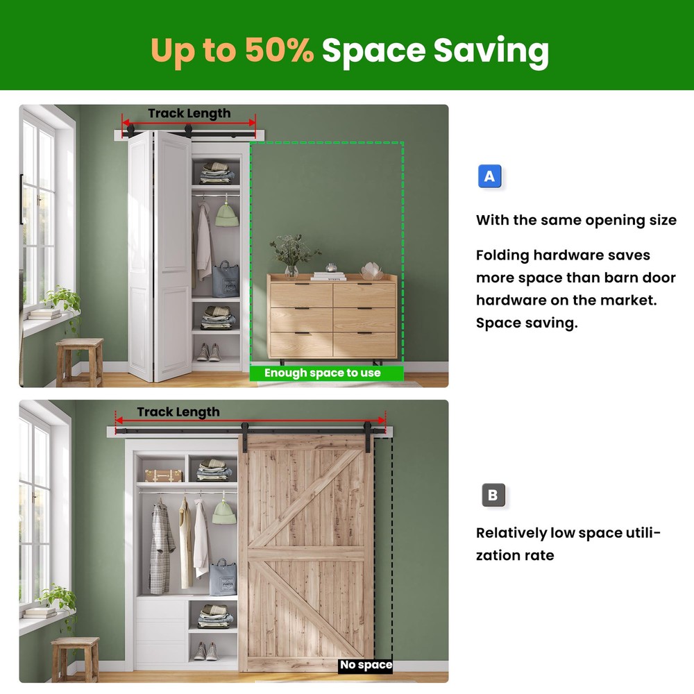 Maximize Your Space: Our bi-folding barn door kit is perfect for limited spaces, requires just 6”-8” beside your door opening. Versatile use for multiple door types and suitable for various living spaces, including the laundry room, closet, study, and more. Exceptional Quality: Constructed from heavy-duty black steel, offering robustness, wear and corrosion resistance.The rollers and tracks are designed to minimize friction, making it effortless to open and close the door. Hassle-Free Installation: Comes with a user-friendly manual with sequential instructions. Whether you're a DIY enthusiast or prefer professional help, we're here to assist you online, ensuring a smooth setup process. Dimensions: Fit Door Thickness:1" ~ 1-3/4", Per Door width: Max 14"; Door weight capacity: 180lb.The track length should be door opening size + 4",at least 6" clearance needed from top of door and ceiling. Package Lists: 2x 2.5FT Rails, 4x Rail Spacers, 2x Fixed Roller, 2x Adjustable Roller, 2x Roller Lock Bracket, 2x Bottom Pivot Plate & Sleeve, 4x Top Connector Plates,6x Butt Hinges, 3x Hex Key. All other necessary hardware is included. (Note: Door not included).