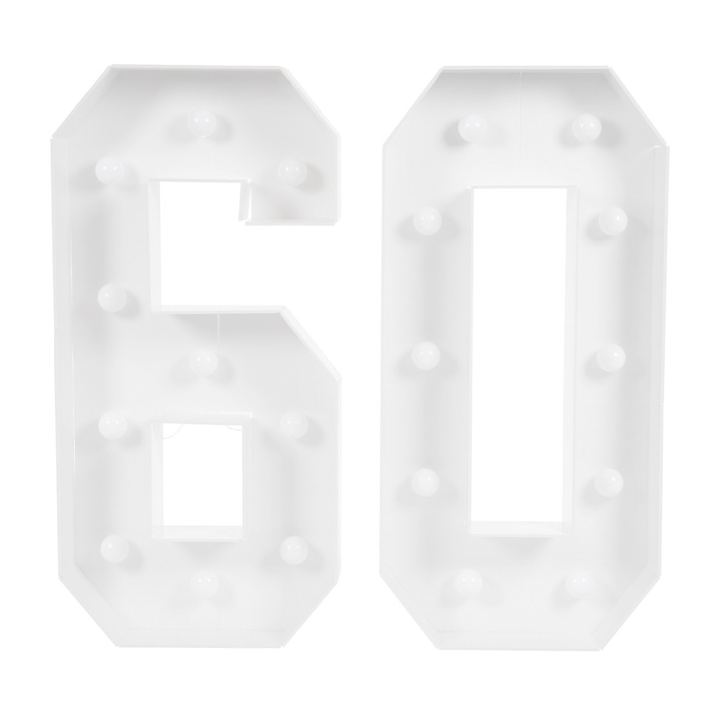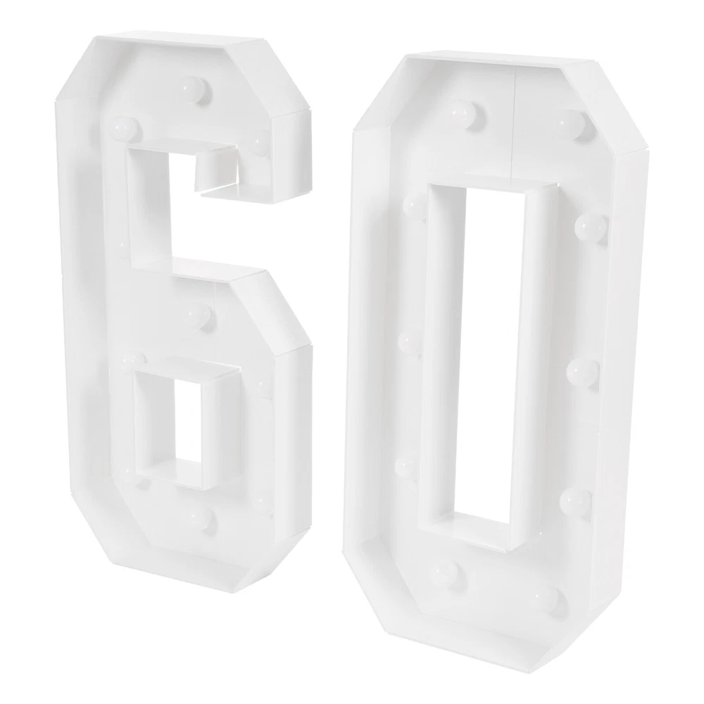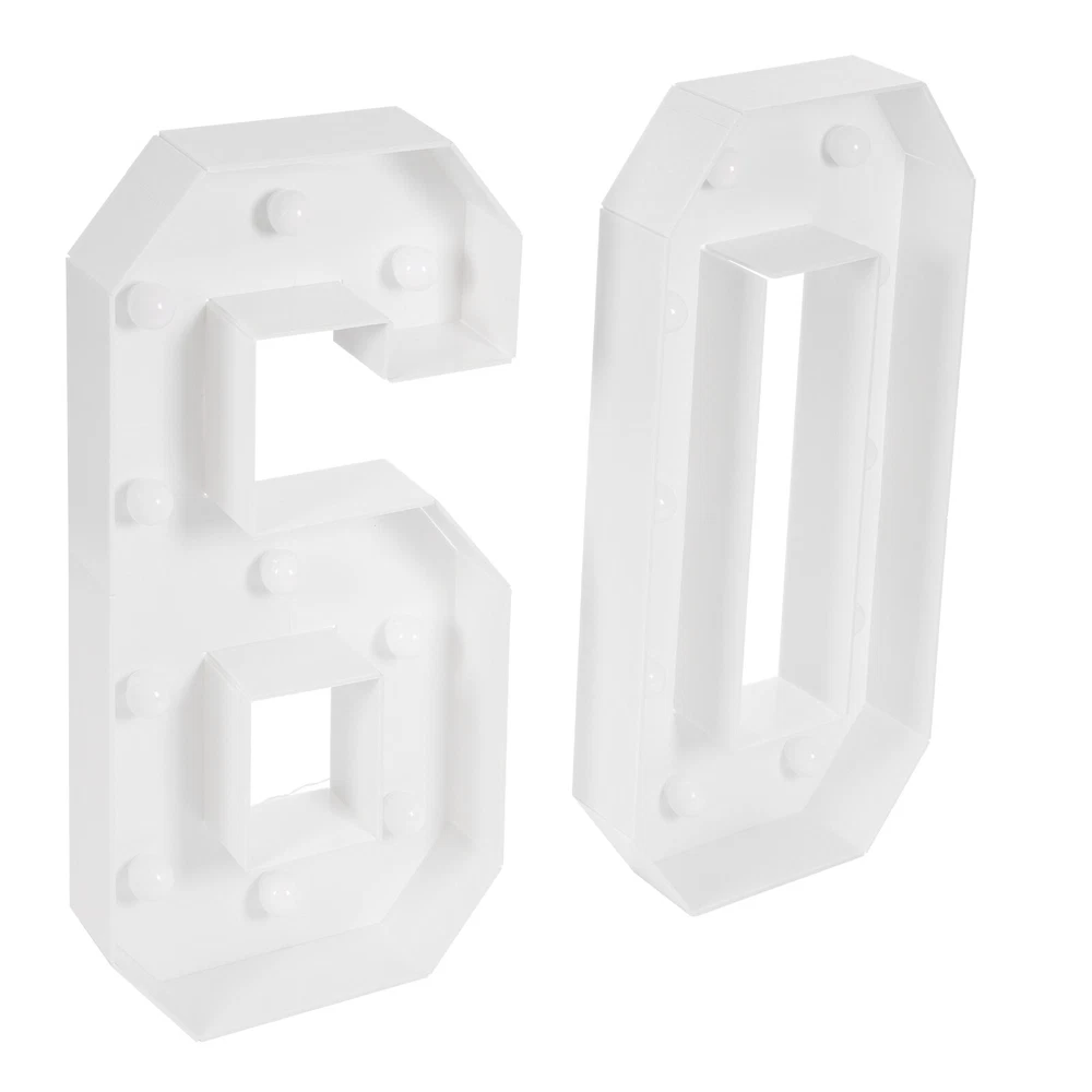 Package Included 1 Pair* 60 Light Up Numbers 2* Double-sided Tapes 2* Battery Boxes 20* LED Bulbs 1* English Manual Other Accessories for Assembly 60 Light Up Numbers, 60th Birthday Party Decoration Light Up Numbers NEW Description Eager to add a touch of extraordinary style to your birth celebration? These light-up numbers combine light and numbers to create a favorable atmosphere. It is not only a witness to time, but also an engraver of emotions and memories, tailor-made for your birthday party or anniversary. Use it at your birthday party or anniversary event, it will surely impress your guests and become an unforgettable memory! Key Features Build to Last : This product is mainly made of KT board with a machine cutting process, which is hard, abrasion, and corrosion- resistant to ensure long-term use. Excellent Light Source : 20 LED bulbs in warm colors with a color temperature of 2000-3000K not only give a warm and bright glow but are also energy-saving and create a great atmosphere. Battery Powered : Each digit is powered by 3 AA batteries (not included) and has a switch on its battery compartment that can be used to control the light, which can be turned on/switched off when needed for special occasions. Great Decoration : These numbers stand at 39.37in tall and come with a white number color and warm light color, presenting a retro style. It can make your birthday or anniversary party more beautiful and eye-catching. When the light is turned on, it becomes a number ornament. Great Gift : Thanks to its beauty and practicality, you can bring this product home to yourself, your lovers, or your family to enjoy a happy 60th birthday party. Personalize Your Backdrop : You can use balloons, flowers, or other decorations to decorate this product, creating a unique backdrop. Easy to Assemble : The frames are pre-cut, you just need to use double-sided tape to make them into 60 shapes and then put the LED bulbs into them, which is convenient and easy. Easy to Carry and Store : Its lightweight (2.43lbs) and detachable design allow you to take it around and it can be stored easily when it is not in use. Quality Service : We stand behind all our guests and look forward to assisting you with your purchase. It is our pleasure to answer your confusion and questions. The end of the story between us is not "we sell and you buy". Details Wide Bottom : The wide bottom makes the force area large, making the overall stability of the product good, and not easy to tip over. Smooth Edges : They not only enhance the aesthetics of the product but also improve safety during installation and use. Application It is suitable for birthday parties, anniversaries, and other celebration activities. Specifications Color: White Material: KT Board Process: Machine Cutting Style: Vintage Indoor/Outdoor Usage: Indoor Assembly Required: Yes Mounting Type: Floor Standing Power Source: Battery Powered EU Energy Label Efficiency Labeling Class: A++to E Efficiency: E Battery Type: 6* AA Batteries(Not Included) Light Source: 20* LED Bulbs(Included) Light Color: Warm Color Temperature: 2000-3000K Product Height: 100cm/39.37in Package Size: 41*25*19cm/16.14*9.84*7.48in Gross Weight: 1.25kg/2.76lbs Net Weight: 1.1kg/2.43lbs Package Included 1 Pair* 60 Light Up Numbers 2* Double-sided Tapes 2* Battery Boxes 20* LED Bulbs 1* English Manual Other Accessories for Assembly Notes Please do not use it in a high-temperature environment. Please note that batteries are not included in this product. Please read the instructions carefully and take note of the safety precautions contained therein. Please allow the slight color difference caused by the shooting light and the 1-3 cm error due to manual measurement, and make sure you do not mind before ordering. Payment Delivery details Terms of sales About us Contact us Payment We accept ebay payment 。 Fees such as import duties, taxes are not included in the item price or shipping costs. These charges are the buyer's responsibility. Delivery details Shipping: 2-9 working days to: USA Terms of sales We maintain high standards of excellence and strive for hundred percent customer satisfaction. Feedback is very important to us. We hope that you contact us immediately before you give neutral or negative feedback, so that we can address your concerns. It is impossible to address issues if we do not know about them! About us Your satis faction is our ultimate goal. We work hard to earn your trust and future business. Our certified technicians have tested each item before shipping. The unit comes with 1 year limited warranty on all manufacturing defects. a) If you receive a defective item, you may return it or ask for a discount. Please contact us within 14 days after you receive the package. b) What you returned must be intact and in its original packaging as re? u. Customer is responsible for shipping costs of the returned item. c) We will cover the cost of shipping back t with the shipping rate indicated in the registration page. We will send you a new unit or refund the full payment you paid. Thank you. Contact us Business Hour Business Hour: Monday To Friday: 8:30 AM to 5:00 PM (Beijing China time) Due to time zones, our reply to your questions may not be immediately. But within above working time, we will reply your email within 24 hours. If it's non-workdays, please kindly be patient and wait till Monday. Please contact us with ebay message. Please feel free to contact us if you have any questions. Monday To Friday: 8:30 AM to 5:00 PM (Beijing China time) Due to time zones, our reply to your questions may not be immediately. But within above working time, we will reply your email within 24 hours. If it's non-workdays, please kindly be patient and wait till Monday. Please contact us with ebay message. Please feel free to contact us if you have any questions. Feature! Stable performance, durable Brand Unbranded Type N/A Color White Material KT Board Process Machine Cutting Style Vintage Indo