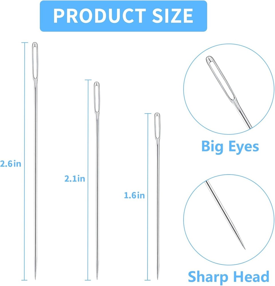 DTDNZKN 60 PCS Large Eye Hand Sewing Needles Set - 3 Sizes Leather silvery Description Features: 【Safe and Durable Materials】Upgrade your sewing experience with our premium stainless steel large eye pointed stitching needles. These needles offer sharp tips, a smooth surface, and exceptional durability. They are designed not to bend easily, and are resistant to rust and corrosion, ensuring long-lasting use. The small resistance through cloth and leather makes them effortless to use. 【Versatile Sizes】Our set includes 60 large eye sewing needles in three different sizes: 20pcs x 2.6 inch/67mm, 20pcs x 2.1 inch/54mm, and 20pcs x 1.6inch/42mm. With these various sizes, you can choose the perfect needle for your project, ensuring precision and efficiency in your sewing tasks. 【Wide Range of Applications】From handsewing and crafting to repairing carpets, upholstery, coats, tents, canvas, mattresses, embroideries, furs, leather, and more, these sewing needles are invaluable tools for all your sewing needs. Versatile and reliable, they will help you complete your projects with ease and precision. 【Effortless Usage and Portability】Each pack includes 2 bottles with a total of 30 pieces of sewing needles, neatly organized in tubes for convenient storage and easy access. Their compact and lightweight design makes them portable, allowing you to carry them wherever you go without taking up much space in your bag. Perfect for on-the-go use, these large eye needles are essential for all your sewing endeavors. 【Satisfaction Service】: We are confident in the quality of our sewing needles and offer satisfaction service. If you are not completely happy with your purchase, please reach out to us for a refund or replacement. Product Details: Brand: DTDNZKN Color: silvery Point Type: Sharp Unit Count: 60.0 Count Item Length: 3.3 Inches Manufacturer: DTDNZKN Item model number: FRZ060 Item Weight: 0.634 ounces Handling We will ship all orders within 3 business day of payment. Delivery We Do Not Ship Outside of the Continental US. Return Policy All items qualify for returns within 30 days of receipt. Buyer is responsible for return shipping on any item that is not damaged. Feedback We take our reputation seriously, we buy and sell online, so we understand the value of trust. If you are unsatisfied with your order, please contact us and we will work with you to resolve it to your satisfaction.