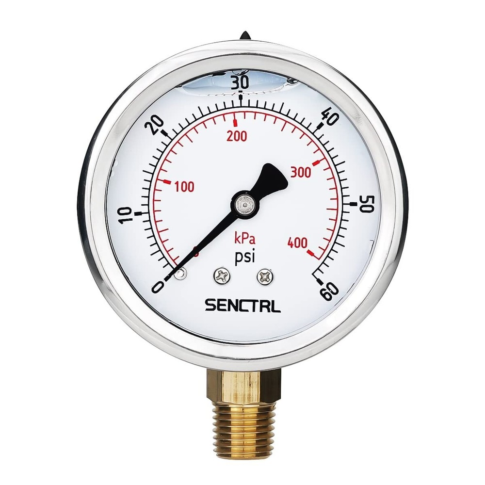 60 Psi Glycerin Liquid Filled Low Pressure Gauge, " Dial Size, 1/4" NPT Lower Mount, Stainless Steel Case, Pool Sand Filter Water Pump Tire Water Oil Air Pressure Test Brass and Stainless Steel wetted parts for measuring non-corrosive liquid and gas pressure. Such as Water Oil pressure test. Compatible with pool sand filter, water pump, pressure tester pressure regulator and etc. Circular dial is enclosed in a 304 stainless steel case for corrosion resistance. Glycerin filled inhibits pointer flutter and prevents damage to the internal mechanics from vibration and pulsation. Measures pressure with dual scale (0-60 psi/0-400 kPa). Display accuracy is + or - 3/2/3% over the entire range of the gauge IP67 waterproof prevent condensation inside caused fogging of the window. Offer clear reading. Lower mount male connection with 1/4" NPT thread