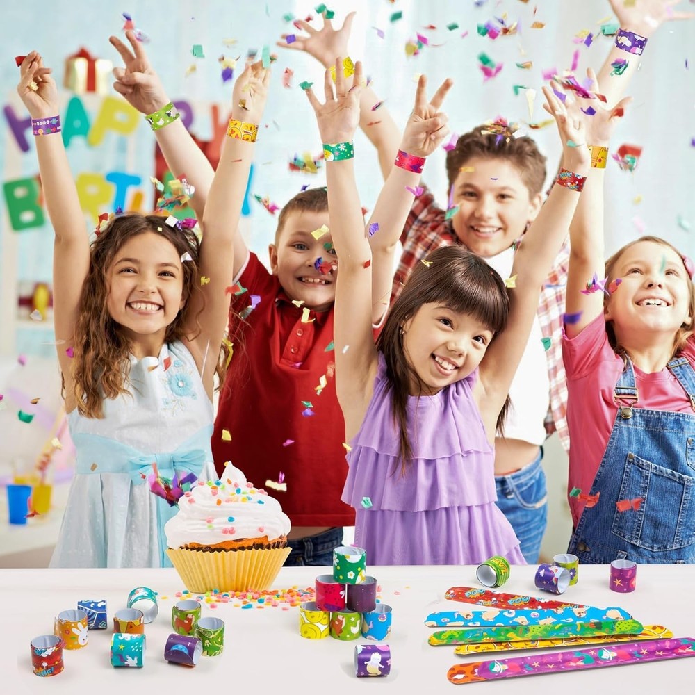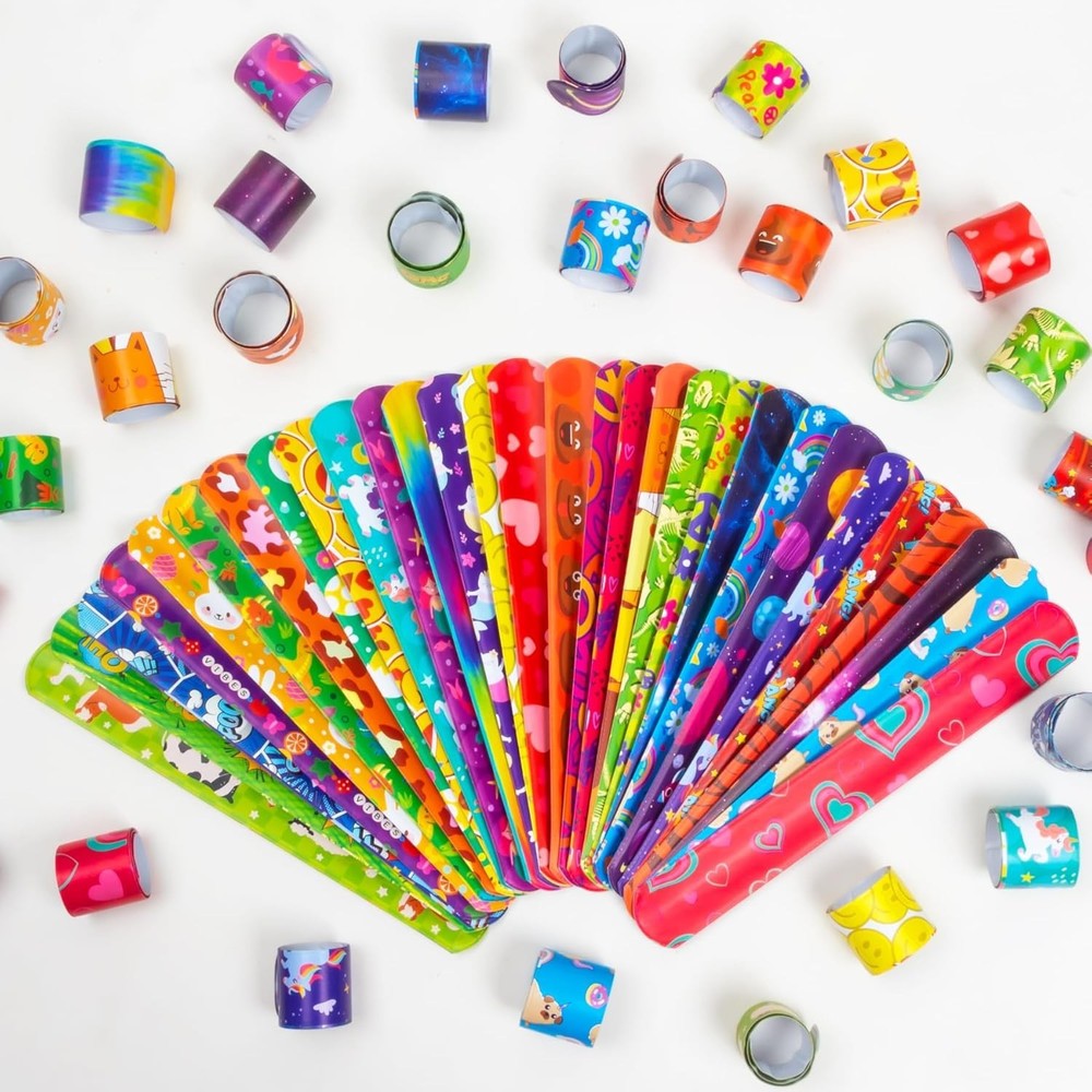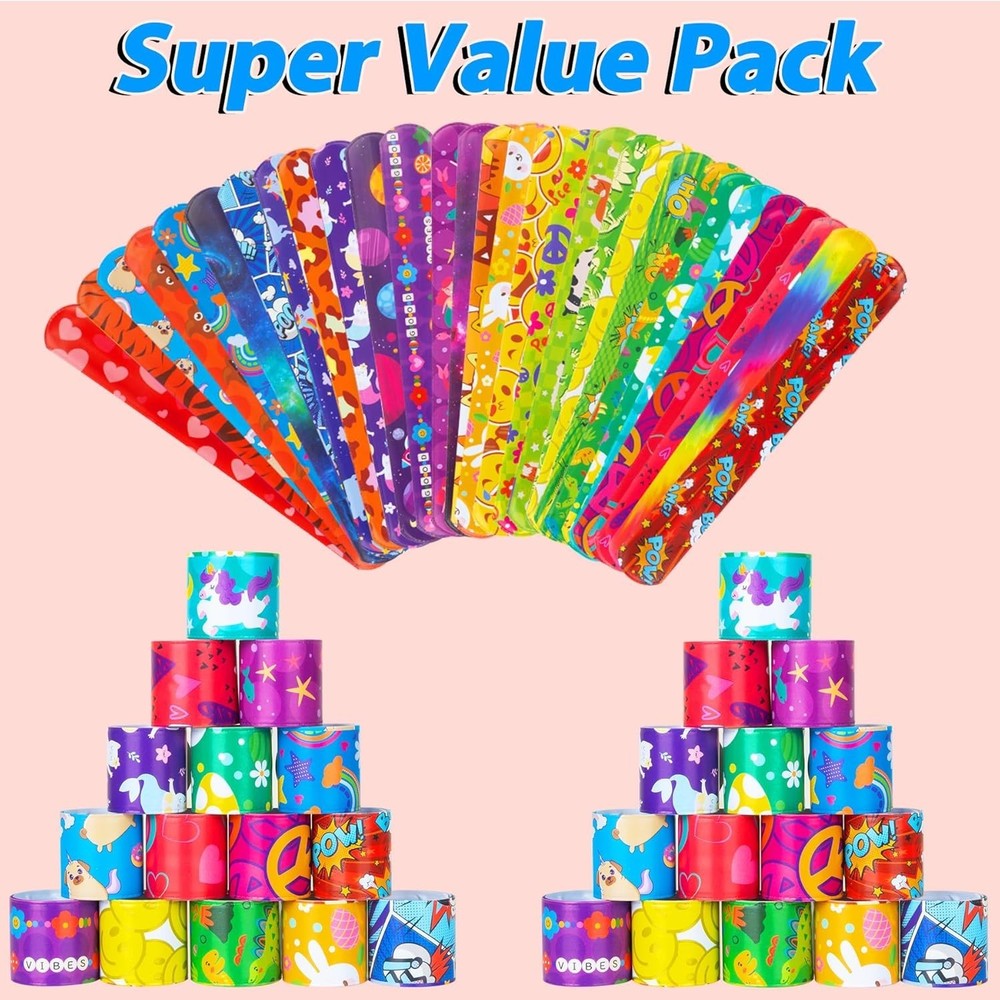 Diverse Designs for Every Taste: With 60 slap wristbands in 30 unique styles such as tie-dye, mermaids, dinosaurs, and galaxies, there's a design to suit every preference. Perfect for meeting the demands of a large group. Child-friendly and Safe: Covered in soft PVC, these slap bracelets are comfortable and safe for children to wear. Meeting U.S. toy safety standards, they are skin-friendly, non-toxic, and feature sewn edges with no metal exposure. Rest assured, they are 100% child-safe and approved through rigorous safety testing. Ideal for Parties and Gifting: Stuck on what to give for a birthday or classroom gift exchange? Look no further! Our unisex slap bracelets make perfect party favors and gifts, with 24 different designs ensuring there's a favorite for every child, whether boy or girl. Efficient and Secure Functionality: Tired of flimsy slap bracelets that don't stay in place? Our products are the solution! Through significant investment in research and development, our slap wristbands seamlessly form a perfect circle on your wrist in an instant. Firm, secure, and guaranteed not to fall off or cause any discomfort. Versatile and Multi-purpose: These high-quality slap wristbands are not just for parties but also suitable for kids' party favors, goodie bag fillers, class rewards, office parties, Valentine's Day exchanges, crafting tables, or themed parties. A must-have for any occasion!