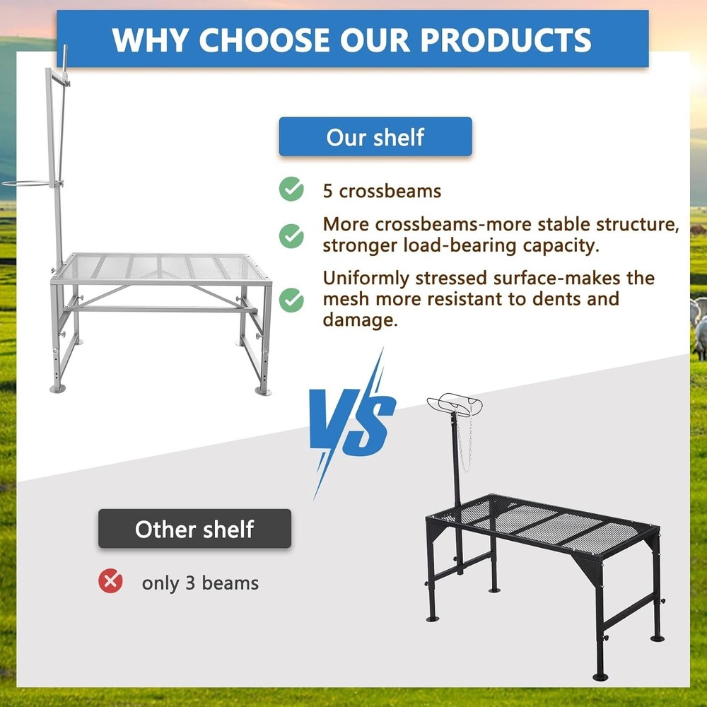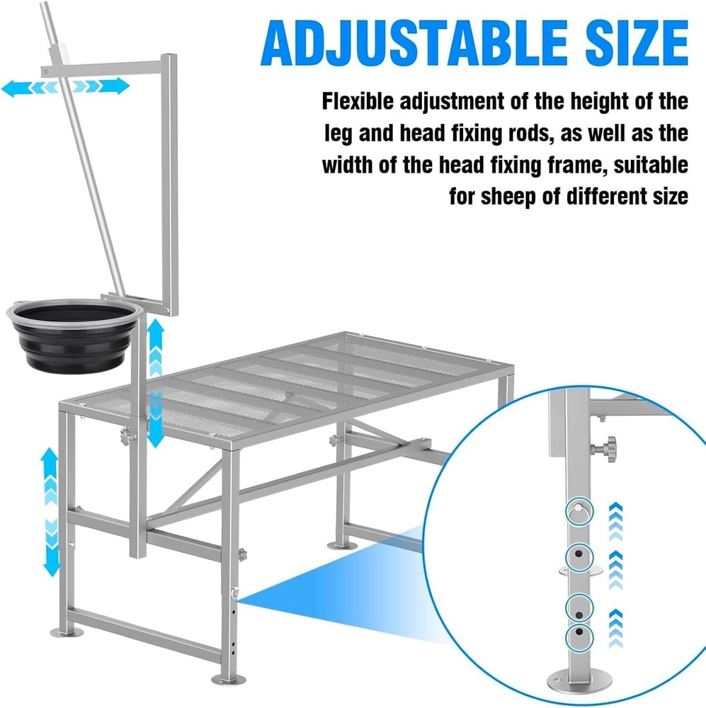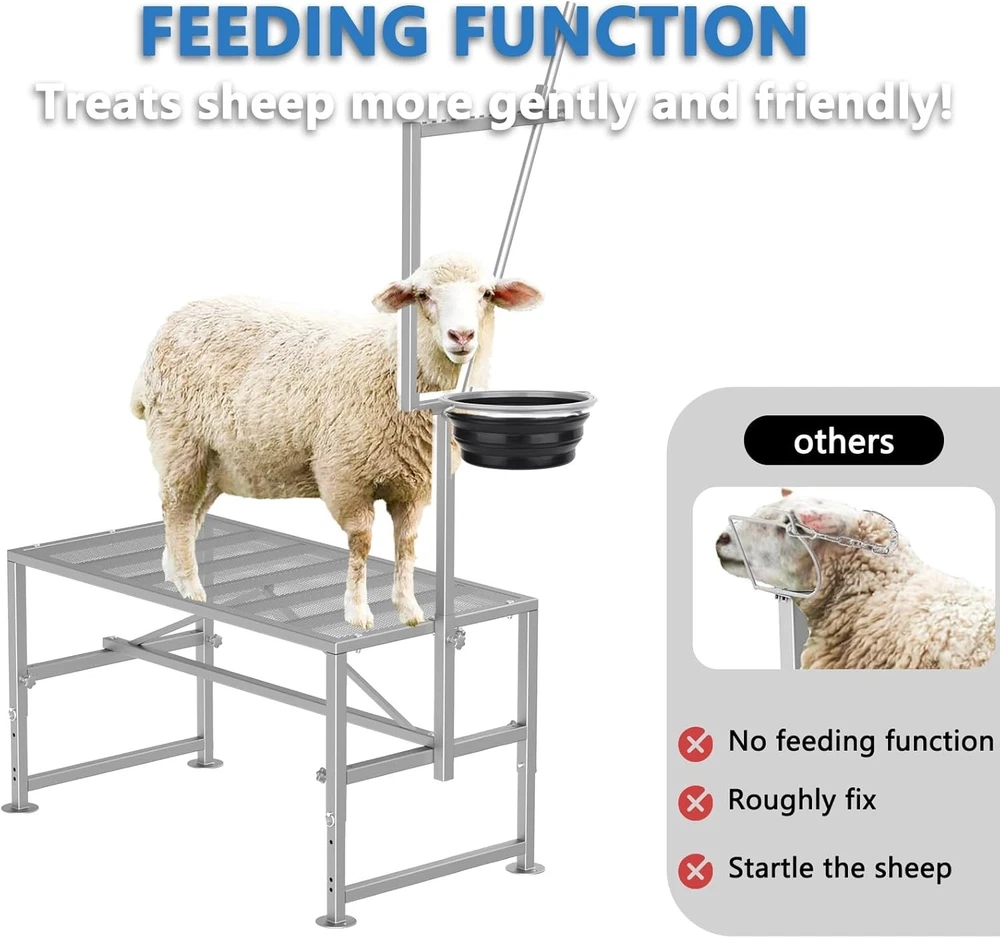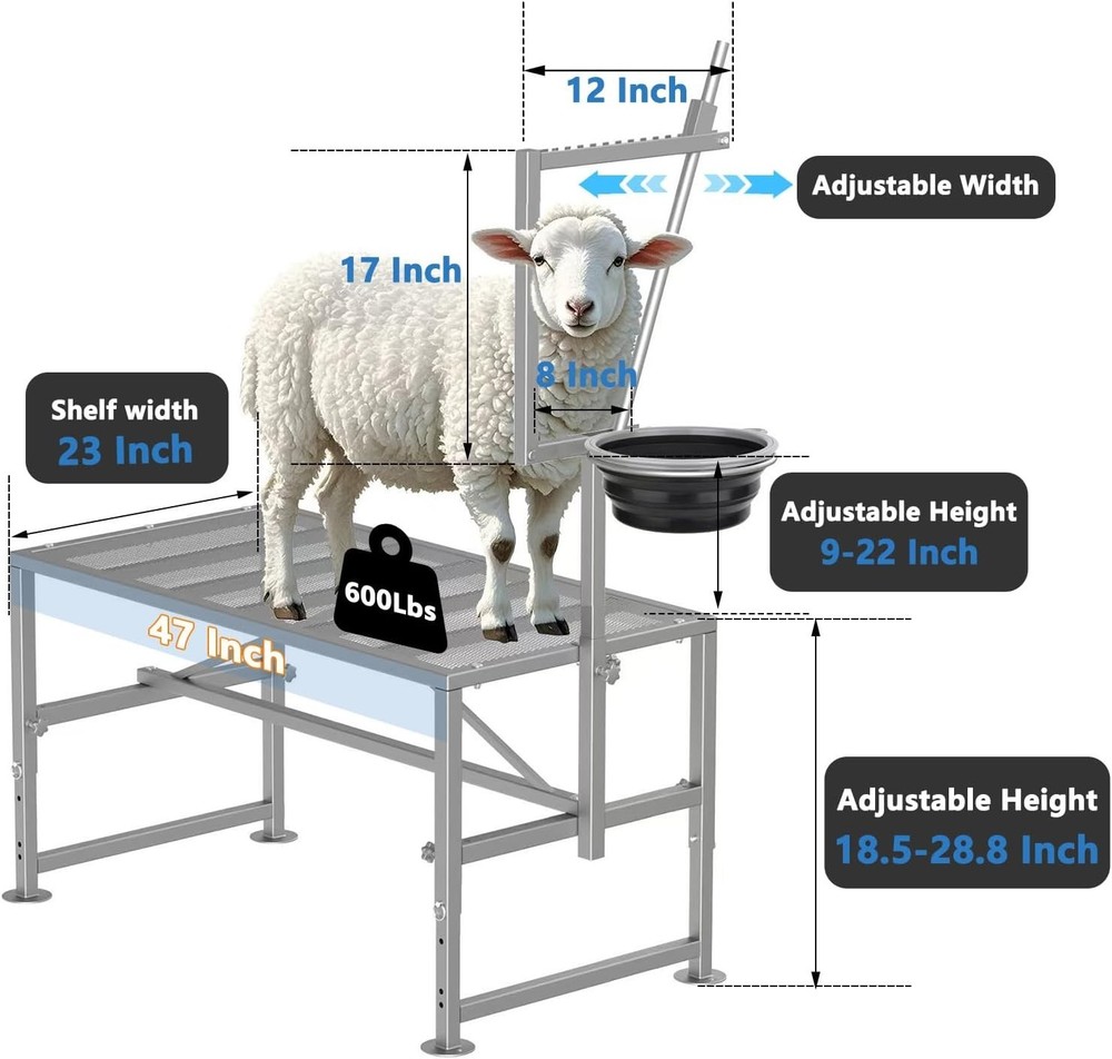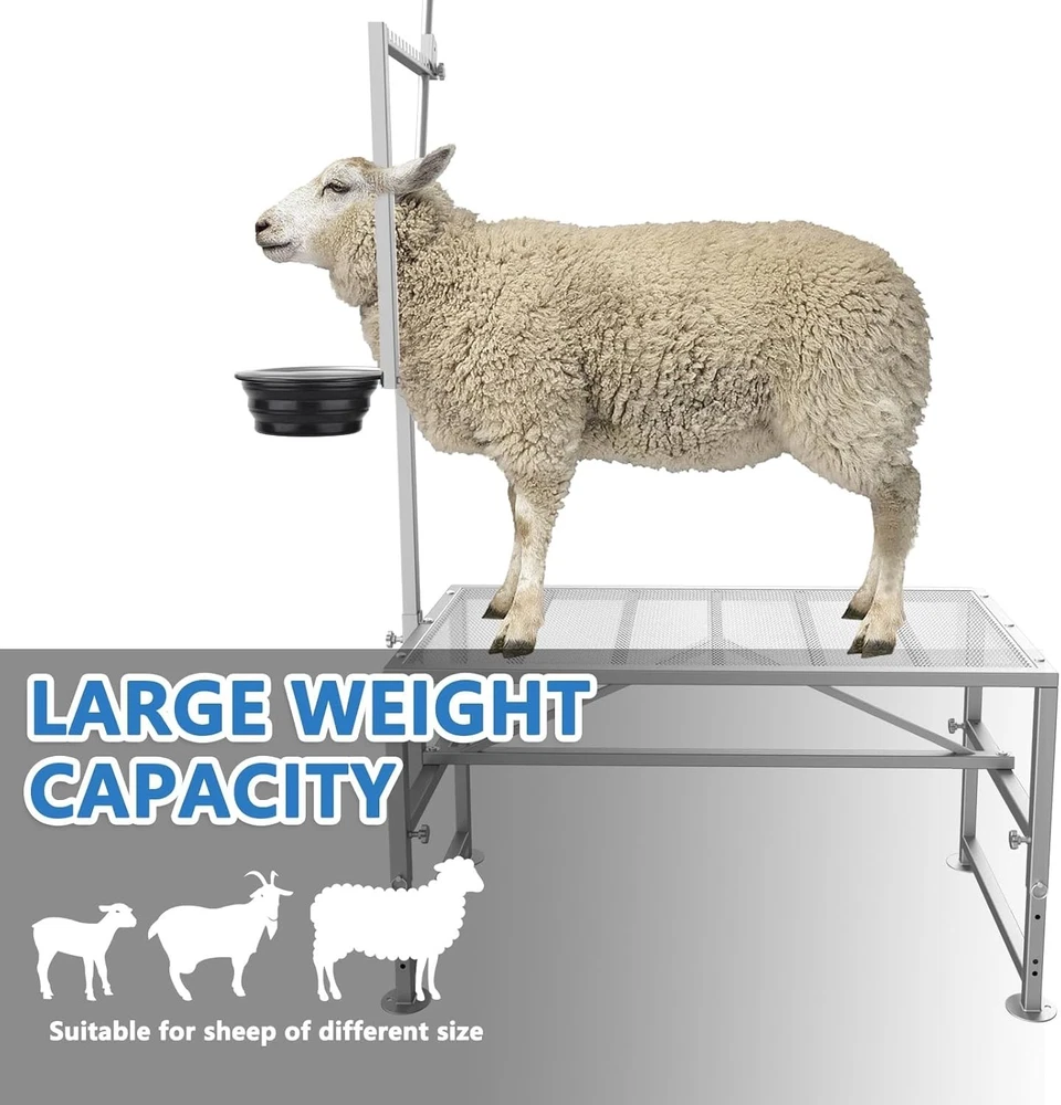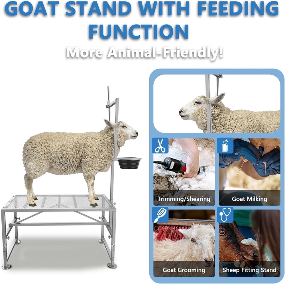 About this Item Sturdy 600LBs Goat Stand: Two additional load-bearing beams have been added In order to reinforce the expanded metal and to support up to 600LBs for adult sheep; The stable triangular frame design makes the sheep rack very sturdy and stable Feed Bin Design: Goat milking stand with feeder design, unique designed for goat trimming/goat milking, which makes tasks easier than ever! Adjustable Goat Stand: Adjustable design of the goat trimming stand,makes it easy to use for different sheep. You could easily adjust the height of leg and head pole based on the height of the sheep; What's more, it's easy to adjust the space for fixing the head according to the size of the sheep's head Easy to Put Together: Simple instruction design, easy to understand and put together. Nice light weight for one person to easily handle and move around Quality Material: This goat milking stand is made of quality iron, adopt Spray coating process surface, which is durable, long lasting and corrosion/rust prevention Description Are you troubled by securing stubborn goats during chores such as milking and hoof-trimming ? Make your goat milking and hoof trimming needs a breeze with our goat milking and hoof trimming stand ! Adjustable Size for both dwarf-sized / standard size goats / larger sized goats such as nubians! 600LBS Sturdy Stand 5 load-bearing beams on the panel, which enhances the load-bearing capacity and can support up to 600LBs ! Stronger stability and lightweight goat and livestock stands, sturdy enough for large goats such as Nubians ! Feed Bin We offer a feed bin to make tasks easier than ever! With our goat milking stand with feed bin your goats can be secured for a safer, healthier herd. Adjustable Size- for different sized goats Reinforced Structure-Sturdy/No shake during use 600LBS -Strong enough for larger sized nubians Use for- Goat milking/ Hoof trimming/ other livestock appliance Makes your goats be safer, healthier with our goat stand with feeder! Product Details Package Dimensions 49.5 x 25.5 x 4 inches Item Weight 36 pounds