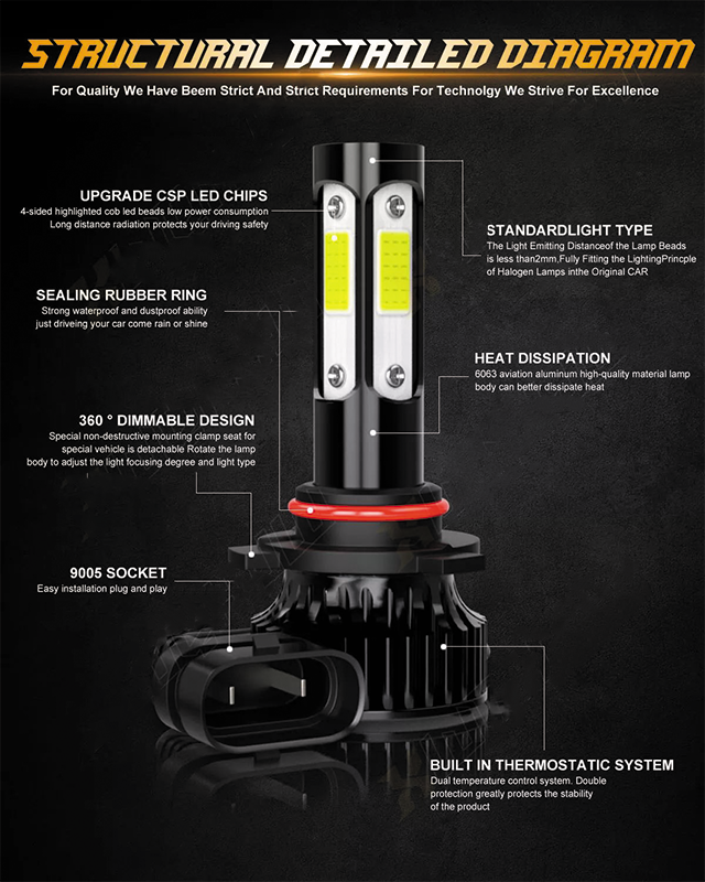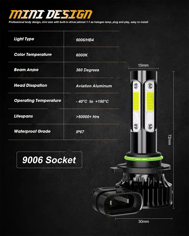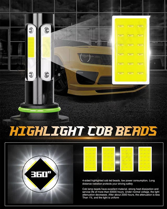 Note: ● Compatible List can not show up all Car model. Please confirm whether the item matches your car before you purchase. ● You also can send us your car informations (Maker, Model, Year), so we can find the right bulb size for you. This listing compatible with 2 Pairs (9005 + 9006) 6000K white super bright LED headlight high beam + low beam bulbs conversion kit. Specifications: ● Bulb Socket: 9005/HB3 high beam + 9006/HB4 low beam ● LED Quantity(each bulb): 4pcs* chips (4-sides) ● Technology: Bulit in driver ● Operating Voltage: DC 9V ~ 32V , Fit for 12V & 24V vehicle ● Wattage: 50W per bulb ● Luminous Flux: 20000 LM per set ● Color temperature: 6000K cool white ● Material: Aviation 6063 aluminum profile ● Beam Angle: 360 degree ● Operating Temperature: -40 - +85 degree Celsius ● Waterproof Rate: IP68 rated Waterproof and dust seal, works well even in extreme weather ● Smallest body size: Smaller than other 4-sided LED bulbs on the market, no interference with the dust cover. ● Lifespan: over 50000 hours life time, stable quality and long service life ● Application: headlight, high beam + low beam Two-way heat dissipation channel: 1. All-in-one aluminum profile as heat conduction system, 360 degree heat radiating. 2.High speed mute fan(12000R/min), high air flow for faster cooling rate. Package Include: ● 2x 9005 LED headlight high beam bulbs ● 2x 9006 LED headlight low beam bulbs On Nov 20, 2024 at 05:08:55 PST, seller added the following information: