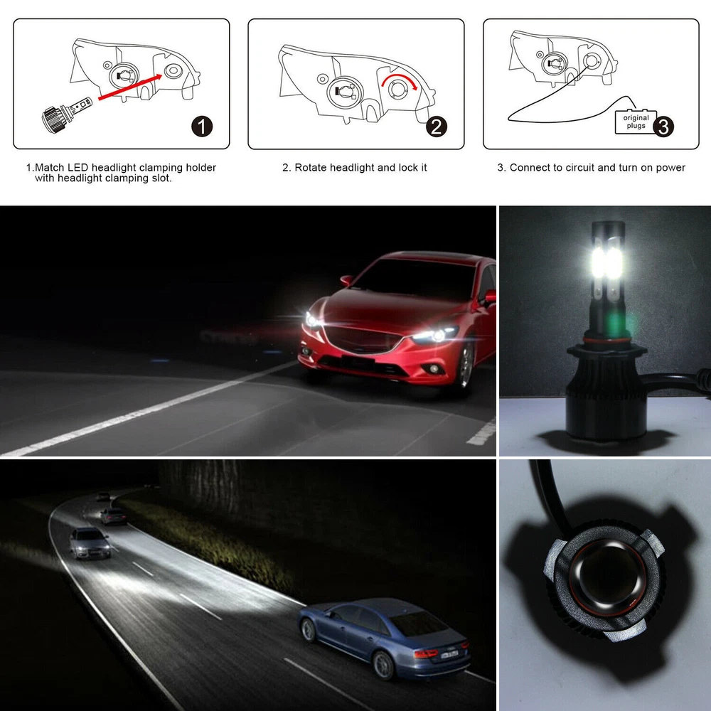 This package includes HB5(9007) LED Headlight + H11(H8) Fog Light Bulbs. If you are unsure your bulb type, please do remember send message to tell us your car make, model, year and other information which is helpful to check bulb type. for example: 2004 Ford F-150, high/low beam 2015 RAM 1500 with projector-type, high beam Package Included: 2 x LED Headlight Bulbs 2 x LED Fog Light Bulbs New and old packaging will be shipped randomly! LED Headlights Bulbs: HB5(9007) LED replacement bulbs are engineered for superior performance, exceptional looks, and increased safety. Especially designed for upgrading the Headlight bulb Bulb Size: HB5(9007) Beam Type: High Low Beam Color Temperature: 6000K - White Wattage: 50W Lumens: 6000LM Working Voltage: DC 9V to 32V Waterproof Level: IP68 Material: Aluminum alloy Lifespan: > 30,000 Hours Product Advantages : High brightness: The latest cob with 6000K cool white LED chip; 200% brighter than the existing halogen headlights. Advanced technology ensures perfect beam patterns without any black spots. Glow on all sides: 360 degree no dead angle lighting, use more clear and bright at night Strong heat dissipation: equipped with highly silent heat dissipation fan, speed up to 12000/min, heat dissipation efficiency, can avoid temperature accumulation on the beads, prolong the service life of the beads. IP68 waterproof: using integrated radiator and aluminium body self-cooling, waterproof and heat-proof. Even in extreme cases, the enclosure of the rainproof driver can work properly. Automatic short circuit protection. Simple Installation: Installation only takes 10 minutes. No relay. There is no capacitor. No additional wiring. Plug and play. LED Fog Lights Bulbs: Bulb Size: H11/H8 Voltage: DC 9V to 36V Color Temperature: 6000K Wattage: 80W Lumens: 1600LM Color: White Lifespan: >30, 000 hrs This new product has high luminous efficiency, low power consumption and long service life. Easy installation, Direct plug in and play. Best used for Fog/ Driving lights/ Daytime Running Light DRL Faster on/ off response time Energy saving, environmental protection, Stable performance, through strict test, Use safer driving