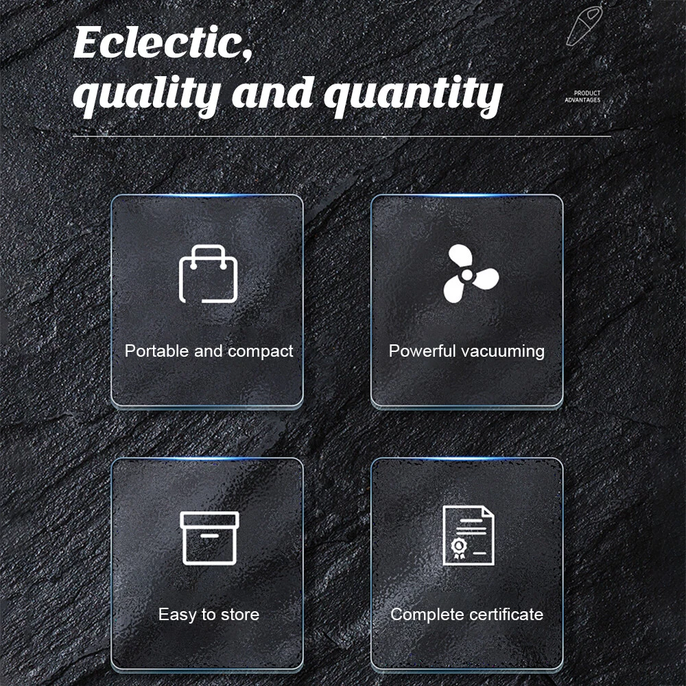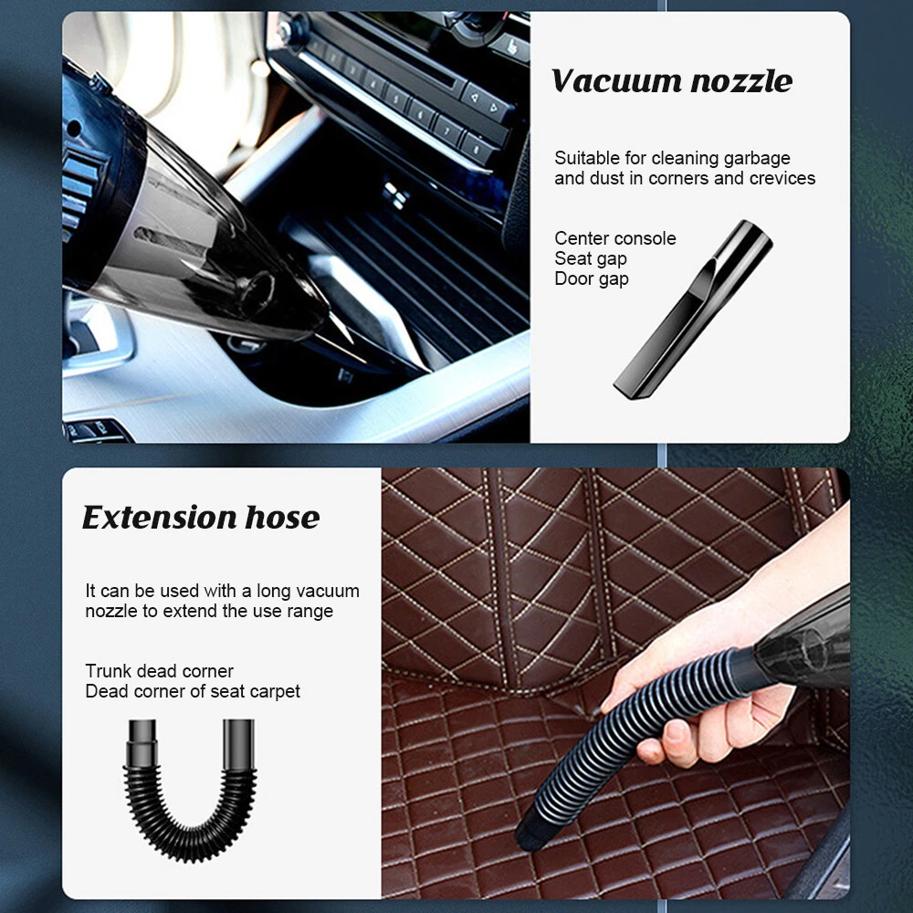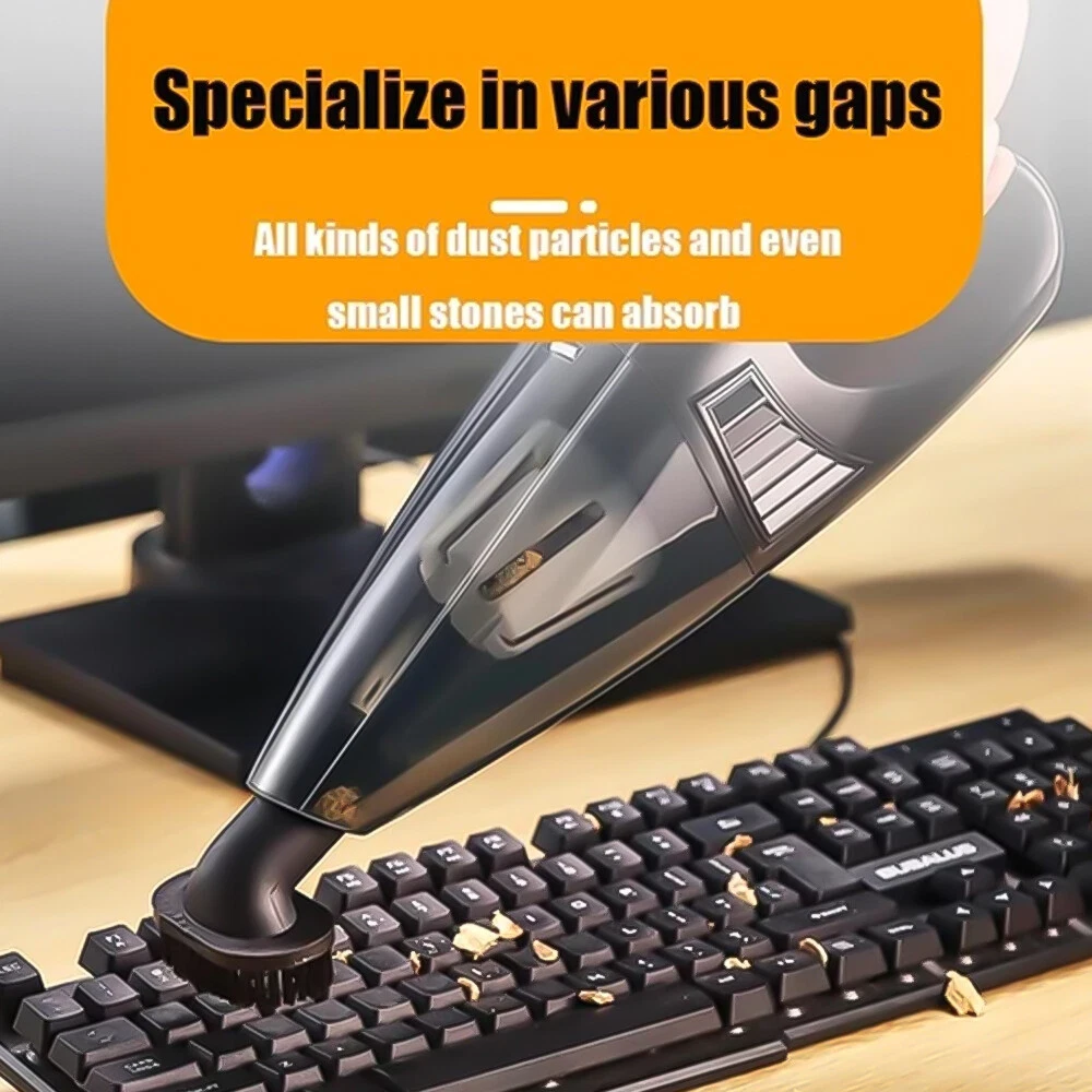 A:6000Pa Vacuum Cleaner Features: 6000Pa strong suction power, with rotating speed up to 39 000rpm. Dry wet amphibious & Strong suction. Easy to vacuum dust, debris, hair, liquid, paper... etc. D ifferent vacuum nozzles to work on any desired area. Portable, light-weight, easy to store and carry. USB charging, convenient and fast. Specifications: [product name]: hand held vehicle vacuum cleaner [product color]: black Vacuum degree: about 6 000kpa Rated power: 120W Product noise: less than 70db Rated voltage: 7.4V Product battery: built -in 1500 mAh*2 lithium battery Rating speed: 39000 (R/min) Packa ge Included: 1 x Cleaner 1 x Brush nozzle 1 x extension hose 1 brush head 1 x User Manual ============================================ B:Mini Vacuum Cleaner Describe : 1. Material: Using high-quality ABS material + electronic components, upgraded temperature control technology, no heat after long-term use, effective and fast suction of stubborn dust 2. Design: Lightweight design, change the gravity design, as light as 213g, you will not get tired when holding it for a long time, making cleaning a kind of enjoyment 3. Reuse: Nano dust-locking filter is used, which can be washed repeatedly, breathable and dust-proof, and more environmentally friendly after repeated use 4. Bass operation: Acoustic noise reduction design, sound <68 decibels, comfortable operation without disturbing, cleaning without worrying about affecting family rest 5. Charging method: smart USB charging interface, compatible with a variety of charging methods, notebooks, charging treasures, computers, etc., charging and using 6. Long-lasting battery life: built-in large-capacity lithium battery, 2000 mAh battery, can be used continuously for more than 30 minutes, easy to deal with daily cleaning 7. Applicable to: gaps in the car, sofa carpets, desks, computer keyboards, bookshelves, hair on the bed, drawers, pianos, etc. can be used in various scenes that cannot be cleaned Specific ation : Name: Wireless Vacuum Cleaner USB Rechargeable Handheld Mini Car Vacuum Cleaner Colour: Black Rated voltage: 7.4V Rated power: 120W Rated speed: 2000 (r/min) Vacuum suction: about 6000 Pa Dust cup capacity: 0.1L Charging method: Type-C charging Battery: built-in rechargeable lithium battery Battery capacity: 2000mAh Charging time: 3.5h Battery life: about 15minutes Product size: 18.5*5.5cm Product net weight: 213g Packa ge list: 1*vacuum cleaner 1*suction nozzle 1*hair brush 1*blowing hole 1×filter 1*charging cable 1*manual Instr uctions for use: 1. Check whether the charging is sufficient, and the filter must be installed when using it 2. Just turn on the switch, the front cover cannot be removed when the motor is rotating 3. Replace different suction nozzles according to different usage occasions 4. If the vacuum cleaner is dirty or the suction is not strong, please clean the filter in time to ensure the normal operation of the vacuum cleaner 5. Do not expose to direct sunlight, and do not use in places with high temperature and high pressure