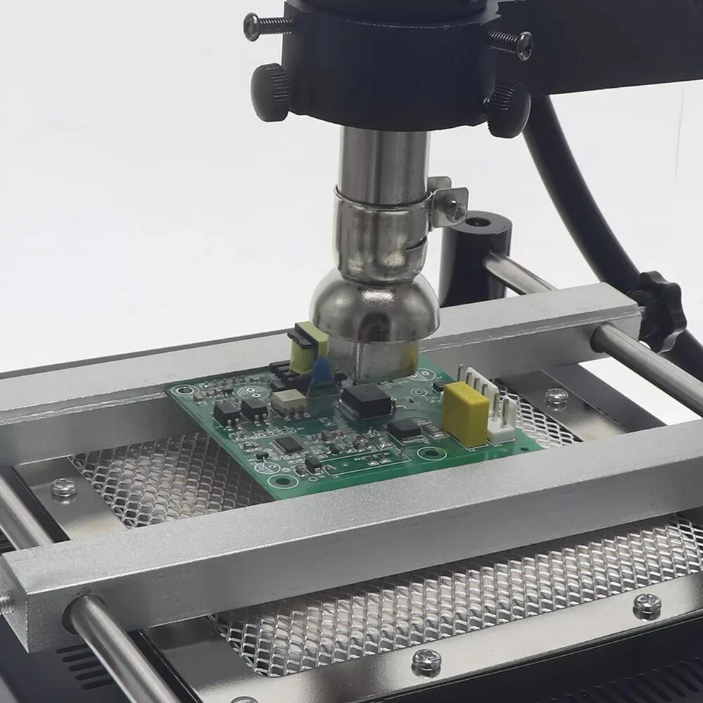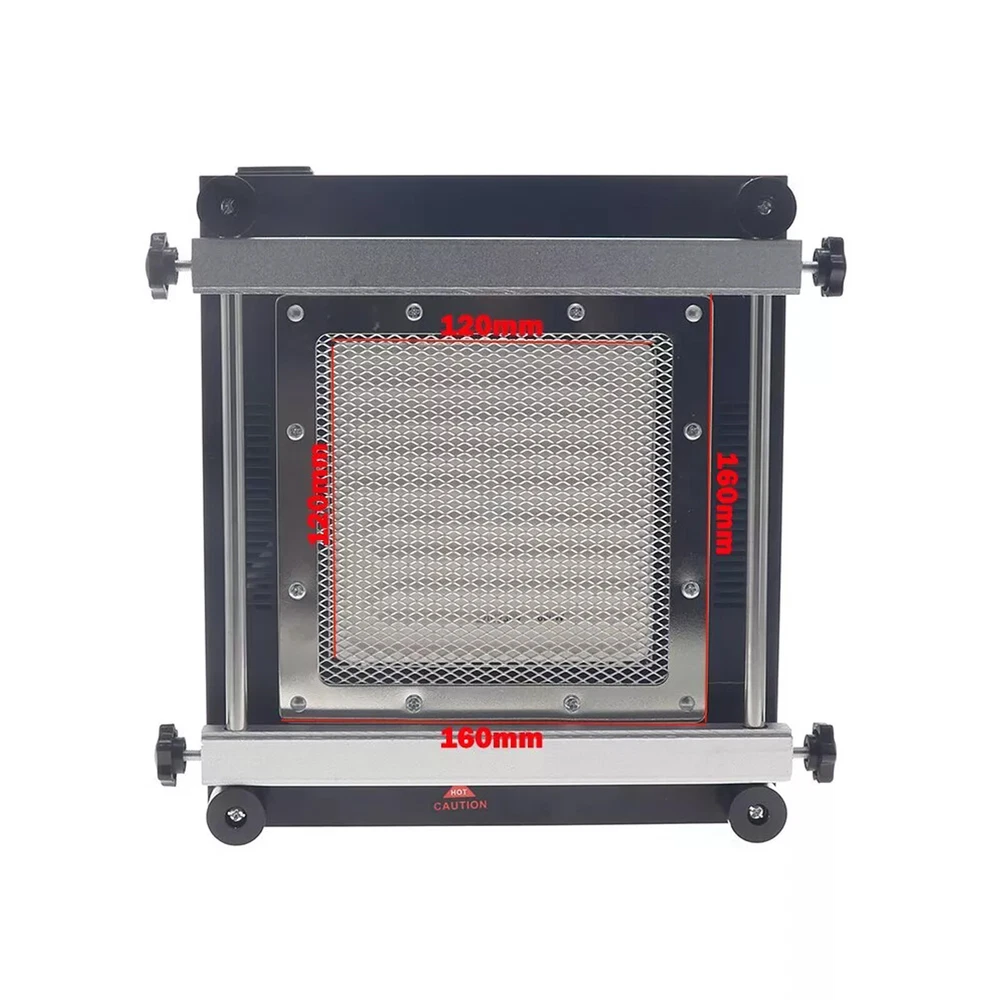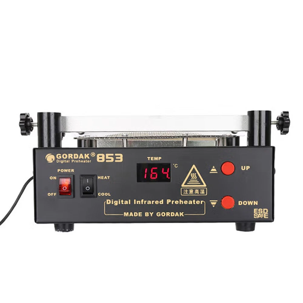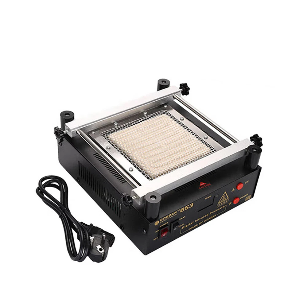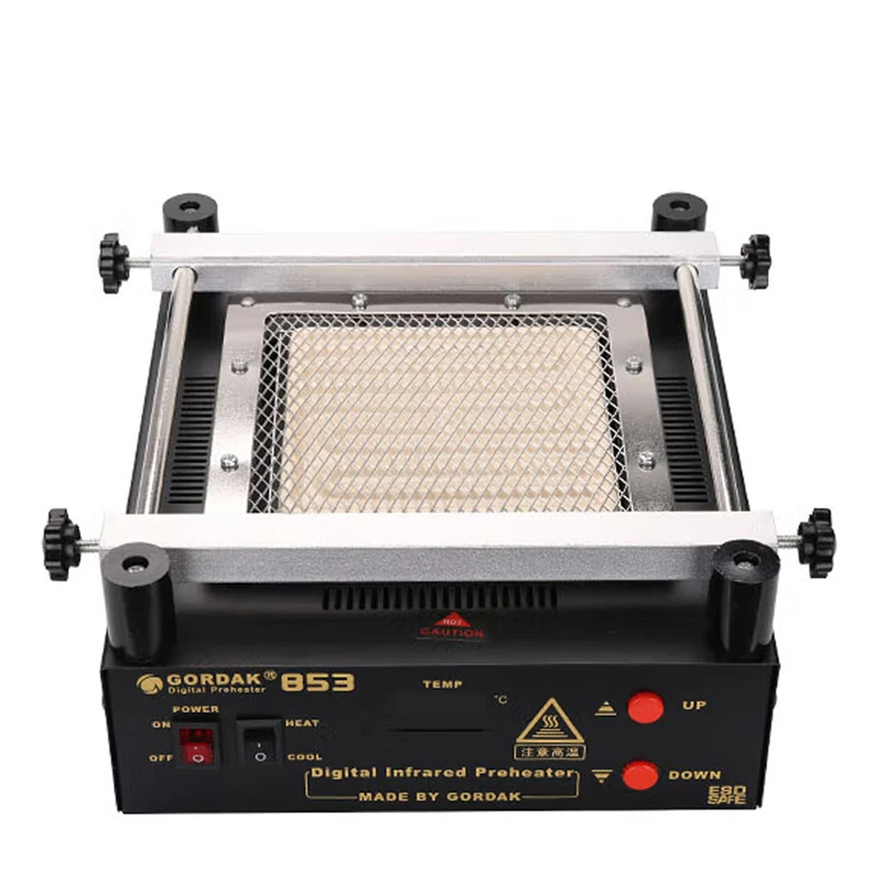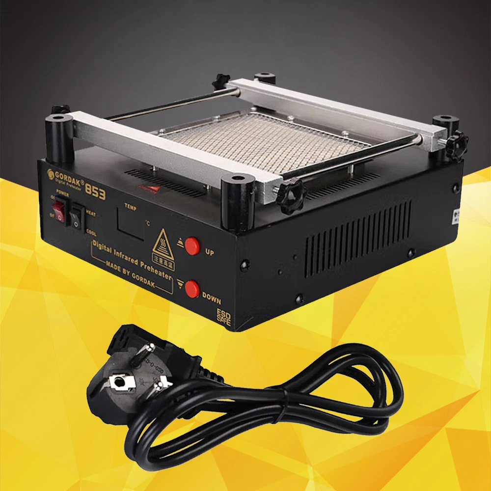 Gordak 853 Bottom Heating Preheating Station PCB Preheater Soldering Station BGA Rework Station Phone Repair Tools Feature: 1. ESD safe by design, wide temperature area design de-soldering system, high precision intelligent control circuit, LED display, easy operate. 2. Use big power 120mm*120mm far infrared heater, rapid heating. 3. Original heat insulation by design, increase the temperature erea greatly. 4. Could remove could soldering, fit for deal with big area BGA and computer mainborad extend groove's knock down and fix. Technical Specifications Technical Parameter: Brand: Gordak Model: 853 Rated voltage: AC230V Maximum power: 605W Heating method: Infrared heating plate Temperature range: 100 -500 Celsius Heating size: 120x120mm Dimensions: 221x251x112mm Weight : 3.5KG