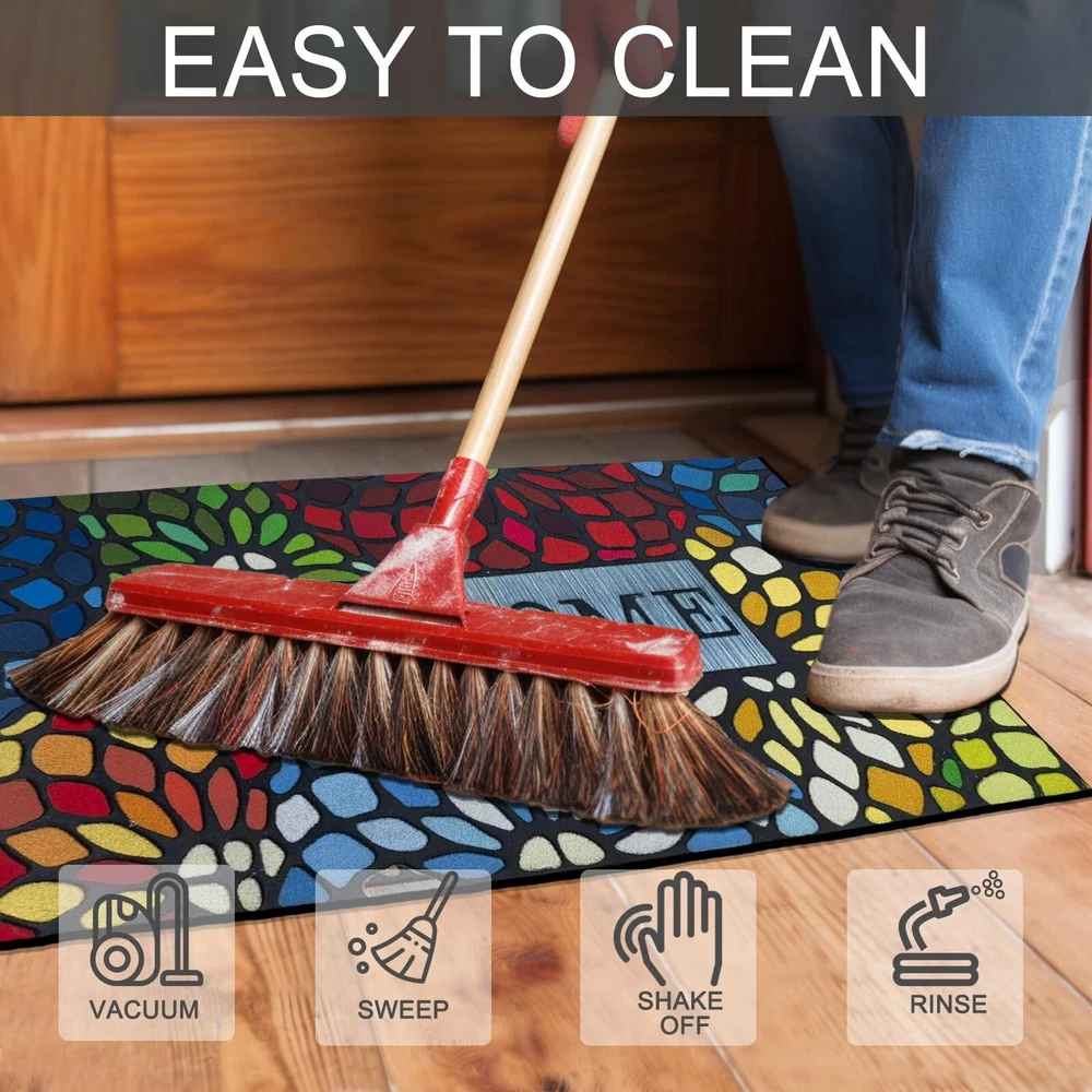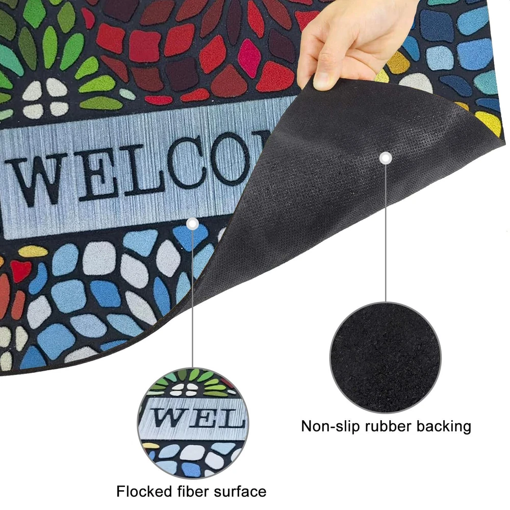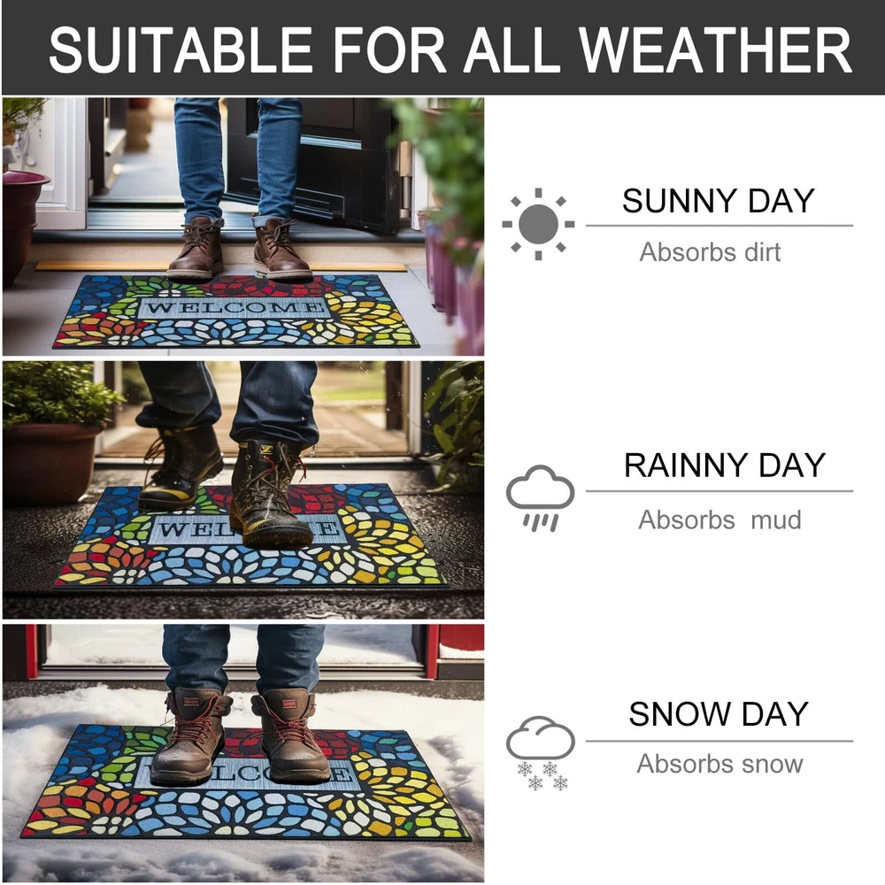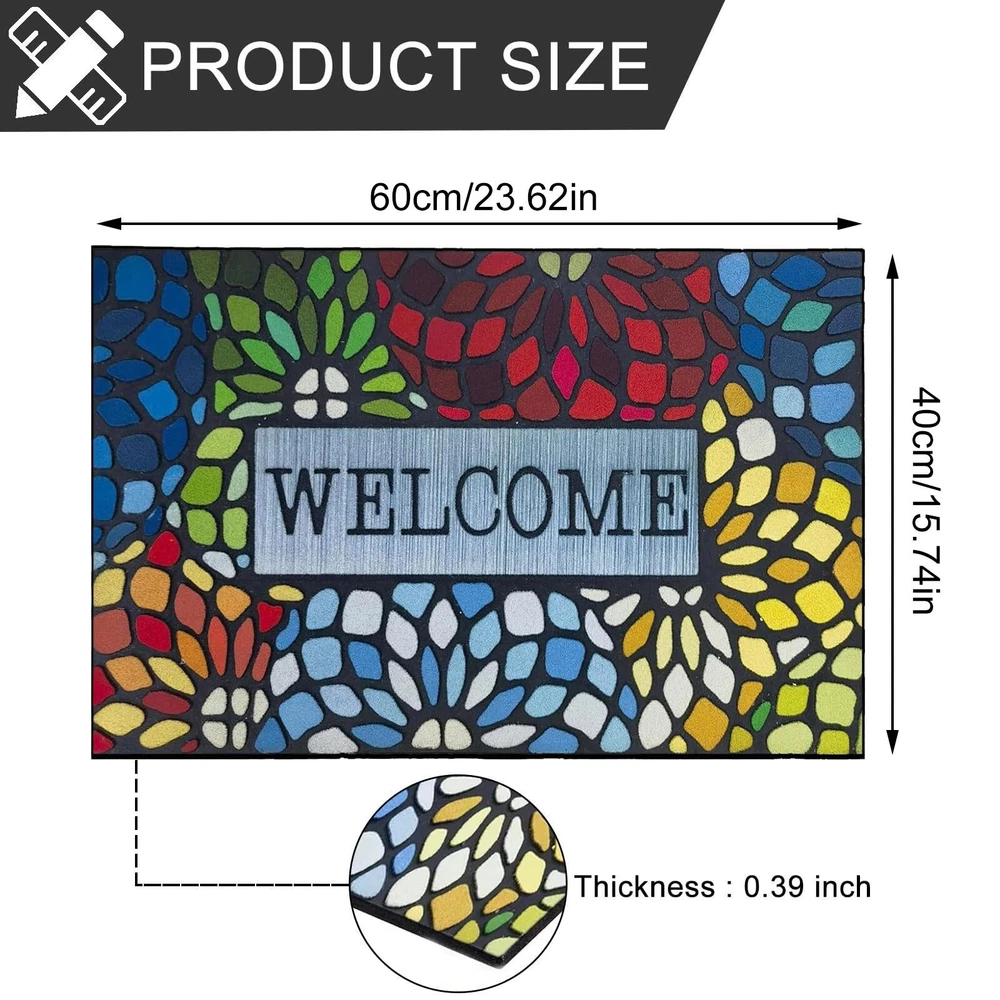 Outdoor Front Door Welcome Mat For Home Entrances Outdoor Entrance Mats Exterior Entrance Mats Features: UNIQUE MATERIAL AND DESIGN: Made of sturdy rubber, the mat is strong and to wind and snow in winter. Flocked fiber surface is beautifully designed. It is designed to be durable. ABSORBS AND DIRT, : The unique fabric helps trap dirt in its patterned grooves, magically leaving muddy footprints. our doormat is . You can simply sweep, vacuum or hose it down. Hassle- and easy to care for. NO MORE SLIPPING, CAN BE USED ANYWHERE: this durable mat has a strong non-slip rubber backing that adheres to any type of exterior flooring without leaving marks and strong edges for a sleek, durable look. Can be used in multiple areas: such as indoor front door mats, outdoor welcome mats, indoor and indoor entrance mats, household floor mats. Multiple uses for front porches, bathrooms, laundry rooms, cabins. SPECIAL AREAS: Can also provide special areas for to sleep or feed. Product Description: Outdoor front door welcome mat for home entrances, outdoor entrance mats, exterior entrance mats Material: Plastic Color: as the picture shows, (Due to the difference between different monitors, the picture may have slight color difference. please make sure you do not mind before ordering, Thank you!) Package weight: 200g Package size: 40x60x5cm,(Please allow 1-3mm error due to manual measurement. please make sure you do not mind before ordering.)