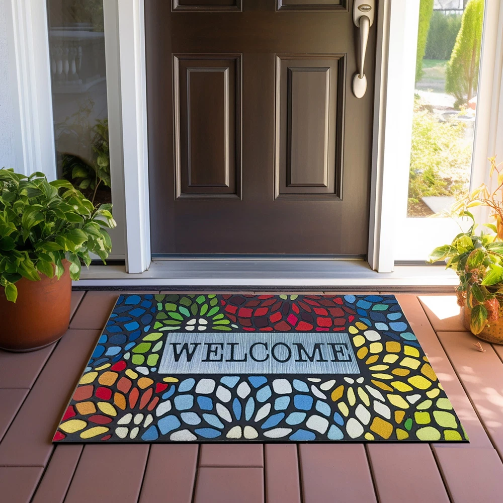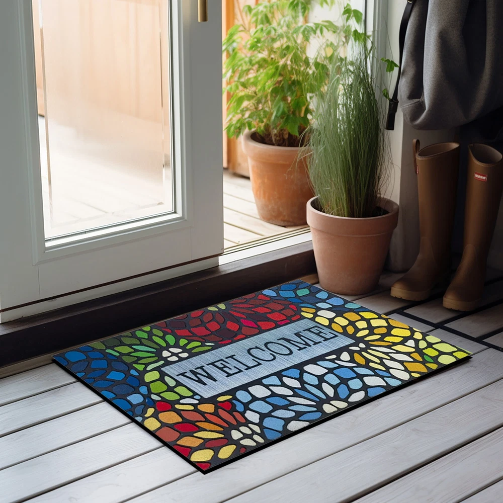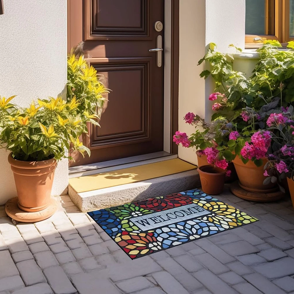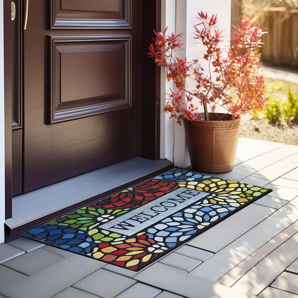Outdoor Front Door Welcome Mat For Home Entrances Outdoor Entrance Mats Exterior Entrance Mats Features: UNIQUE MATERIAL AND DESIGN: Made of sturdy rubber, the mat is strong and to wind and snow in winter. Flocked fiber surface is beautifully designed. It is designed to be durable. ABSORBS AND DIRT, : The unique fabric helps trap dirt in its patterned grooves, magically leaving muddy footprints. our doormat is . You can simply sweep, vacuum or hose it down. Hassle- and easy to care for. NO MORE SLIPPING, CAN BE USED ANYWHERE: this durable mat has a strong non-slip rubber backing that adheres to any type of exterior flooring without leaving marks and strong edges for a sleek, durable look. Can be used in multiple areas: such as indoor front door mats, outdoor welcome mats, indoor and indoor entrance mats, household floor mats. Multiple uses for front porches, bathrooms, laundry rooms, cabins. SPECIAL AREAS: Can also provide special areas for to sleep or feed. Product Description: Outdoor front door welcome mat for home entrances, outdoor entrance mats, exterior entrance mats Material: Plastic Color: as the picture shows, (Due to the difference between different monitors, the picture may have slight color difference. please make sure you do not mind before ordering, Thank you!) Package weight: 200g Package size: 40x60x5cm,(Please allow 1-3mm error due to manual measurement. please make sure you do not mind before ordering.)