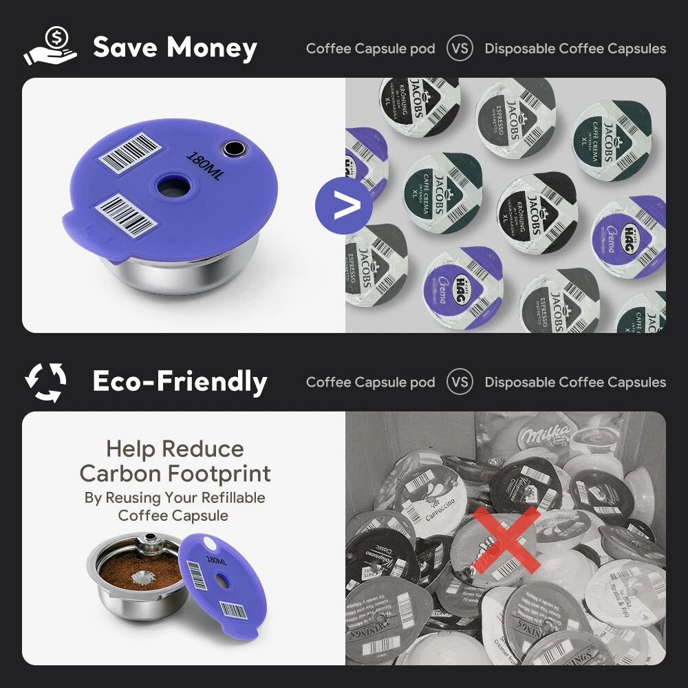 Product Description If you have any questions, please contact customer service first, do not open disputes easily, thank you! Feature: REUSABLE, saving money, saving earth. Protecting our earth is everyone's duty. BREW YOUR OWN FLAVOURED AND FRESH COFFEE, make your life unique. SAFE TO USE, make of food-grade plastic, BPA FREE, LEAD FREE. Specification: Product nam:Refillable Capsules for Tassimo Material:304 Stainless Steel & Food Grade Silicone Capacity(options):60ml/ 180ml/200ml/220ml Compatibility Models: For TASSIMO HAPPY SERIES For TASSIMO VIVY SERIES For TASSIMO SUNY SERIES For TASSIMO MY WAY SERIES Kindly attention: Please double check whether your coffee machine is in the above list compatible or not before buying. If you still are not confirmed, please tell us throuh first. Package Included: 1*Reusable Capsule Pod 1*Plastic Spoon 1*Plastic Brush Note: Due to the different monitor and light effect, the actual color of the item might be slightly different from the color showed on the pictures. Thank you! Please allow 1-2cm measuring deviation due to manual measurement. About Us We accept all payments authorized by eBay. powered by
