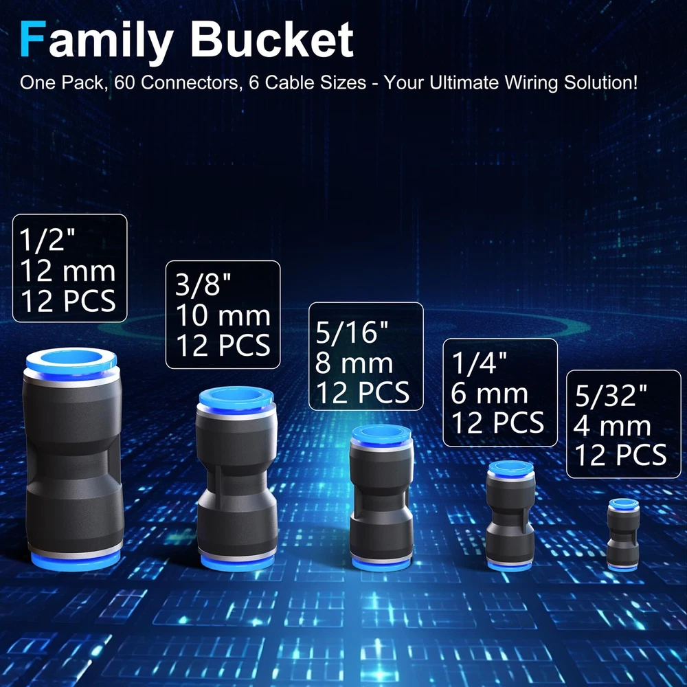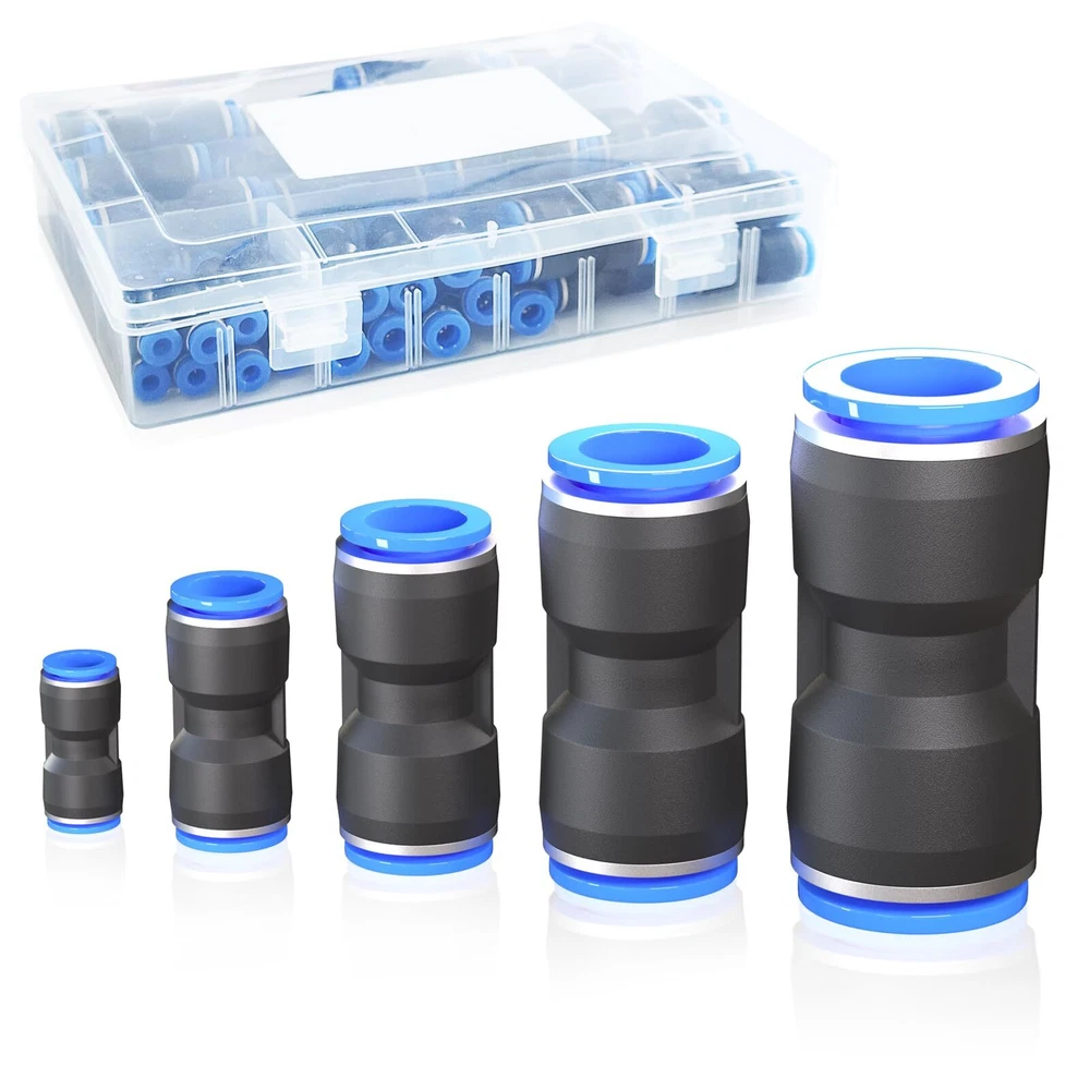 Push connect air fittings Description:This product is a high-performance air line quick connects, renowned for its quick connectivity and lightweight characteristics. Available in five different sizes, the air line push to connect fittings can be effortlessly integrated into your everyday lifestyle and professional work. The air push fitting is extensively used in refrigerator, truck, outdoor sprayer, ship deck, car repair. Quick connect air fittings Features: Lightweight and Strong: The air push is made of high-strength, wear-resistant premium plastic, ensuring a lightweight and long-lasting product. 360-Degree Rotating Cap Design: Quick release fitting Equipped with a high-quality cap that can rotate 360 degrees, it allows for the connection and disconnection of the air tube at any angle. Quick Installation: The pneumatic quick connect features a plug-and-play, quick-connect design. no tools are required. Push connect air fittings:Pneumatic quick connect Air push fitting Broad Application: The can be used as a hose connector for refrigerator, truck, ship, and car repair. Air line fittings Sizes: 5/32” (12 pcs), 1/4” (12 pcs), 5/16” (12 pcs), 3/8” (12 pcs), 1/2” (12 pcs) Pneumatic quick connect Compatible Hose Materials: PU/PA/PE/PVC Air push Medium: Air, water, steam (non-freezing) Air push fitting Color: Black and blue Quick connect air fittings Material: Plastic, stainless steel slot Push connect air fittings Shape: Straight Air line push to connect fittings Set: Five sizes, 60 pieces per box 🧰Lightweight Material and High Sealing:Straight Push Connectors,is constructed from high-strength, wear-resistant quality plastic on the outside,while the inside features stainless steel snap rings and a unique groove design.This provides an excellent balance of lightweight convenience,durability,and airtight sealing.With its anti-aging properties,air push fitting can withstand harsh environments without deforming or breaking. 🧰Versatility and Compatibility:Air line push to connect fittings comes in a variety of sizes to meet the needs of different equipment.Its universal interface design makes it compatible with a wide range of devices and various outer diameter air tubes.The interfaces at both ends of fit snugly,making it suitable for small household appliances and industrial work alike. 🧰360° Rotating Cap:Quick air connector fitting is equipped with a high-quality cap that rotates 360°,allowing you to connect and disconnect the air tube at any angle.This free-rotating design enhances work efficiency,reduces wear and tear on the air tube,and minimizes the risk of twisting or damage. 🧰1-Minute Quick Installation:Push to connect tube fittings kit employs a plug-and-play,quick-connect design.Simply insert the hose directly into the connectors at both ends for a secure connection.When you need to disassemble,just press the blue lock cap and pull it out.Air push quick connect simplifies the process of connecting hoses and reinstalling your equipment,saving you time and effort,and optimizing your workflow. 🧰Broadly Applicable Tool:With its quick-connect design,air line push connectors allows for rapid installation and replacement of air tubes.Its leak-proof design and wear-resistant high quality ensure stability and reliability.Pneumatic quick connect is suitable for everyday evices and industrial applications alike.It can be used with refrigerators,sprayers,small home fountains, trucks,outdoor sprinklers,automotive repair,and dental equipment.Experience the convenience and efficiency of quick air connector fitting today!