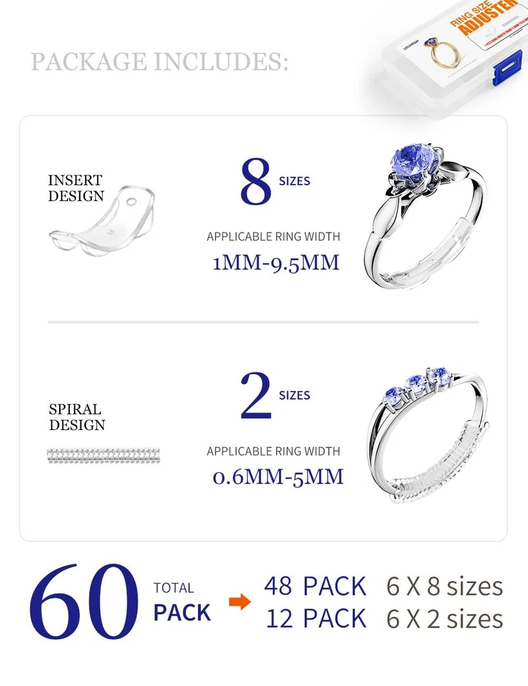Ring Size Adjuster for Loose Rings 60Pack 2 Styles Ring Guard Ring Sizer New Fit 95% Of Rings And Easy To Use:2 sizes in style 1(spiral design), 8 sizes in style 2(insert design), This Adjuster will make your ring smaller without resizing. Moreover, it fits both women and men rings. Material:Made of transparent soft TPU silicone, safe to touch the skin, almost invisible when used on the ring. Easy To Use.The bottom of the ring adjuster is wider than your ring and is pressed inside the ring, Suitable for men's and women's rings from 1mm-8mm in width. Easy To Clean: Wipes easily to remove dirt, oil and grease, preventing water and contaminant buildup. Package Includes: 12pcs ring size adjuster (spiral design), 48pcs ring adjuster pads (insert design), 1 x Ring Adjuster Organizer. Shipping We offer FREE shipping on all orders! We ship within Three business days of payment, usually sooner. We use a selection of shipping services such as UPS, FedEx, USPS etc. We only ship to the lower 48 states, no APO/FPO addresses or PO Boxes allowed. Local pickups and combined shipping options are not provided at this time. Return You can return a product for up to 30 days from the date you purchased it. Any product you return must be in the same condition you received it and in the original packaging. Please keep the receipt. Payment We accept payment by any of the following methods: PayPal Please pay as soon as possible after winning an auction, as that will allow us to post your item to you sooner! Feedback Customer satisfaction is very important to us. If you have any problem with your order, please contact us and we will do our best to make you satisfied. Contact Us If you have any queries, please contact us via ebay. We usually respond within 24 hours on weekdays. Please visit our eBay store to check out other items for sale! Thank you for shopping at our store.