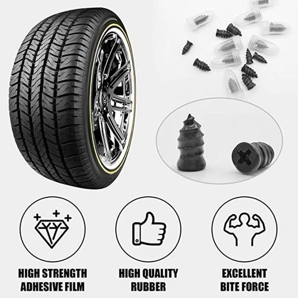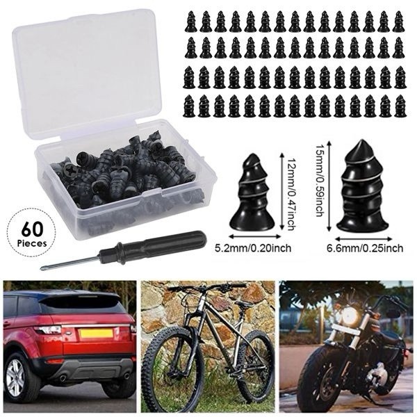 Product Feature: - Easy To Use: The simplest way to repair tires, Simply to insert the nail into the tire wound for a simple and efficient patching job. Repair your tire by yourself, and save your time. Emergency repair tools, easily repair punctures without removing the tire from the rim. - 2 Sizes: 60PCS total and we provide 2 sizes of tire repair nails for you, smaller one is approx. 5.3 x 12mm/0.2 x 0.47 inch and larger one is about 6.6 x 15mm/0.26 x 0.59 inch. - Premium Material and Good Seal: These rubber tire screws are made of high-quality materials rubber and iron, wear-resistant and durable. The middle thick thread can Effectively enhance the bite force between the screw and the tire, with a good sealing effect. - Easy Carrying: Compact package, easy for you to store and carry while traveling, driving, biking and so on. Repair tires by yourself! - Widely Application: These motorcycle tire repair tools have a wide range of usage, suitable for cars, mountain bikes, electric bikes, motorcycles, trucks, and other tubeless vehicles. Specification: Type: Tire Repair Kit Material: Rubber Small Size: about 0.2 x 0.47 inch Large Size: about 0.25 x 0.59 inch Package Included: 60 x Screw tire plugs 1 x Screwdiver