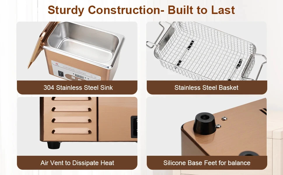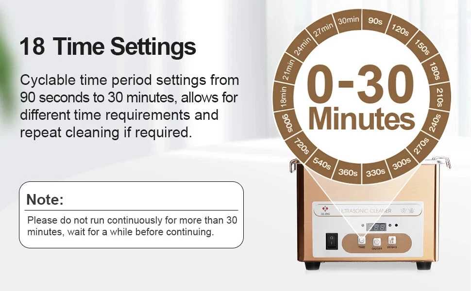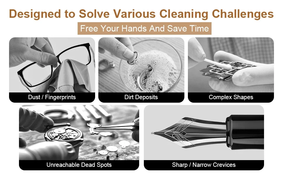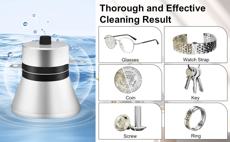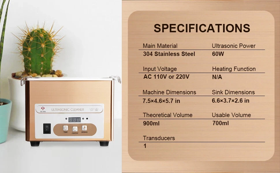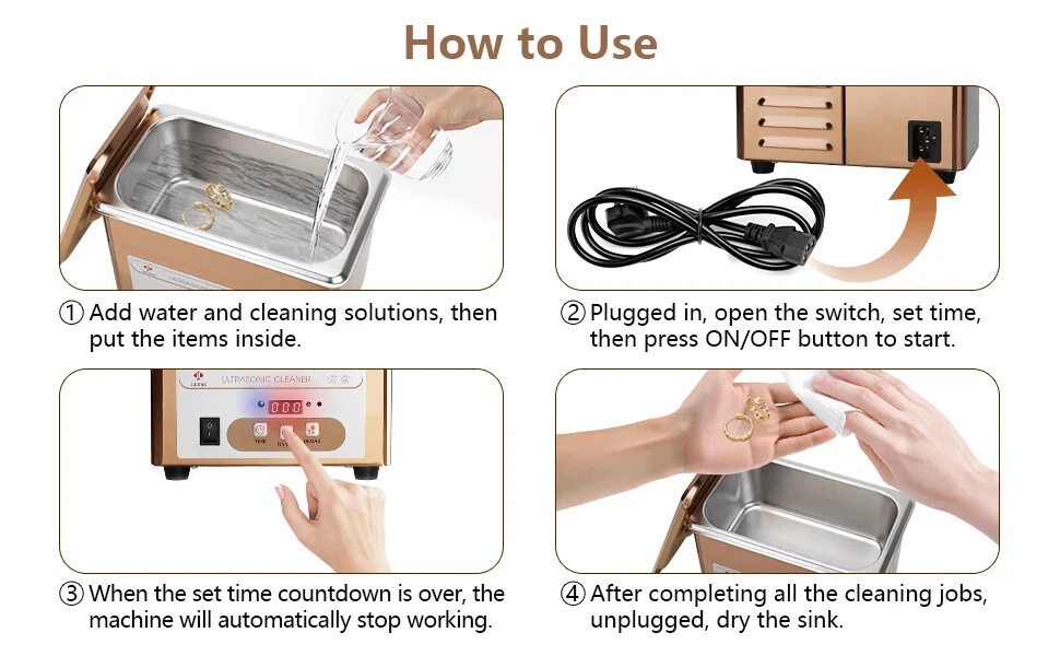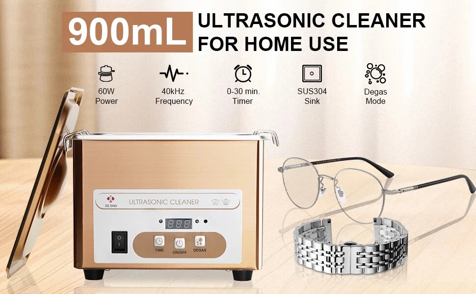 Item: 900ml Portable Ultrasonic Cleaner With Basket for Jewelry Glasses Small Parts etc Key Features: 1. Compact size 900ml ultrasonic jewelry cleaner machine for home use or carrying out. It can contain small items which are are smaller than 6.6×3.7×2.6 inches. With this, you can do a professional ultrasonic cleaning job at home or at a wedding. 2. The ultrasonic cleaning tub is made of stainless steel, which is more sturdy than plastic machine, has a long service life. SUS304 stainless steel tank can resistant to weak acids and alkalis. 3. This mini ultrasonic cleaner can widely used for cleaning small objects such as gold / silver jewelry, watch parts, ring, coin, glasses (smaller than 6.6 inches), fountain pen parts, 3D printed parts, bike chains, small tools etc. 4. Ultrasonic cleanser does a fast, effective and pratical cleaning job. 40kHz high frequency and 60W power vibration can effectively penetrate tiny crevices and blind holes, thoroughly clean objects with complex construction or irregular shapes. 5. The ultrasonic washing machine is easy to use, comes with 18 time settings (90 s~30 mins) to meet your different cleaning needs. With just water and cleaning solution, the jewelry cleaner machine will give you a sparkling item like brand new. Also come with degas function, which can remove air bubbles generated during working so as to achieve a better cleaning effect. 6. The ultrasonic bath come with a metal basket, can protect your small stuffs from scratches, is convenient to remove the cleaned item from the bath. (not a must to use) Specifications Main Material: stainless steel Input: AC 100V-120V or 220-240V Ultrasonic Frequency: 40kHz Ultrasonic Power: 60W Full Bathtub Capacity: 0.9 liters Effective Capacity: approx 700ml Bathtub Thickness: 1mm Bathtub Dimensions: 6.6×3.7×2.6 inches (L× W× D) Basket Dimensions: 6.1 × 3.4 × 1.5 inches (L× W× D) Operation: digital control panel Working Time: 90 seconds-30 minutes Heating Function: no Note: 1. There's no heating function for this small device, so it can not heat to dewax and degrease. But you can fill with warm water ( about 40-60℃)to achieve a better cleaning effect. 2. This sonic jewelry cleaner machine is not suitable for soft stones like pearl. For expensive jewelry, please consult your local jewelry store for professional advice before cleaning. Package Includes: 1 x Ultrasonic Cleaner 1 x Stainless Steel Lid 1 x Stainless Steel Basket 1 x Ball Filter 1 x Power Cord 1 x User Manual