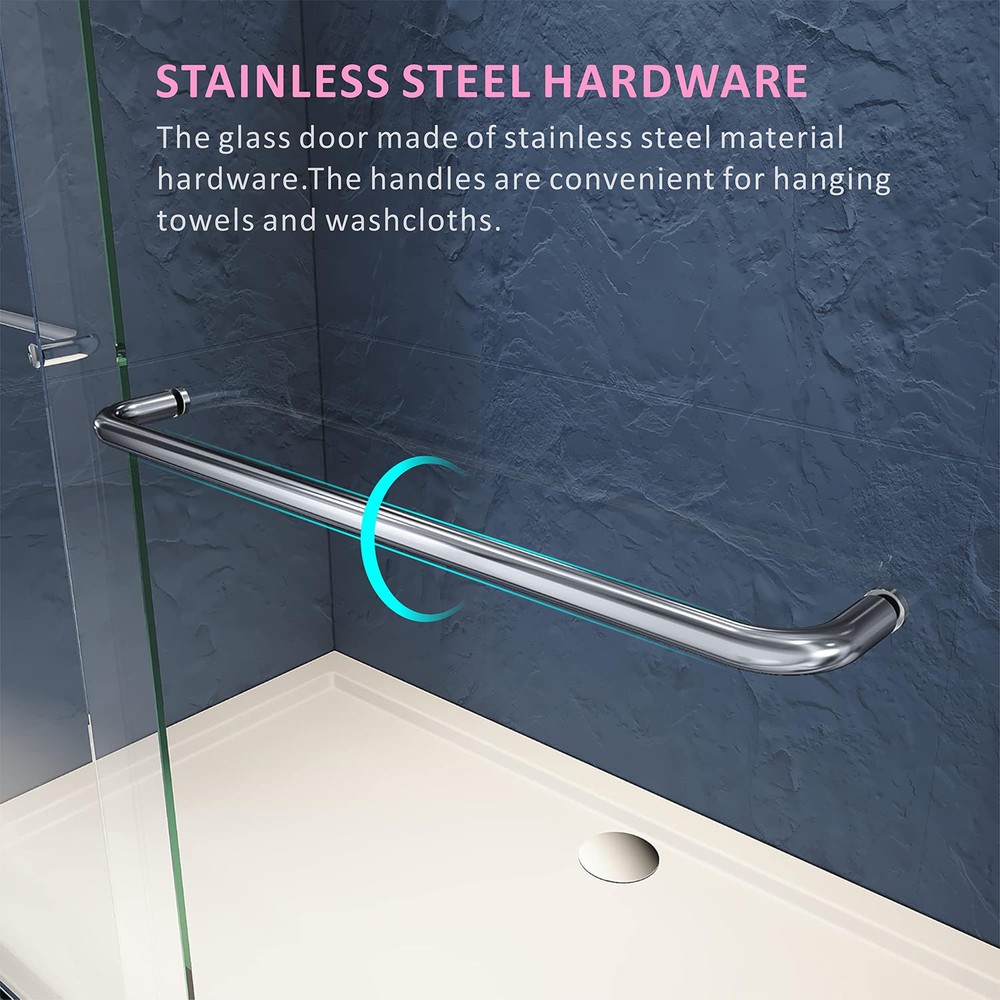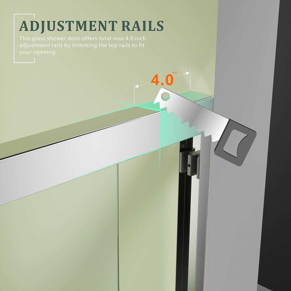 Double Sliding Glass Door for Shower Design The 56-60''x 57'' tub shower door frameless allows you to use either on the left or right door to access the tub, a space-saving solution. Hardware Finish:Chrome. High-quality Accessories All the hardware of this tub chrome sliding door for bathroom is high-quality stainless steel, including 2 large solid rollers, 2 handles and thickened top track. High-quality stainless steel hardware ensures smooth, durable and rust-proof. Built-in rollers, tested for 100,000 times for durability, ensure your tub chrome glass door for shower slides smoothly, quietly and durable. The stainless steel handle can be used as a towel rack, provide a place to hang clothes and towels. Adjustable Width The top rail can be trimmed 4 inches for width adjustment (56-60 inches) by cuting the top and bottom rais. Our bathtub shower door frameless are designed to fit most standard tubs and provide a sleek, seamless appearance. Upgrade your bathroom with a stylish sliding door for bathroom that combines appearance and function. Safety Tempered Glass The tub chrome glass door for shower is designed with SGCC/ANSI-certified 1/4" (6mm) thickened clear tempered panel, which not only creates a spacious and open feeling, but also effectively resists damage. Durable and easy to maintain, it can resist shower water and soap dirt. Easy to install The illustruction and all the necessary installation accessories are in the package, easy to install. Due to the heavy glass, the shower door frameless is recommend to be installed by two professional people. DURABLE TEMPERED GLASS CHROME GLASS SHOWER DOOR ENJOY YOUR CLEAN SHOWER TIME ADVANCED DETAILS DESIGN As a professional bathroom product manufacturer, we always provide you with better products and more efficient services, but the following service terms need to be known to you: 1: If you find some problems with the product after receiving the goods, please do not discard the product, because we need you to provide pictures or videos of the relevant faults to better serve you. 2: Please note that we do not bear the installation/assembly costs. If you find a fault during the installation of the product, we will not bear or reimburse this cost because we stipulate that all parts must be checked before booking. 3: Delivery within the United States only, excluding Alaska/Hawaii, Puerto Rico, Guam, Saipan, APO/FPO, US Protectorates and PP Box. Usually the delivery time is 1 to 7 business days. If you still have not received the goods after 7 business days, please contact us immediately and we will track the order for you. 4: If your goods are damaged when delivered, you must refuse the order and describe the damage on the receipt. Just fill in "the goods are damaged". If you accept the goods and the damage is not noted on the receipt, we reserve the right not to refund or replace your goods. If you are not satisfied with your purchase, please contact us within 7 days. Please note that there is a 20% restocking fee and all shipping and handling charges are the responsibility of the buyer.