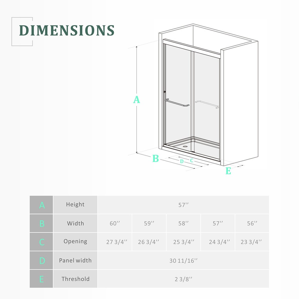 Double Sliding Framed Shower Door Design The 56-60''x 57'' tub door with glass allows you to use either on the left or right door to access the tub, a space-saving solution. Hardware Finish:Chrome. Adjustable Width The top rail can be trimmed 4 inches for width adjustment (56-60 inches) by cuting the top and bottom rais. Our bathtub chrome door with glass are designed to fit most standard tubs and provide a sleek, seamless appearance. Upgrade your bathroom with a stylish double sliding door that combines appearance and function. Safety Tempered Glass The tub chrome framed shower door is designed with SGCC/ANSI-certified 1/4" (6mm) thickened clear tempered panel, which not only creates a spacious and open feeling, but also effectively resists damage. Durable and easy to maintain, it can resist shower water and soap dirt. High-quality Accessories All the hardware of this tub door with glass is high-quality stainless steel, including 2 large solid rollers, 2 handles and thickened top track. High-quality stainless steel hardware ensures smooth, durable and rust-proof. Built-in rollers, tested for 100,000 times for durability, ensure your tub chrome double sliding door slides smoothly, quietly and durable. The stainless steel handle can be used as a towel rack, provide a place to hang clothes and towels. Easy to install The illustruction and all the necessary installation accessories are in the package, easy to install. Due to the heavy glass, the framed shower door is recommend to be installed by two professional people. CHROME GLASS SHOWER DOOR DURABLE TEMPERED GLASS ENJOY YOUR CLEAN SHOWER TIME ADVANCED DETAILS DESIGN As a professional bathroom product manufacturer, we always provide you with better products and more efficient services, but the following service terms need to be known to you: 1: If you find some problems with the product after receiving the goods, please do not discard the product, because we need you to provide pictures or videos of the relevant faults to better serve you. 2: Please note that we do not bear the installation/assembly costs. If you find a fault during the installation of the product, we will not bear or reimburse this cost because we stipulate that all parts must be checked before booking. 3: Delivery within the United States only, excluding Alaska/Hawaii, Puerto Rico, Guam, Saipan, APO/FPO, US Protectorates and PP Box. Usually the delivery time is 1 to 7 business days. If you still have not received the goods after 7 business days, please contact us immediately and we will track the order for you. 4: If your goods are damaged when delivered, you must refuse the order and describe the damage on the receipt. Just fill in "the goods are damaged". If you accept the goods and the damage is not noted on the receipt, we reserve the right not to refund or replace your goods. If you are not satisfied with your purchase, please contact us within 7 days. Please note that there is a 20% restocking fee and all shipping and handling charges are the responsibility of the buyer.