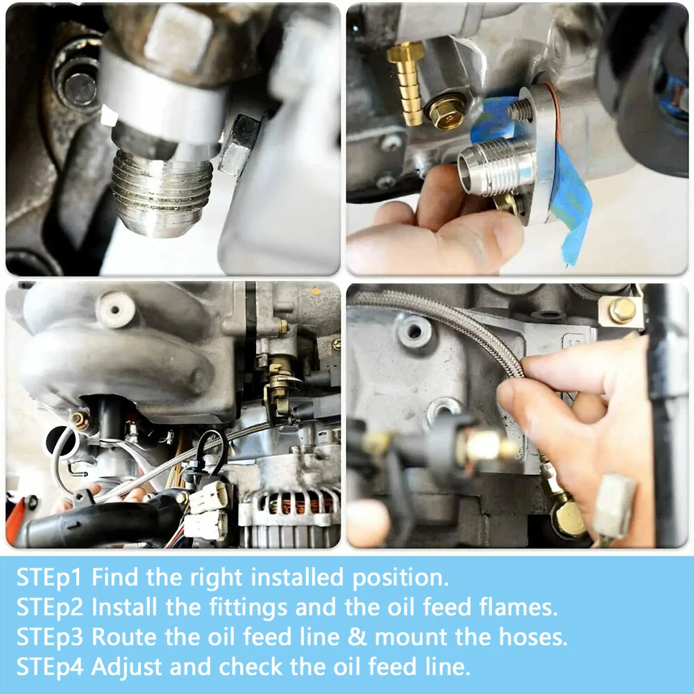 60inch Length 4AN Remote Turbocharger Sensor Steel Braided Turbo Oil Feed Line Function This steel braided turbo oil feed line connects your turbo chargers oil gallery to the engine, it drains the oil away from the bearings inside the turbo charger. Material Made of heavy duty steel for great reliability and long service life; Manufactured to specification, meet or even exceed standard in function, performance and quality. Features This line is 60 inches length, and the hose end is 4AN(0.4375” OD), comes with 1 Straight End and 1 90 Degree End. Package included 1 * 4AN hose.