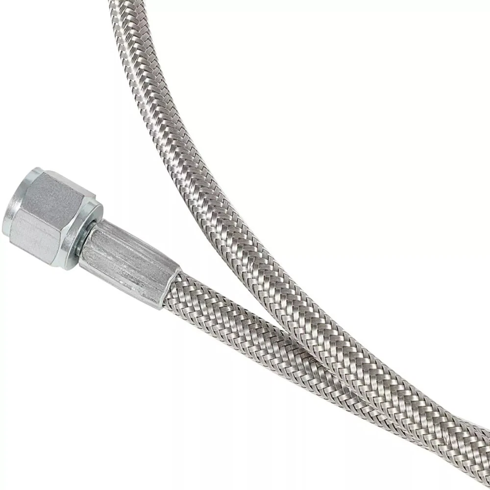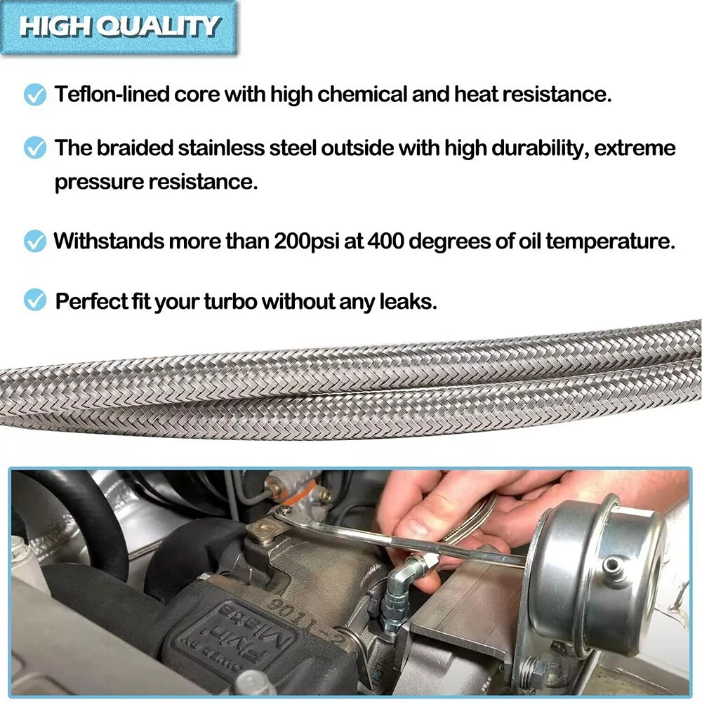 60inch Length 4AN Remote Turbocharger Sensor Steel Braided Turbo Oil Feed Line Function This steel braided turbo oil feed line connects your turbo chargers oil gallery to the engine, it drains the oil away from the bearings inside the turbo charger. Material Made of heavy duty steel for great reliability and long service life; Manufactured to specification, meet or even exceed standard in function, performance and quality. Features This line is 60 inches length, and the hose end is 4AN(0.4375” OD), comes with 1 Straight End and 1 90 Degree End. Package included 1 * 4AN hose.