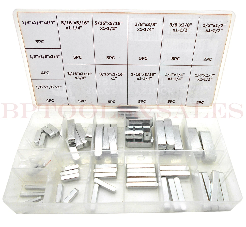 Untitled Document 60 Pc. Keystock Assortment Set (SAE) Features: Heat treated & zinc plated steel. Assortment of keys to lock pulleys, gear, sprockets to shafts with slotted keyways. Comes in handy plastic storage case. Contents: 4 Pc - 1/8" x 1/8" x 3/4" 4 Pc - 1/8" x 1/8" x 1" 5 Pc - 3/16" x 3/16" x 3/4" 5 Pc - 3/16" x 3/16" x 1" 5 Pc - 3/16" x 3/16" x 1-1/4" 5 Pc - 1/4" x 1/4" x 3/4" 5 Pc - 1/4" x 1/4" x 1-1/4" 5 Pc - 1/4" x 1/4" x 1/2" 5 Pc - 5/16" x 5/16" x 1-1/4" 5 Pc - 5/16" x 5/16" x 1-1/2" 5 Pc - 3/8" x 3/8" x 1-1/4" 5 Pc - 3/8" x 3/8" x 1/2" 2 Pc - 1/2" x 1/2" x 1-1/2" Payment Method Paypal is the only form of payment accepted. Payment is expected within 7 days of purchase or wining bid. Shipping Information Shipping is available for the following: United States, Canada, Hawaii, Puerto Rico. International shipping is available, shipping costs may vary. All orders are usually shipped the same day after purchase and payment is received Most likely 1 business day after purchase Mon-Fri. Tracking number will be updated to the order after item has been shipped. Terms of Sale We stand behind every product we sell. If there's anything wrong with the item you received, please contact us. No questions asked! You may return the product within 30 days of receipt for a complete refund. Return shipping is the responsibility of the buyer, buyer is responsible for all return shipping costs. Item must be returned in new condition, as received with all accompanied accessories and literature. Buyer assumes all risk of liability with respect to the purchase and use of the product/item. All of our pictures are photos of actual items. Customer Service For help with your order or if you have any questions regarding our products. Please contact us through eBay's internal message system. All messages are answered within 24hrs, 7 days a week. Feedback will be posted right away after product has been shipped. Positive feedback is expected after item has been received. We pride ourselves on making sure each and every customer is satisfied after the sale is complete. If there are any issues or problems please send us a message and we will do our best to resolve the issue before leaving us any negative or neutral feedback. Were here to guarantee complete customer satisfaction. bptools_n_sales