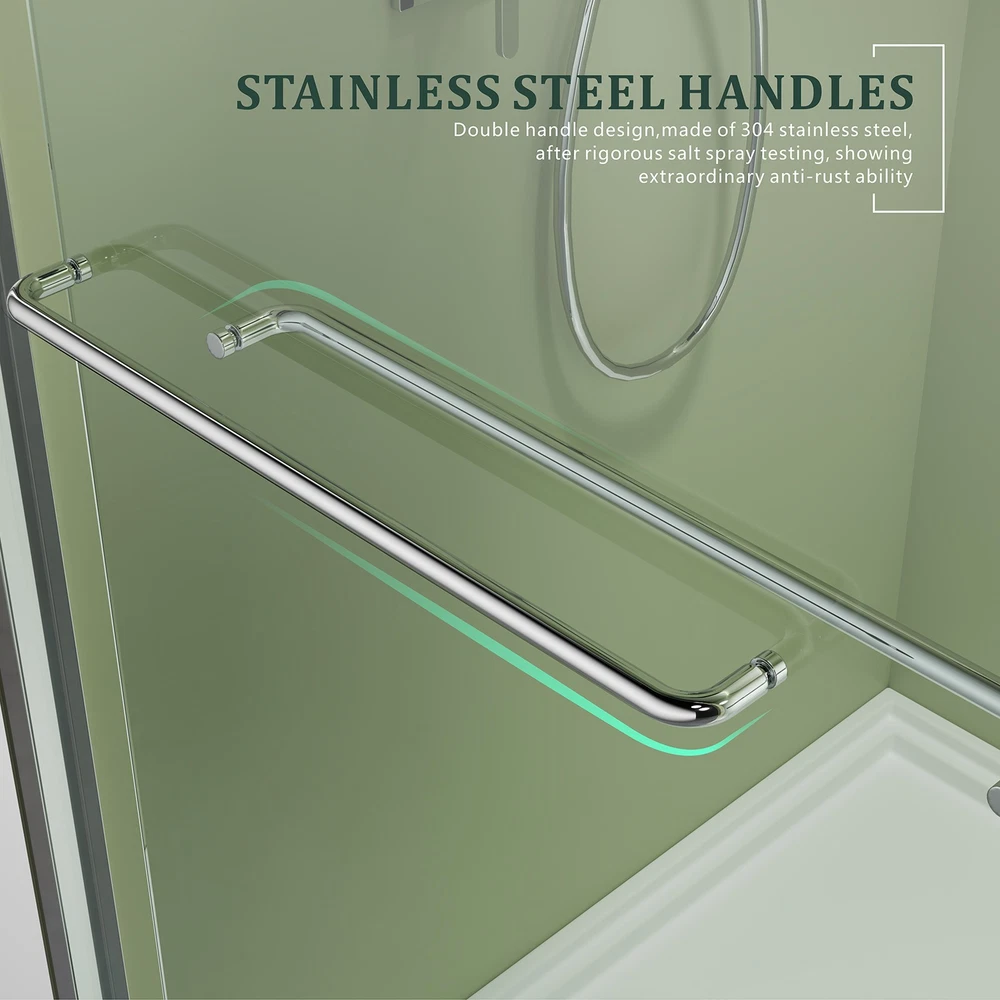 Framed Bathroom Door Dimension 60''W x 72''H. Width Adjustment: 56'' to 60'', cutting the top and bottom rail track to fit your size. Hardware Finish: Chrome. Please make sure your bathroom fits this size before shipping, if not you can choose other sizes in our store. Tempered Glass Bathroom dual sliding shower doors with 1/4 in. (6mm) tempered safety glass - ANSI and SGCC certified, easy to clean and maintain. Double Sliding Design Built-in silent copper rollers make the double sliding glass shower door slide smoothly and quietly. This chrome framed bathroom door is made of aluminum, long lasting and durable. Humanized Design This bathroom dual sliding shower door have two handles, so makes it easier to access the chrome double sliding glass shower door and provides convenient space for hanging towels and clothes. Easy Assembly The chrome framed bathroom door can be installed on the left or right, with an illustrated instruction and all necessary fixings supplied, easy to install. Due to the heavy glass, the bathroom dual sliding shower doors is recommend to be installed by two professional people. CHROME GLASS SHOWER DOOR ENJOY YOUR CLEAN SHOWER TIME ADVANCED DETAILS DESIGN As a professional bathroom product manufacturer, we always provide you with better products and more efficient services, but the following service terms need to be known to you: 1: If you find some problems with the product after receiving the goods, please do not discard the product, because we need you to provide pictures or videos of the relevant faults to better serve you. 2: Please note that we do not bear the installation/assembly costs. If you find a fault during the installation of the product, we will not bear or reimburse this cost because we stipulate that all parts must be checked before booking. 3: Delivery within the United States only, excluding Alaska/Hawaii, Puerto Rico, Guam, Saipan, APO/FPO, US Protectorates and PP Box. Usually the delivery time is 1 to 7 business days. If you still have not received the goods after 7 business days, please contact us immediately and we will track the order for you. 4: If your goods are damaged when delivered, you must refuse the order and describe the damage on the receipt. Just fill in "the goods are damaged". If you accept the goods and the damage is not noted on the receipt, we reserve the right not to refund or replace your goods. If you are not satisfied with your purchase, please contact us within 7 days. Please note that there is a 20% restocking fee and all shipping and handling charges are the responsibility of the buyer.
