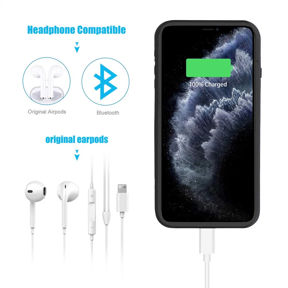 1.This battery case is specially designed for iPhone, compatible for Apple Lightning Headphones, excellent for enjoying music or making phone call while your phone is charging. The powerful 5000mAh built-in li-thium polymer battery can provide extra battery life for your phone. Built-in short circuit and overcharge protection. 2.Magnetic top design, much easier to install/remove your phone from case. No excessive bulk at the bottom of your phone making it easier to hold and reach the upper part of the screen, it is convenient enough to fit easily in your hand or in your pocket. 3.Charge and sync your mobile phone to computer without removing it from the charging case, compatible for original lightning charging cable. Built-in intelligent control chip, which can charge your phone fullly first, then it will charge the battery case automatically. (Please turn on the case during charging) 4.Integrated Power Switch allows you to switch the battery case on & off, use the battery only when you need it. 4 LED battery level indicator that lets you know exactly how much power left. (0--25%--50%--75%--100%) About this Battery Case: Slim, lightweight and compact design for portability. High capaticy rechargeable battery provides battery life when needed. Indicate with 4 level indicate light to let you know how much power left . Precise cutout allow easy access to all ports, switches and buttons. Can be used for data transfer, charger and data sync at the same time Safety with highest industry regulatory certificates: CE, RoHS, and FCC. Package included: 1 x iPhone Battery Case 1 x user manual