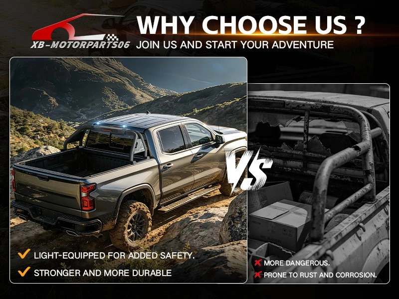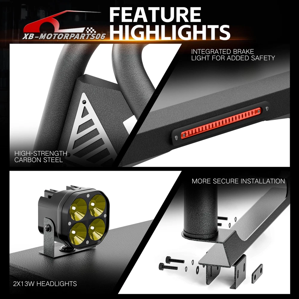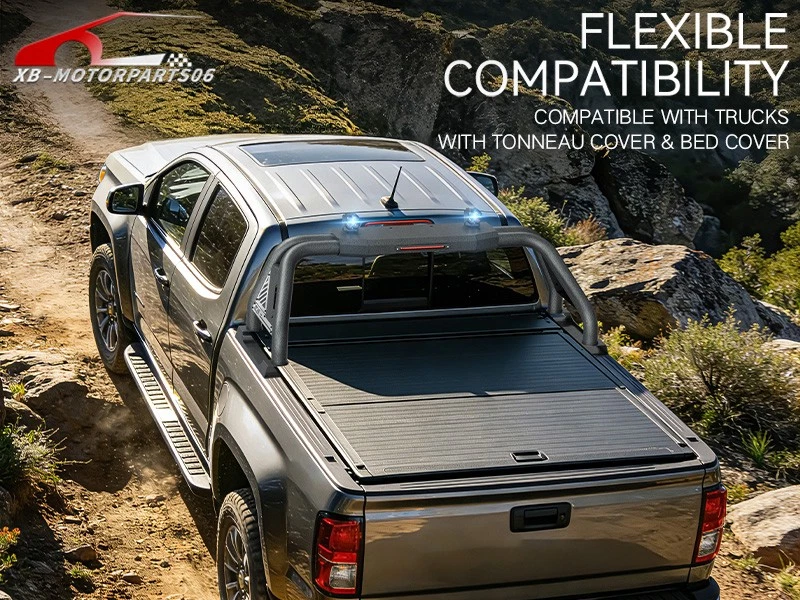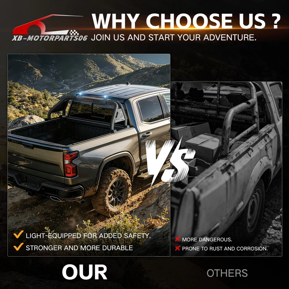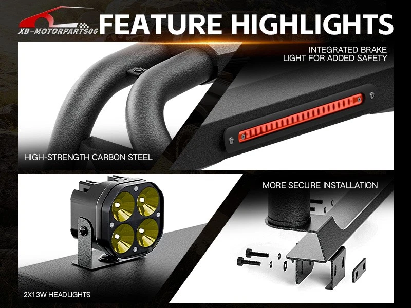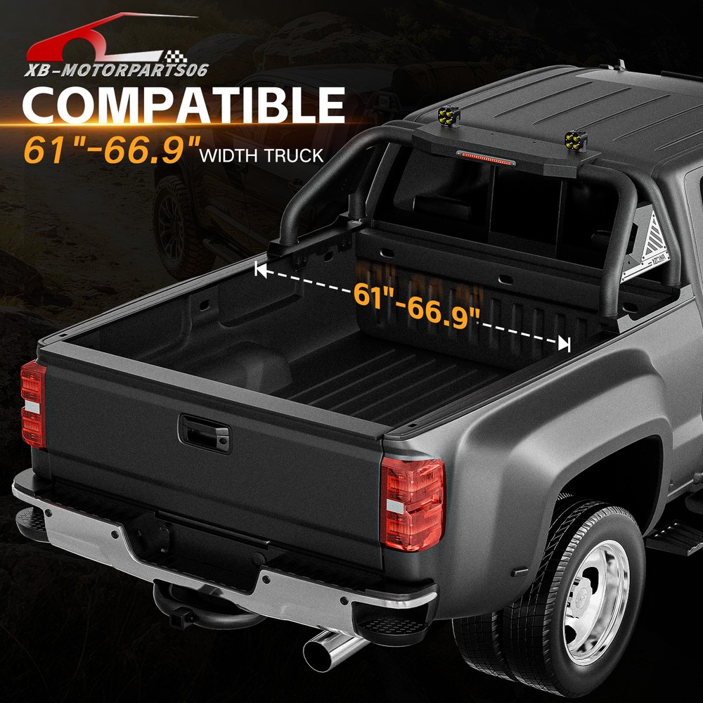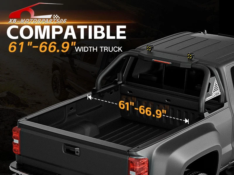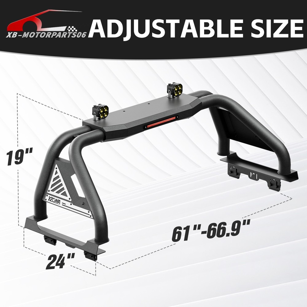 61''-66.9'' Adjustable Truck Bed Sport Roll Bar For Tundra/Ram/Frontier/F-Series For safety reasons, we strongly recommend that you seek professional installation services Regularly check the rack hardware for looseness before driving to ensure cargo safety. Suitable Models : fit for the truck width bed range of 61" to 66.9". Fit for Toyota Tundra, Ford F150/F250/F350, Dodge Ram 1500/2500/3500, Titan, Frontier, etc. ( Compatible with Trucks with Tonneau Cover & Bed Cover. ) Package Includes : 1 x Roll Bar with brake light bar, mounting hardwares, 1 x Include instructions. Product Information: Package Dimensions: 49.61 × 21.65 × 7.48 inches Installation mode: bolt-on Placement on Vehice: Rear Item Weight: 61.60 pounds Material: Carbon Steel Color: Black (hand measurements may have an error of 2-3 mm/0.078-0.118 in) Feature : ① Made from heavy-duty carbon steel, this roll bar is built for durability and strength. The black powder-coated finish enhances corrosion resistance, ensuring long-lasting performance; ② The roll bar features an adjustable width range of 61” to 66.9”, with a fixed height of 19”, allowing for a perfect fit across different truck bed sizes; ③ Equipped with a brake light bar and two high-quality LED lights, this roll bar enhances visibility for nighttime driving, off-road adventures, and worksite illumination. The extension harness for connecting the LED needs to be purchased separately ; ④ Features a bolt-on, no-drill installation process, requiring no cutting or modifications. The package includes all necessary mounting hardware and instructions for a quick and easy setup; Warranty Period : 1 year Standard Shipping (FedEx Ground or FedEx Home Delivery) Will usually ship within 3 business days of receiving cleared payment For safety reasons, we strongly recommend that you seek professional installation services Regularly check the rack hardware for looseness before driving to ensure cargo safety. Suitable Models : fit for the truck width bed range of 61" to 66.9". Fit for Toyota Tundra, Ford F150/F250/F350, Dodge Ram 1500/2500/3500, Titan, Frontier, etc. ( Compatible with Trucks with Tonneau Cover & Bed Cover. ) Package Includes : 1 x Roll Bar with brake light bar, mounting hardwares, 1 x Include instructions. Product Information: Package Dimensions: 49.61 × 21.65 × 7.48 inches Installation mode: bolt-on Placement on Vehice: Rear Item Weight: 61.60 pounds Material: Carbon Steel Color: Black (hand measurements may have an error of 2-3 mm/0.078-0.118 in) Feature : ① Made from heavy-duty carbon steel, this roll bar is built for durability and strength. The black powder-coated finish enhances corrosion resistance, ensuring long-lasting performance; ② The roll bar features an adjustable width range of 61” to 66.9”, with a fixed height of 19”, allowing for a perfect fit across different truck bed sizes; ③ Equipped with a brake light bar and two high-quality LED lights, this roll bar enhances visibility for nighttime driving, off-road adventures, and worksite illumination. The extension harness for connecting the LED needs to be purchased separately ; ④ Features a bolt-on, no-drill installation process, requiring no cutting or modifications. The package includes all necessary mounting hardware and instructions for a quick and easy setup; Warranty Period : 1 year