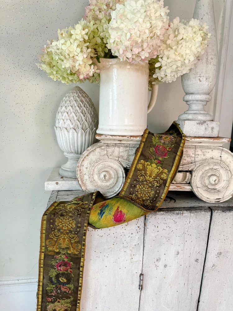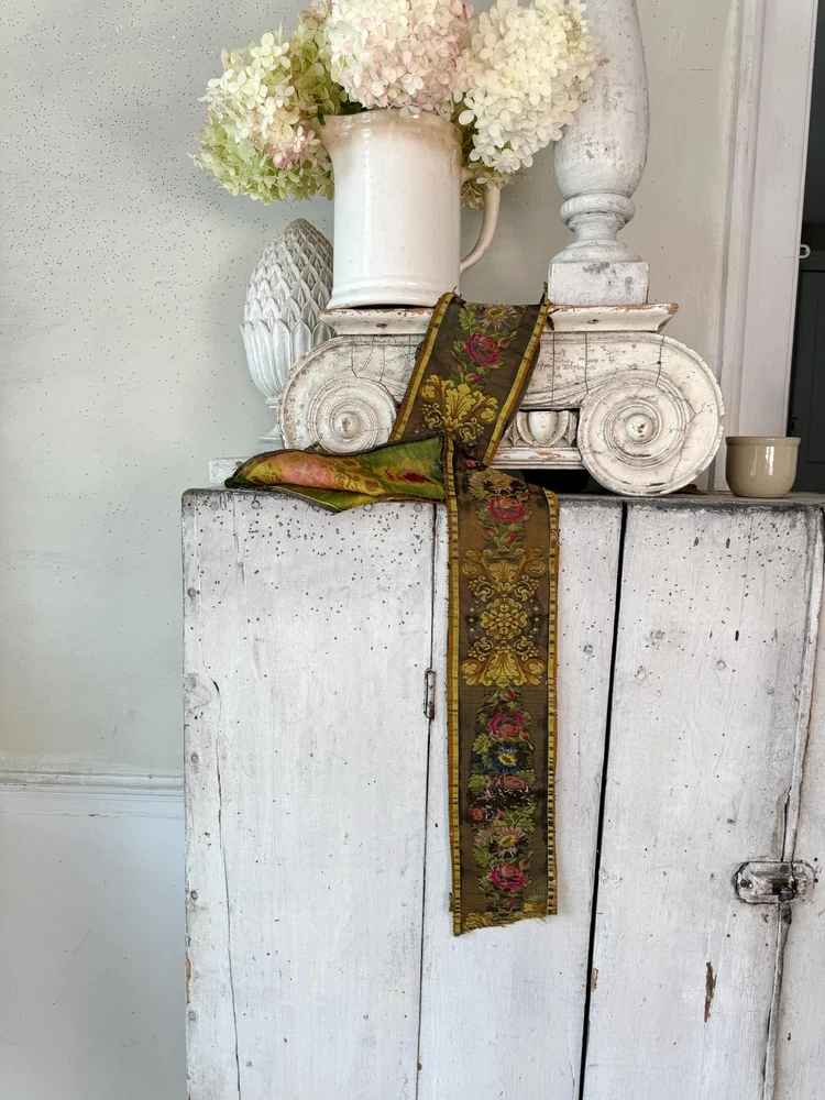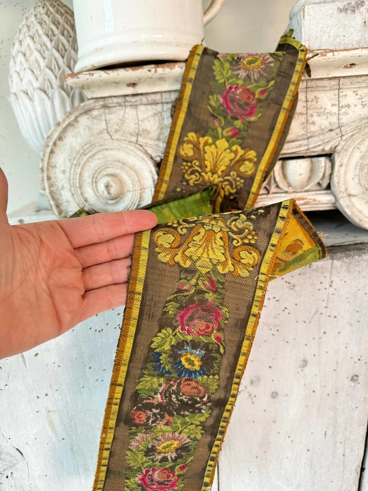 Welcome to the Textile Trunk! Please follow us on Instagram, we are @textiletrunk ! ~ A timeworn treasure! This brocade silk is a border dating from the 19th century ~ It's beautifully worn so this trim is ideal only for projects that require an aged fabric~ it's LOVELY and would add so much charm to any interior! I have another piece of this lovely trim, to view simply search my store for the words " timeworn brocade trim " Measurements : This lovely trim measures approximately 62 inches by 4 ~ CONDITION: This trim is in as found, not cleaned condition . There is uneven wear on this piece!! The side edges are worn and some of the silk threads are also! A timeworn beauty! Inventory : Shelf 4, 9902